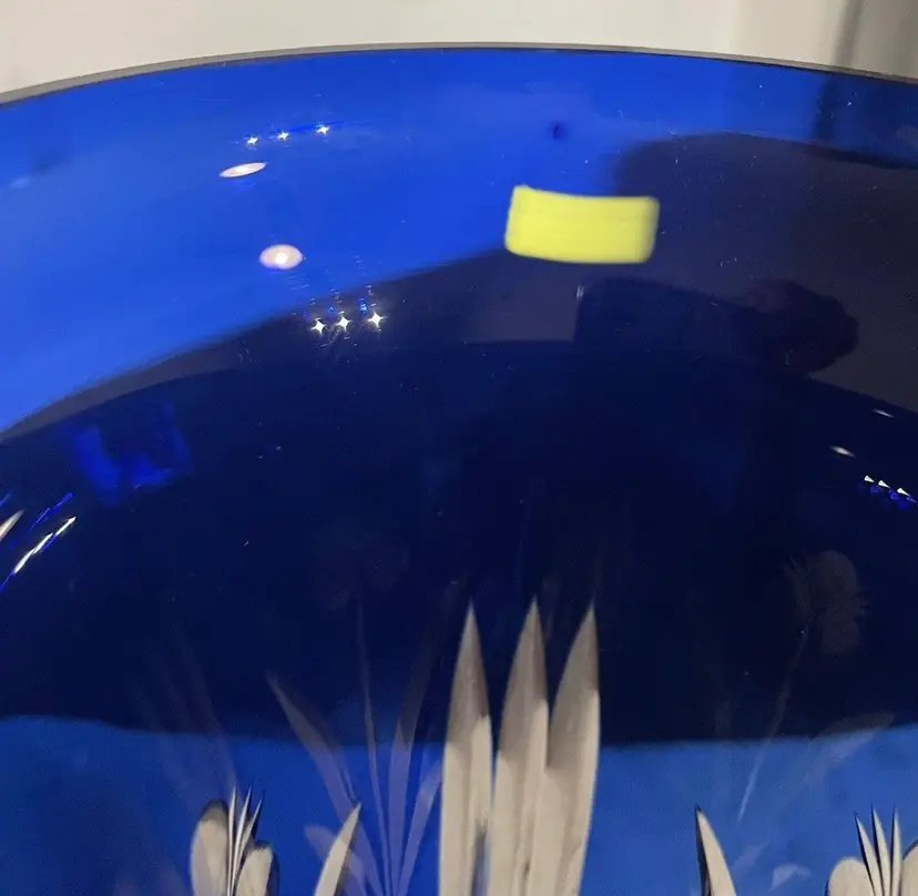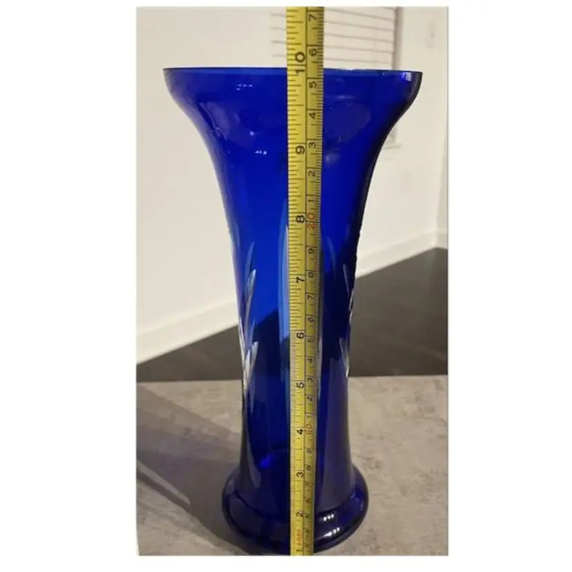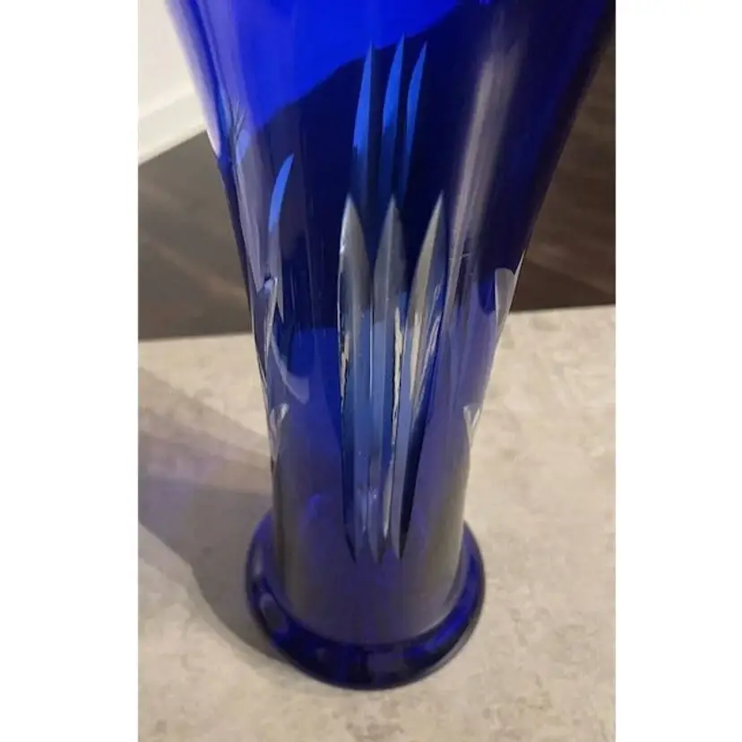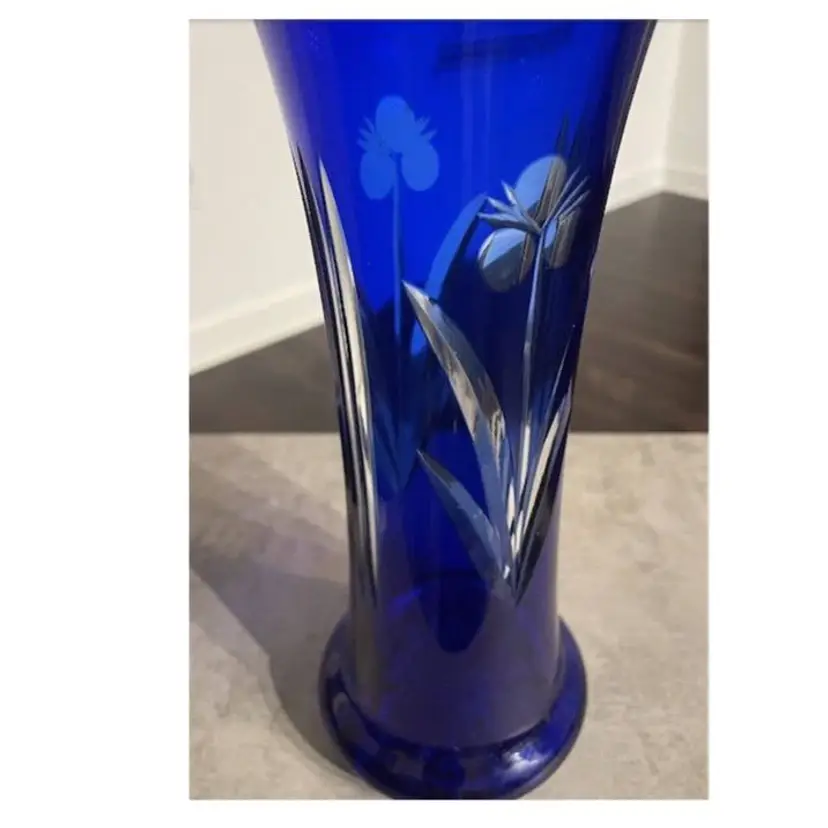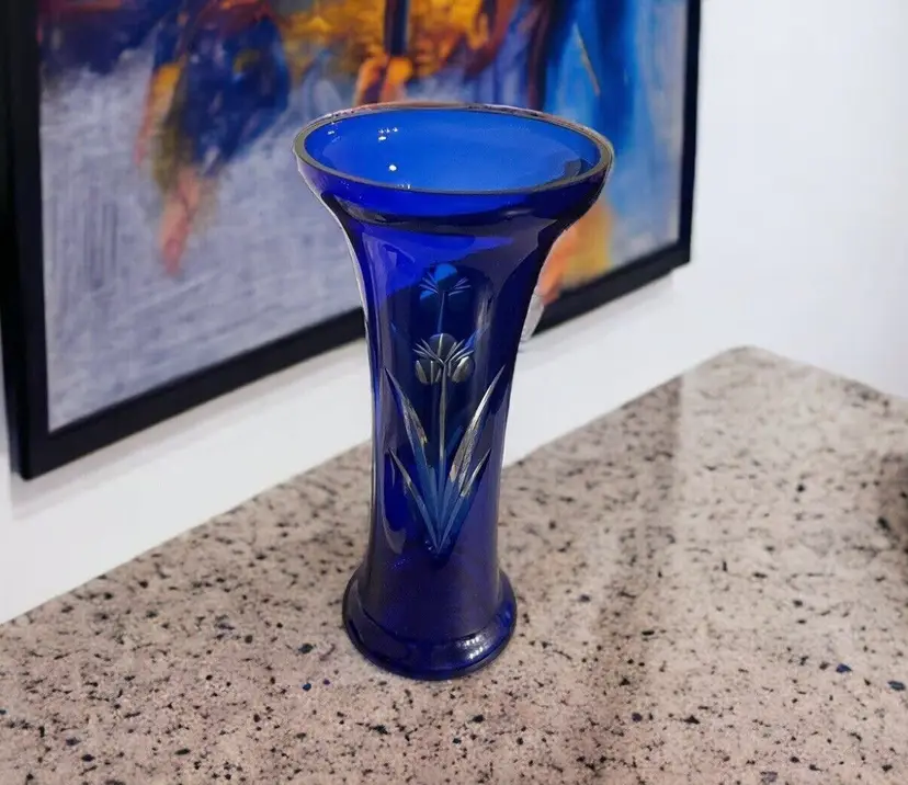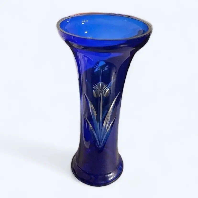 The handmade cobalt blue clear to cut vase and is believed to be “Badash” Crystal, it’s a round shape with an etched glassmaking technique etched with floral patterns & lines