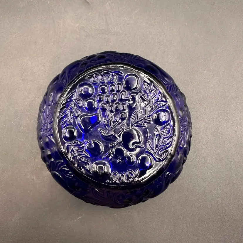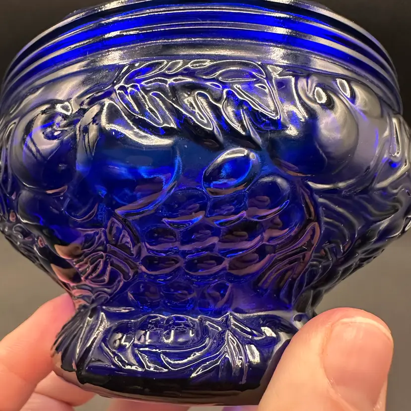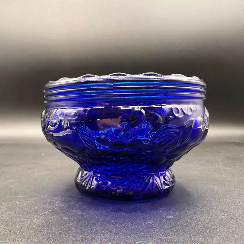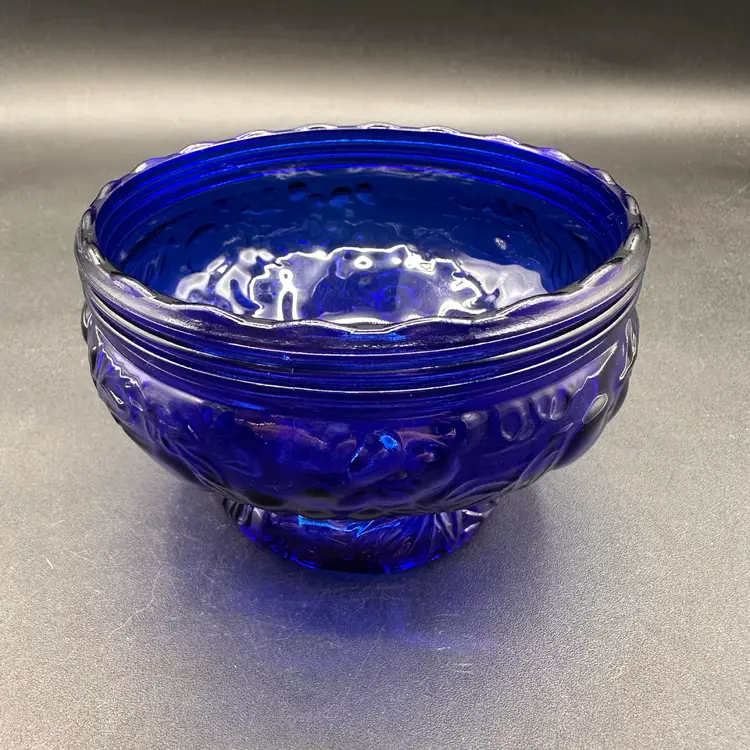 Gorgeous!! I am in love with the soft scalloped top and the rimmed edge and then these big, bold fruit and vines shapes make it special! No chips or cracks, excellent condition.