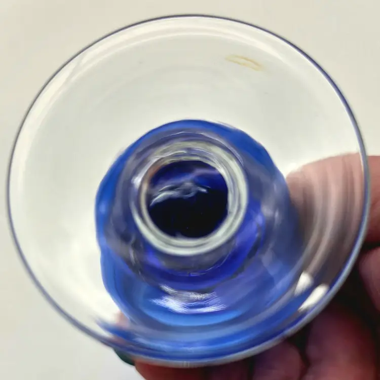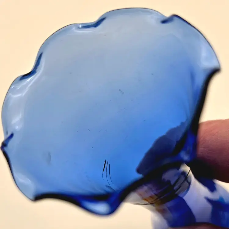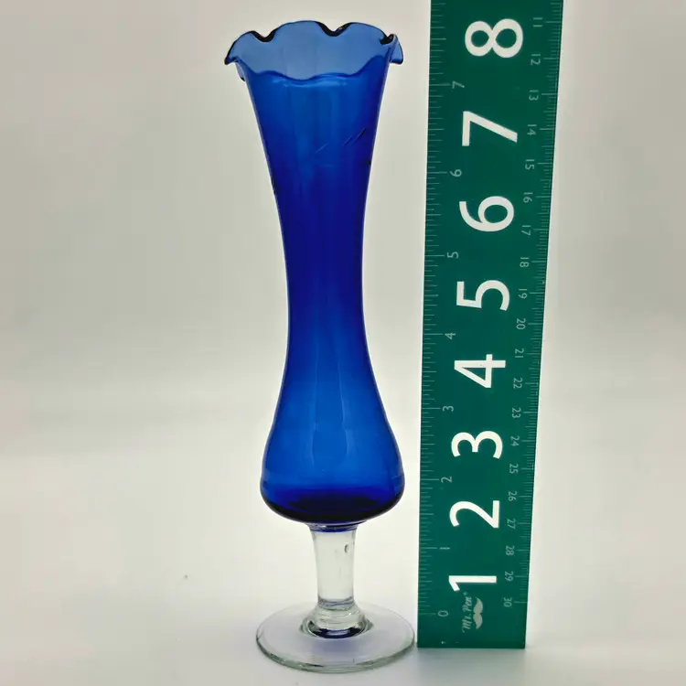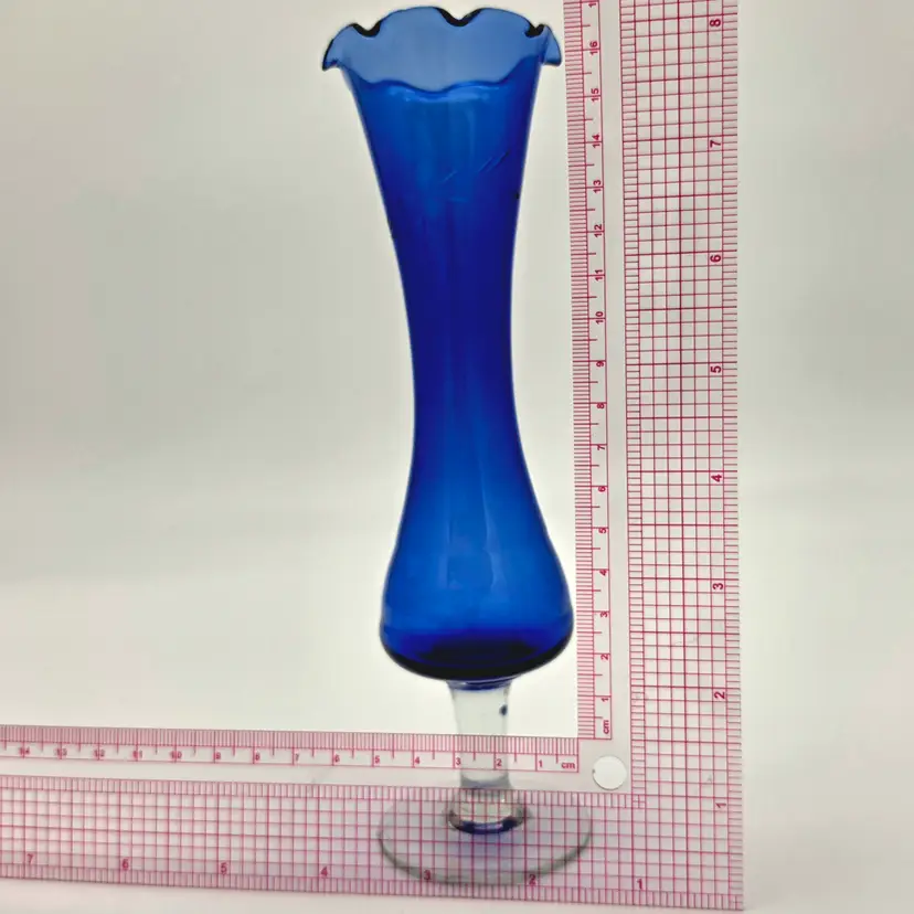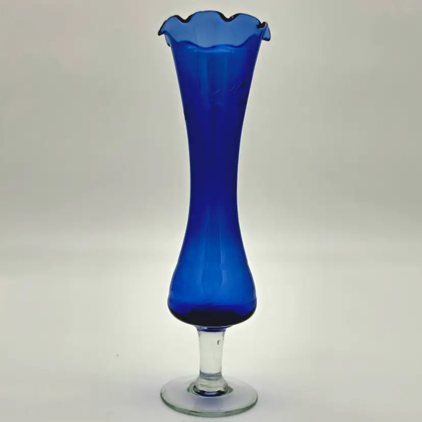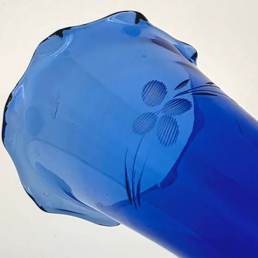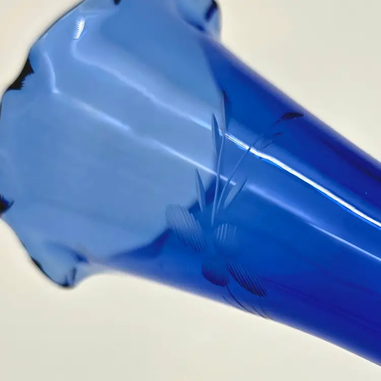 This striking vintage bud vase is crafted from deep cobalt blue glass, featuring a beautiful hand-etched floral design. The elegant scalloped "tulip" rim and flared body give it a classic, mid-century silhouette that catches the light beautifully.