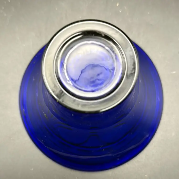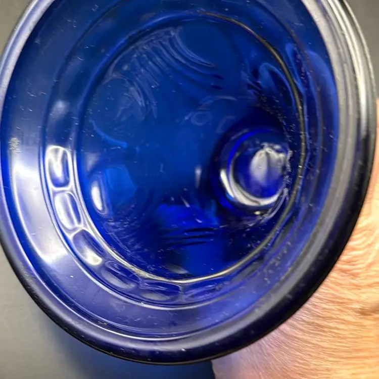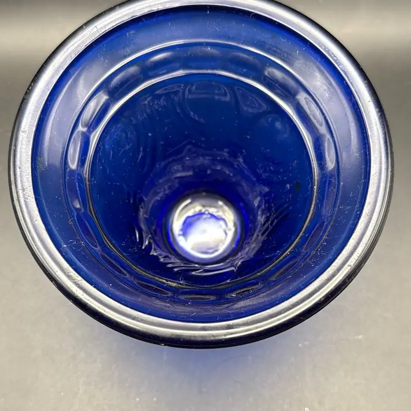 This unique cobalt blue glass piece is 3 3/4 in high by 4 3/4 wide at the mouth.