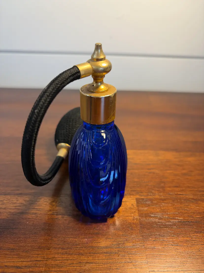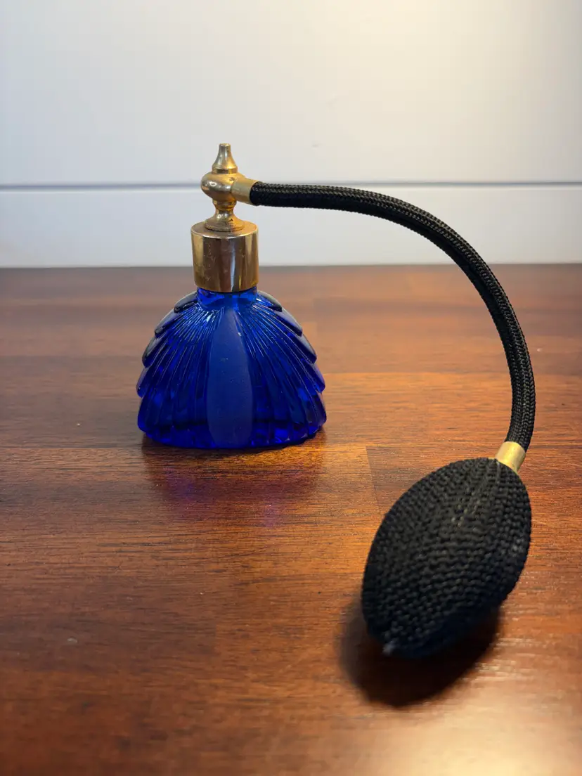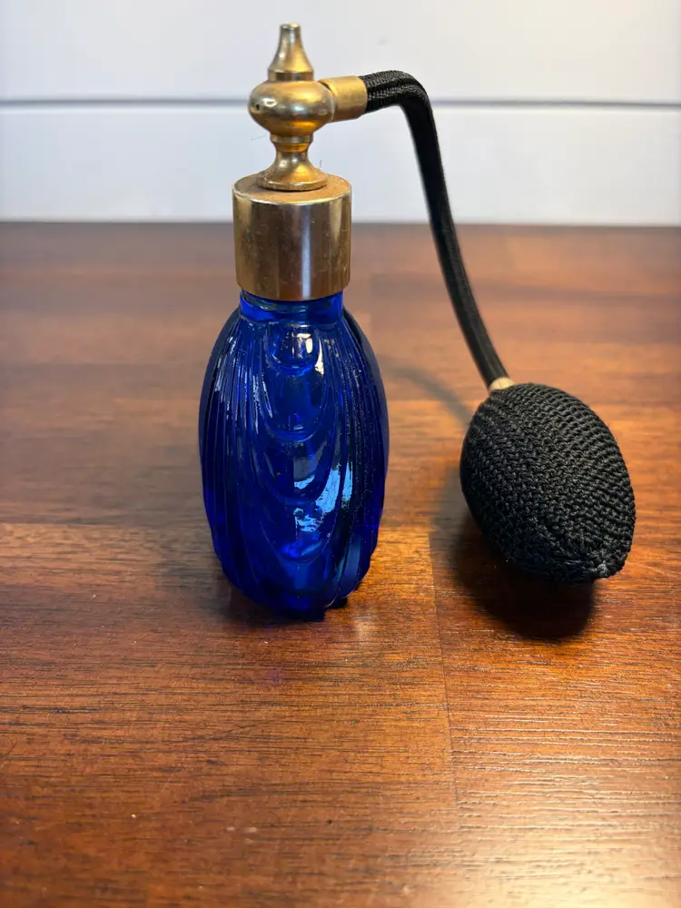 Charming cobalt blue glass perfume atomizer with a classic bulb pump. Perfect for adding a touch of vintage elegance to your vanity. 4 inches tall 2.5 inches wide. No condition issues.