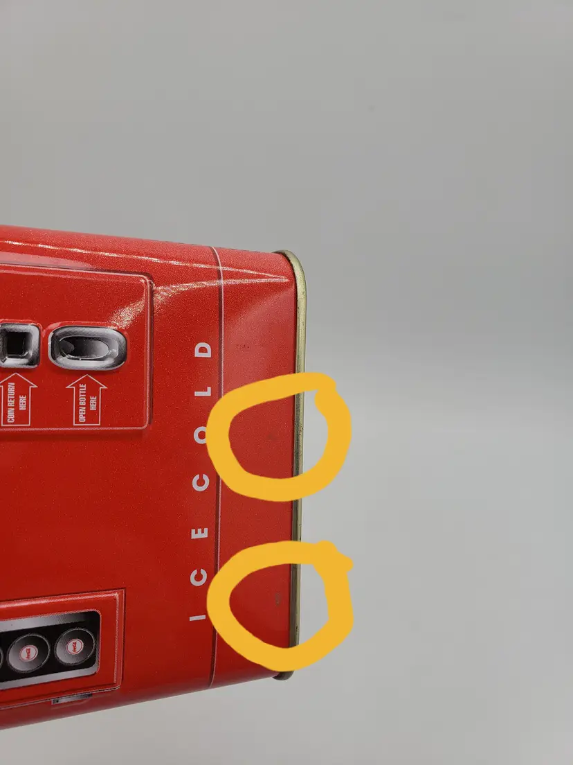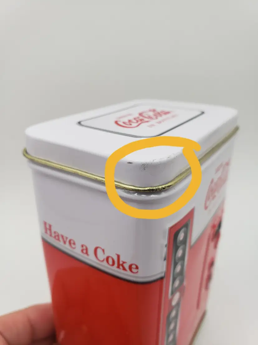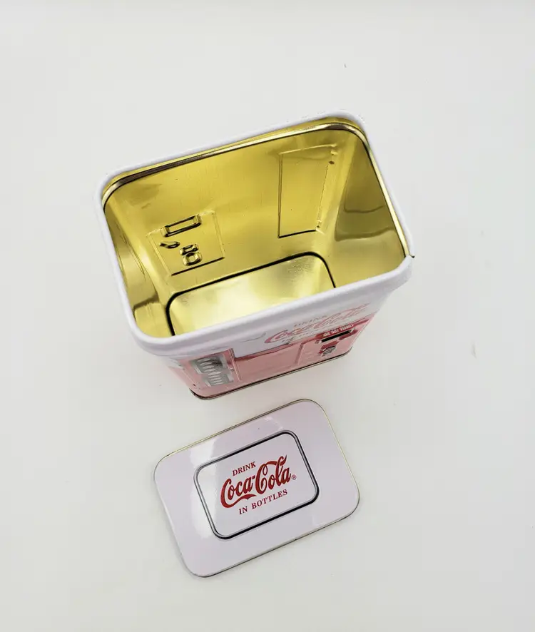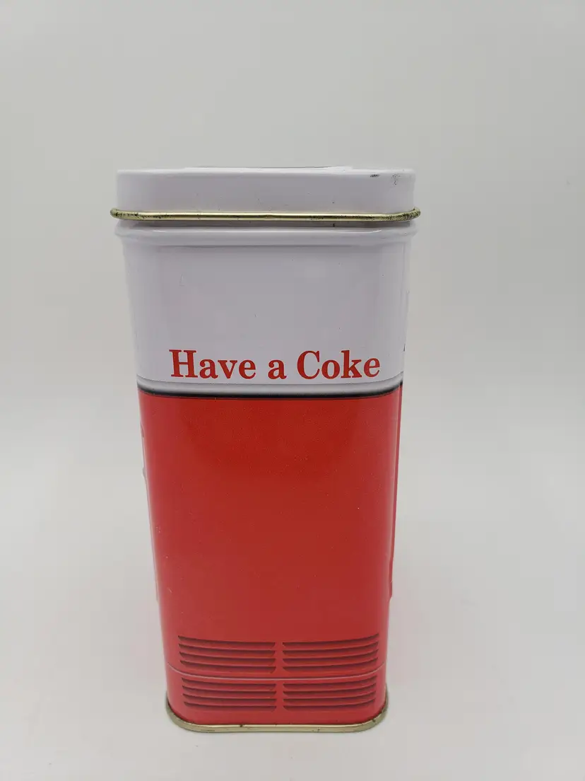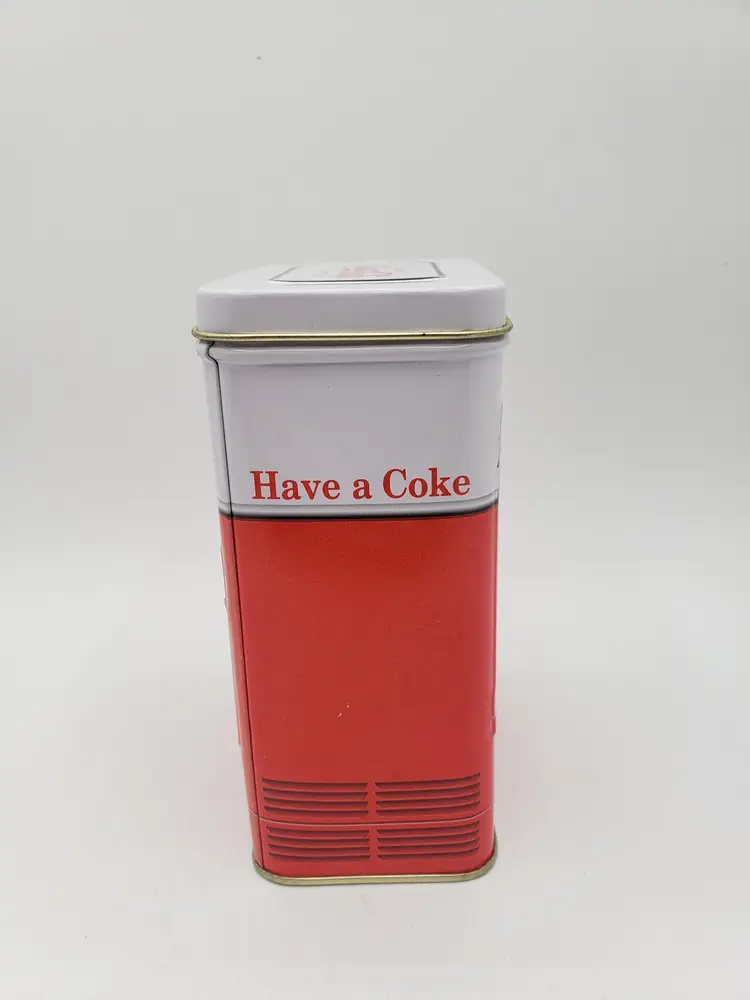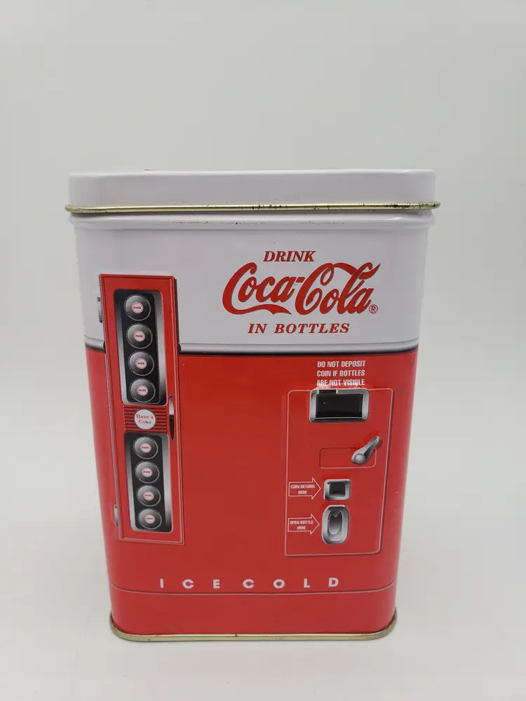 Vintage Coca Cola Tin Coke Bottle Vending Machine "Ice Cold" 1996 Tin Box Co 5". Delightful tin made to look like a retro Coke bottle vending machine. Removable lid. Minor flaws noted in pictures. Stands 5.25" tall, 3.5" wide and 2.25" thick.