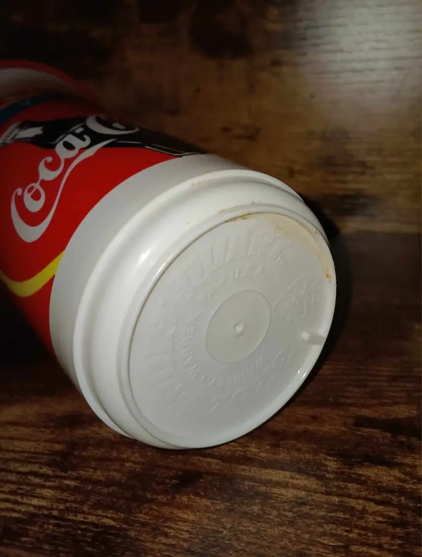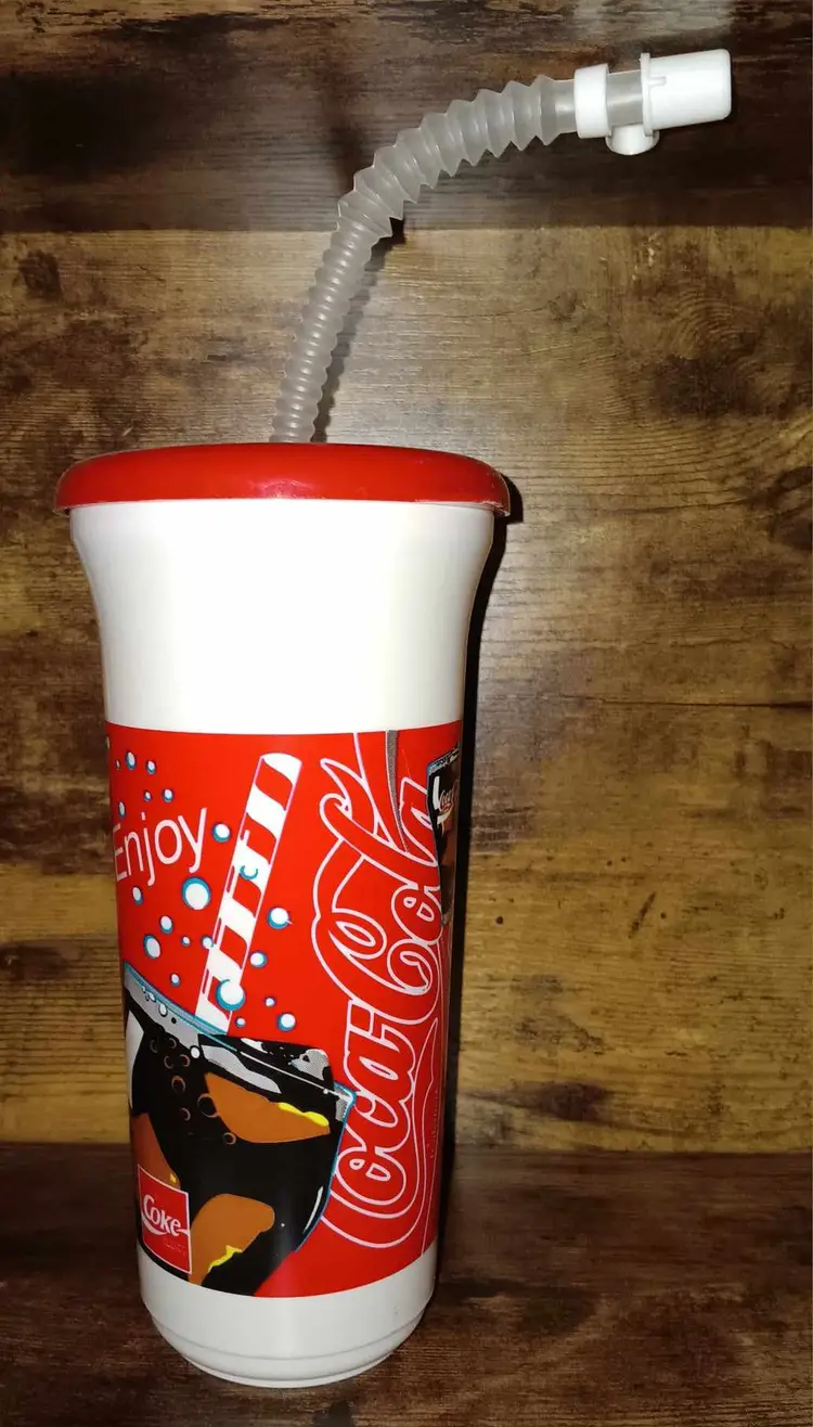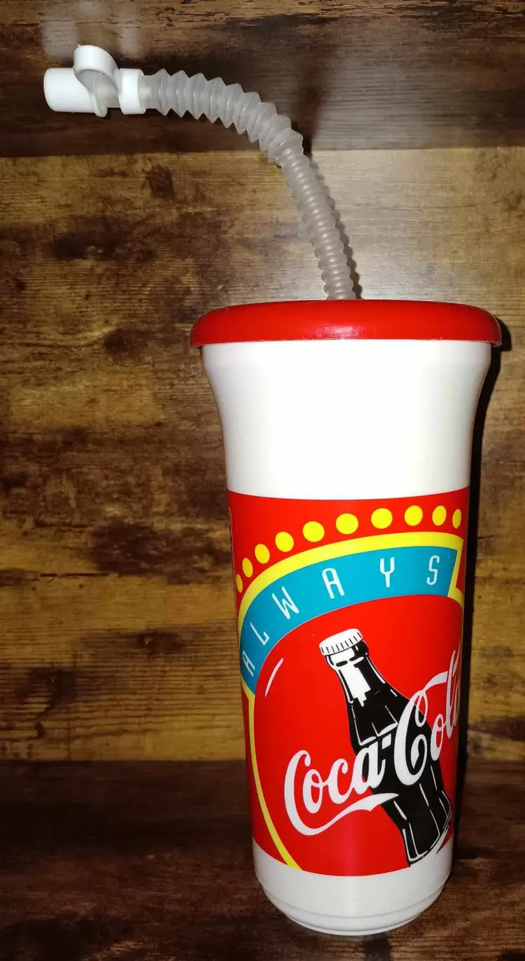 Vintage Coke cup with straw. Appears new and unused. No damages visible. It measures 8 inches tall and 4 inches wide at the top.