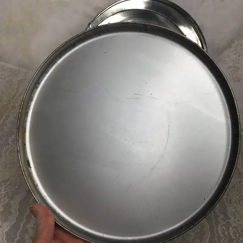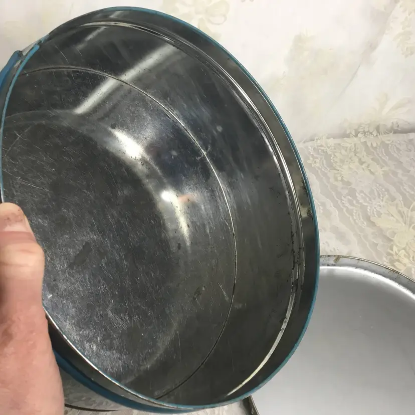 In good vintage condition. Does have expected use & wear marks which includes scattered scratches, dings, rusting on bottom underside base & spotting with age wear on inside. Please see pictures for more details. ***Contents NOT included. Shown for storage suggestions.