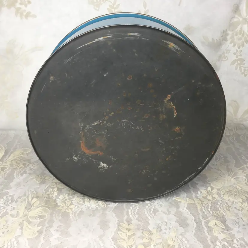 This is for a great vintage collectible tin circular container with lid. It is in the colors blue, black, pink, purple & green. A lovely tin for holding your sewing items, collectibles or anything that needs to be contained that will look fabulous as well!!