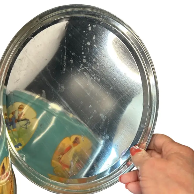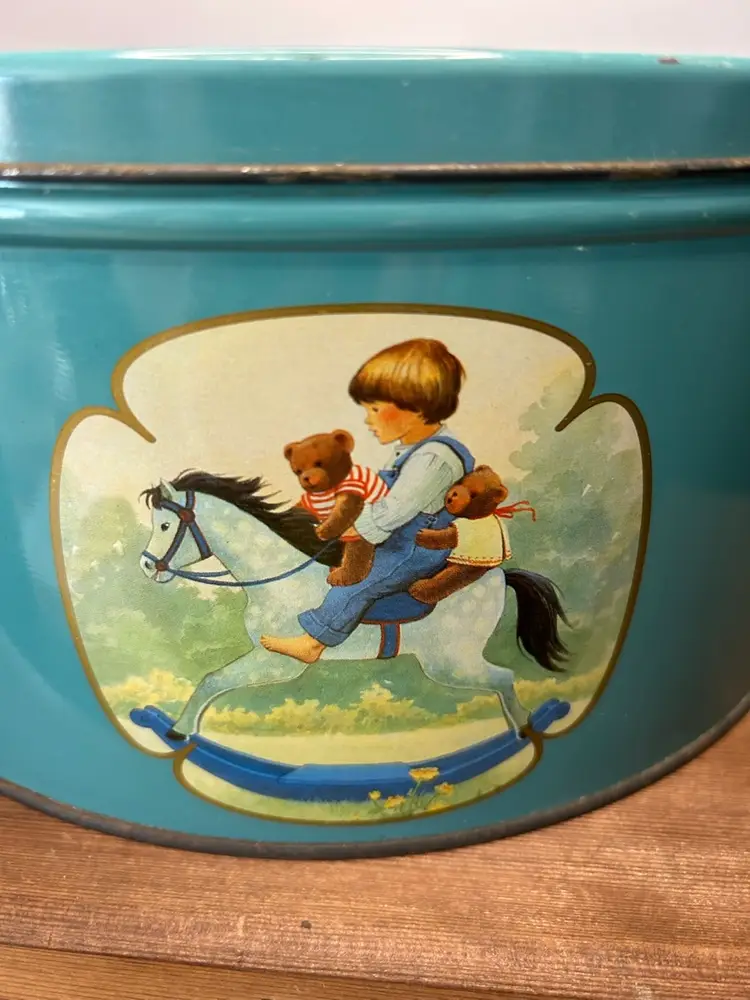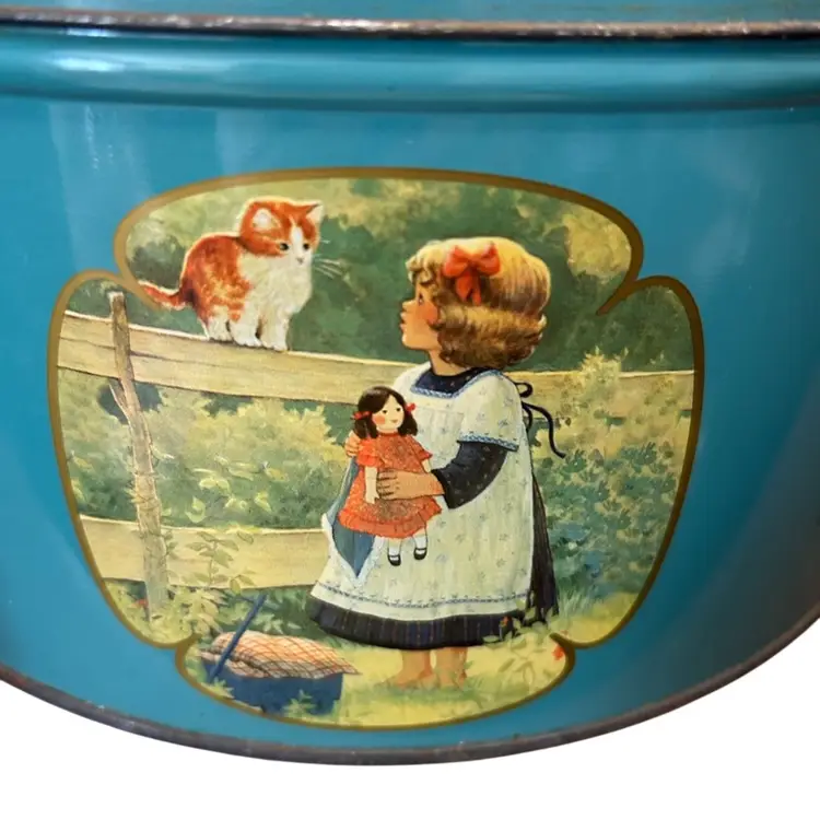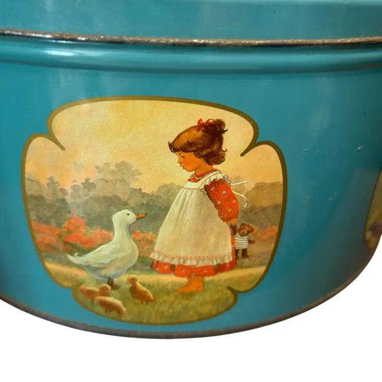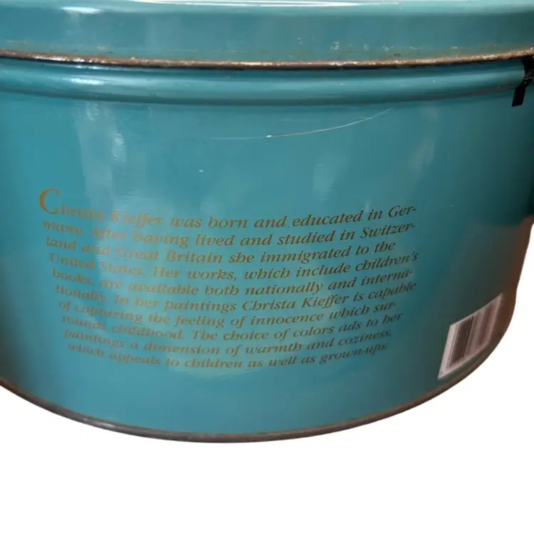Vintage Collectible Danish Butter Cookie Tin Artwork By Christa Kieffer Some Wear And Discoloration @10 1/2” Diameter 5”tall