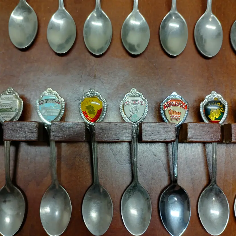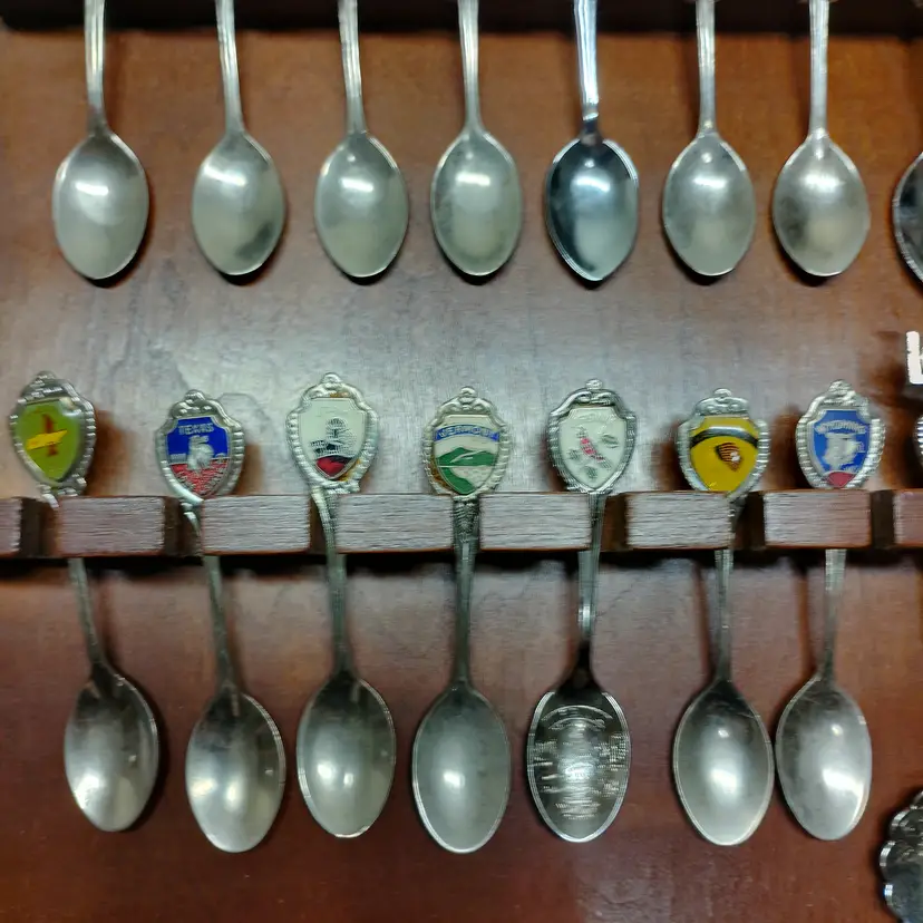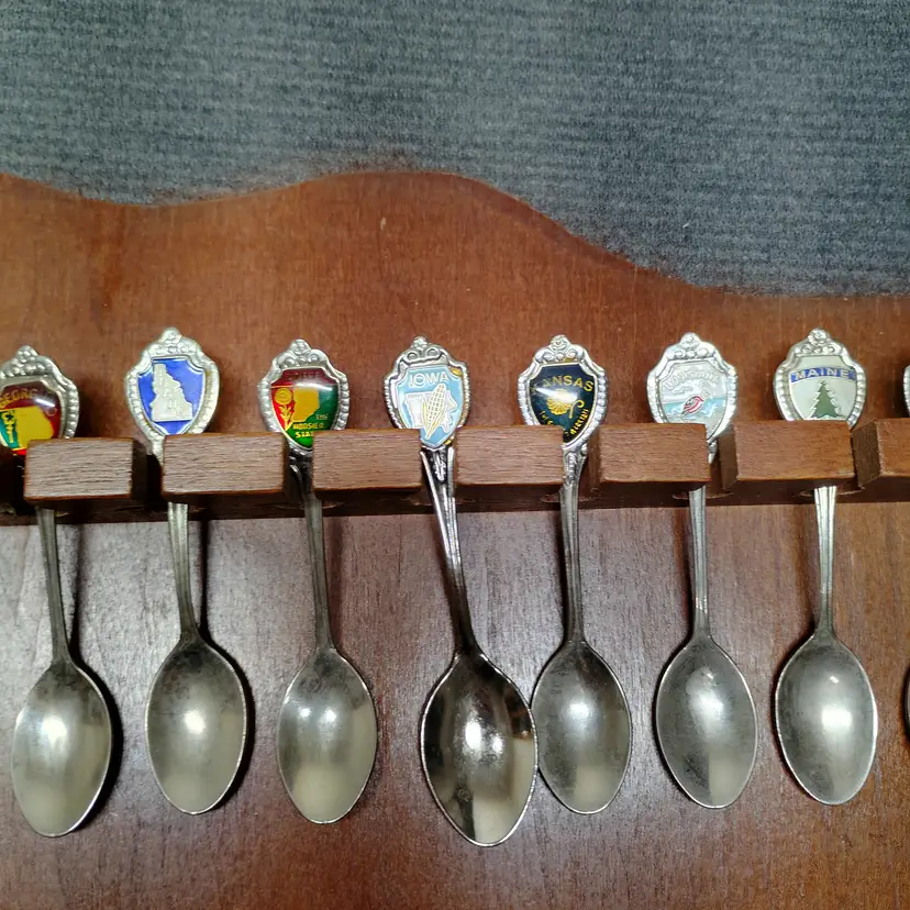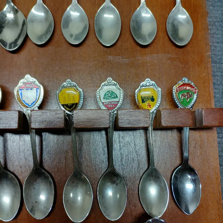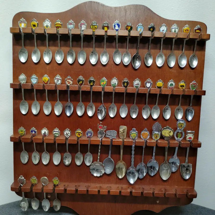 This listing features a vintage wooden display rack holding 52 collectible souvenir spoons. The spoons represent various states and locations, each with unique enamel designs and emblems. This collection is ideal for collectors of state memorabilia, spoon enthusiasts, or anyone looking to add a decorative and historical touch to their home. The wooden rack is designed to showcase the spoons beautifully, with individual slots for each piece. Please examine all photos carefully to see the specific designs on each spoon and the overall condition of the display rack and its contents. This is a substantial collection perfect for display and appreciation. Condition is pre-owned - good. Note: This listing includes 52 spoons. Please refer to the images for all specific designs and details.