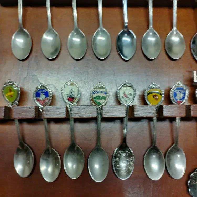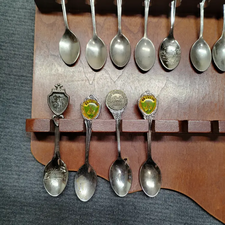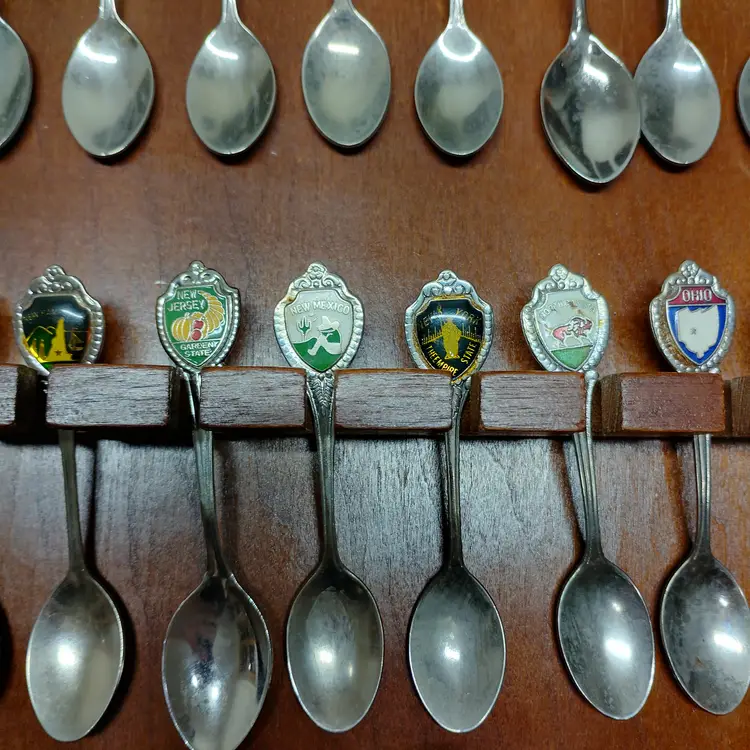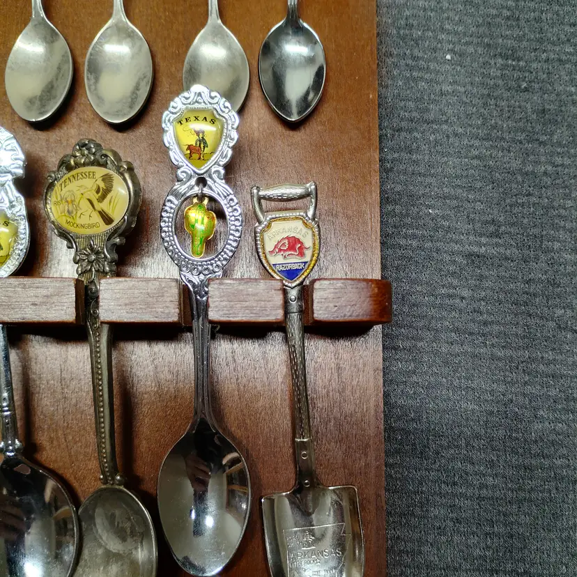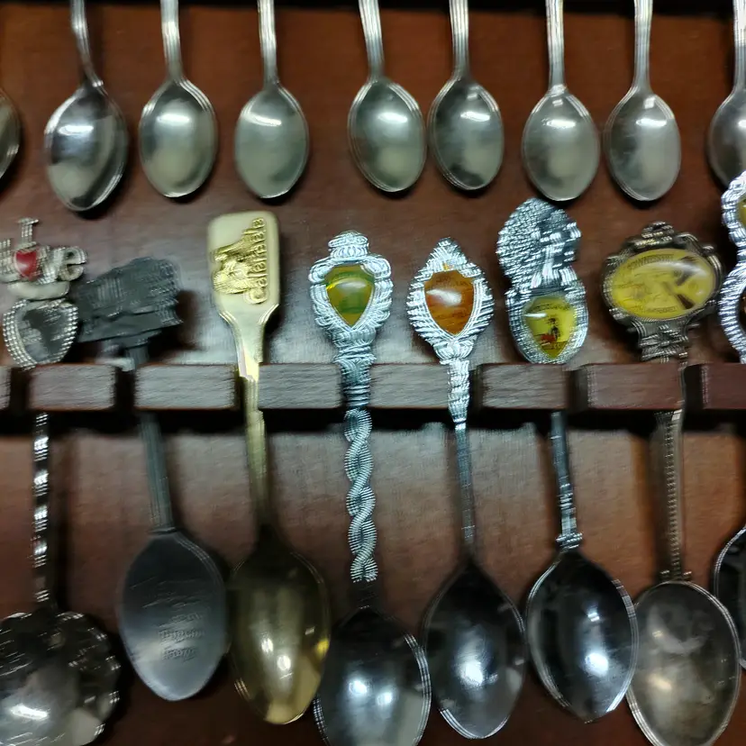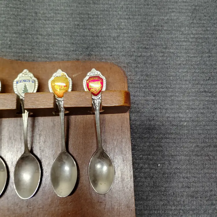 This listing features a vintage wooden display rack holding 52 collectible souvenir spoons. The spoons represent various states and locations, each with unique enamel designs and emblems. This collection is ideal for collectors of state memorabilia, spoon enthusiasts, or anyone looking to add a decorative and historical touch to their home. The wooden rack is designed to showcase the spoons beautifully, with individual slots for each piece. Please examine all photos carefully to see the specific designs on each spoon and the overall condition of the display rack and its contents. This is a substantial collection perfect for display and appreciation. Condition is pre-owned - good. Note: This listing includes 52 spoons. Please refer to the images for all specific designs and details.