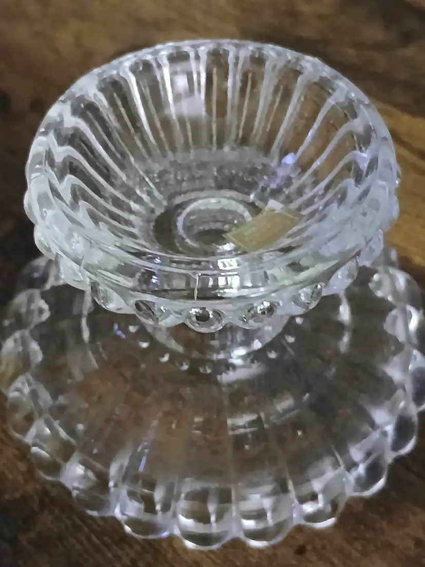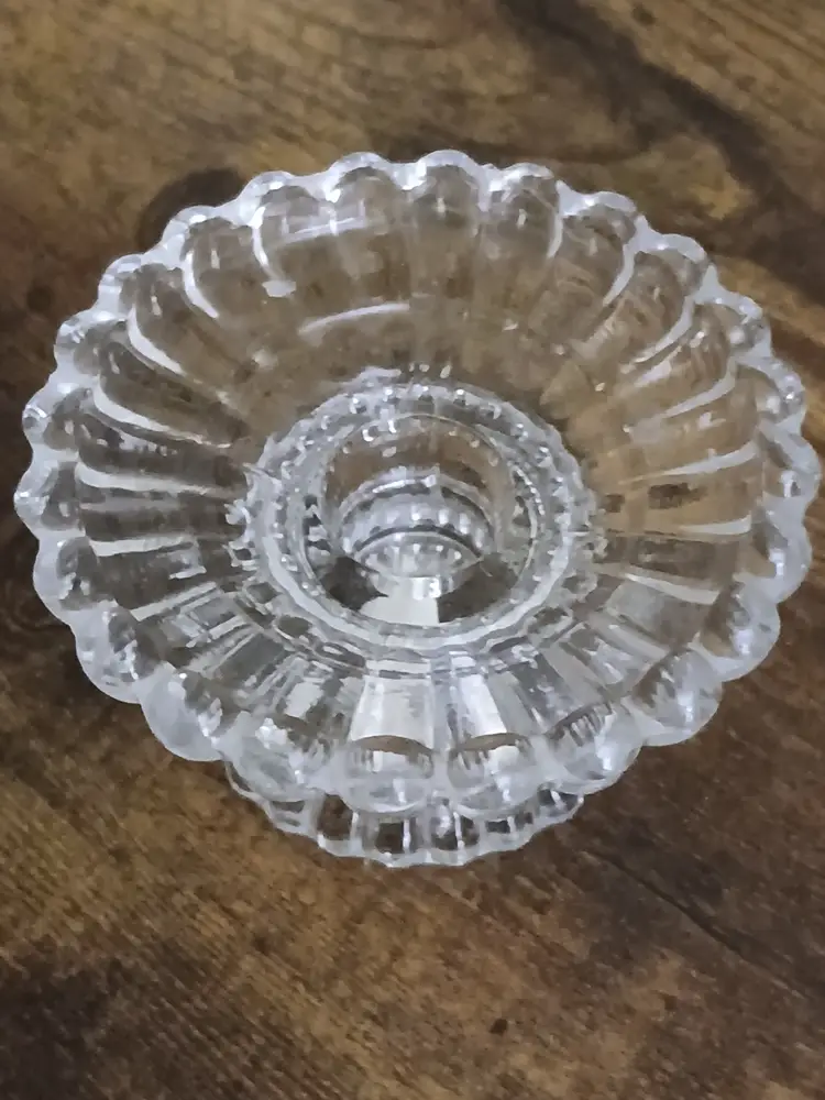 Add a touch of elegance to your table with this vintage candle holder. Perfect decorative piece. Its intricate design and clear glass make it a versatile addition to any collection. Approximately 3 3/4