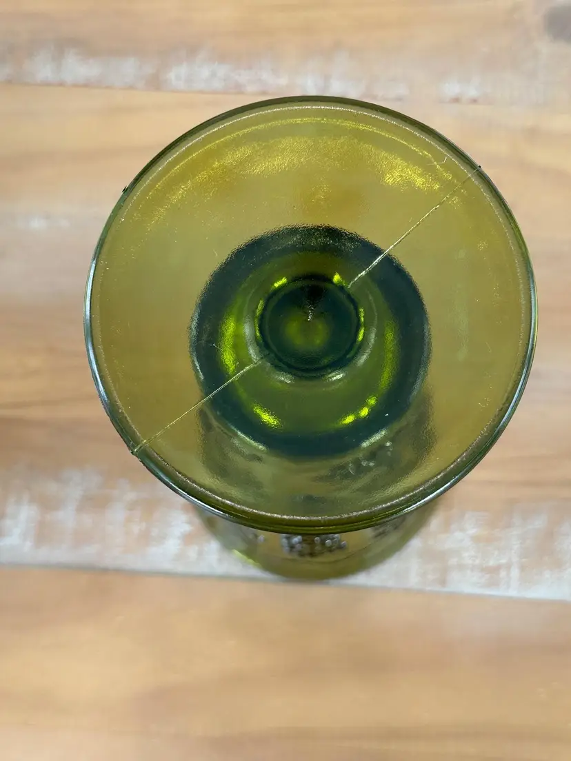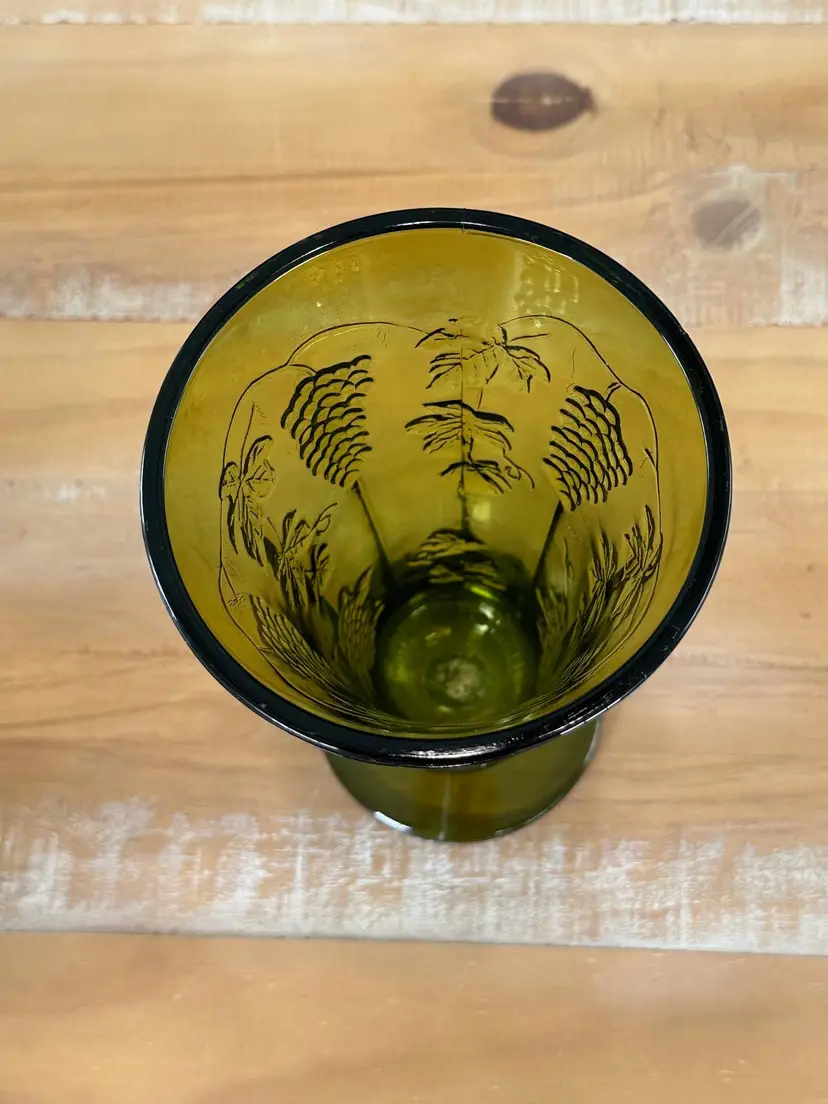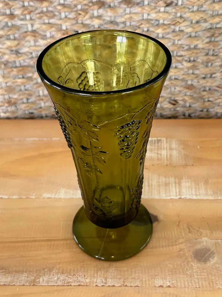 Add a touch of vintage charm to your home with this beautiful green glass vase. Featuring an intricate grape motif, it's perfect for displaying fresh flowers or as a standalone decorative piece. W: 5" H: 9.75"