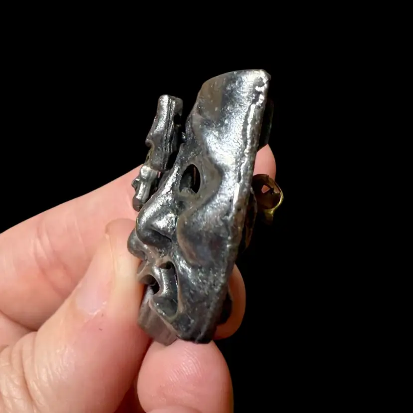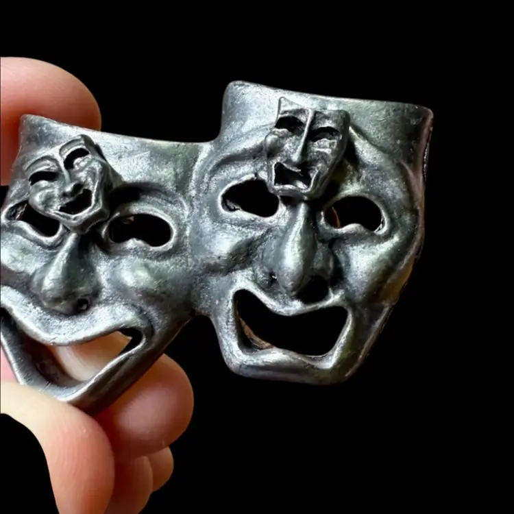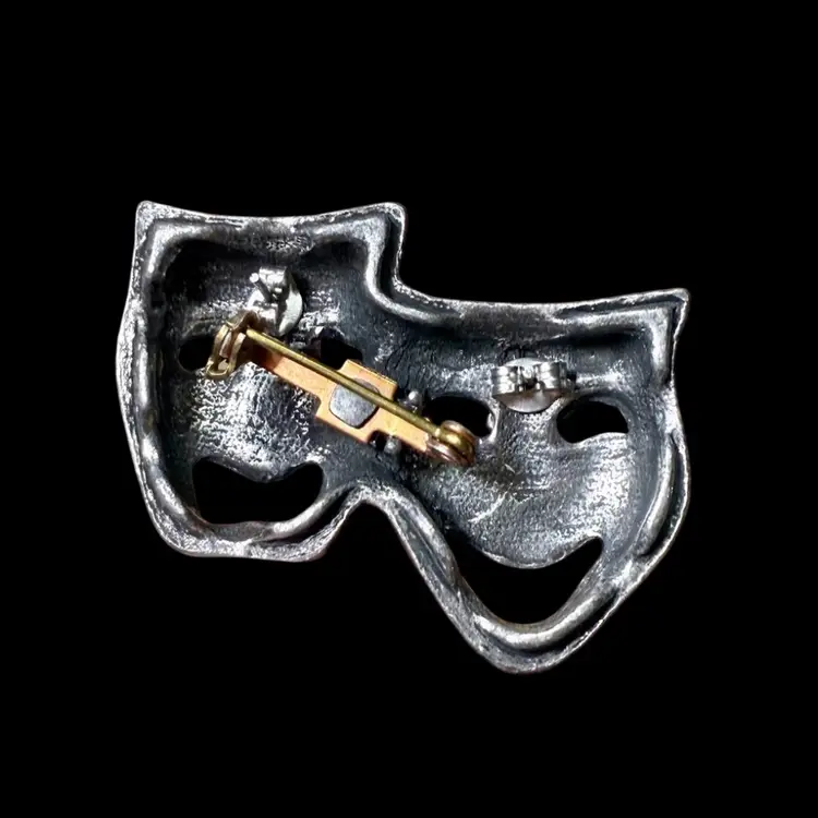 Brooch: 1.75”x1.5”. Earrings: approx 0.75” Really cool brooch and earring set of comedy/tragedy masks. The earrings sit in holes on the brooch faces and can be removed and worn (masks then have two holes in head when removed). Not signed.