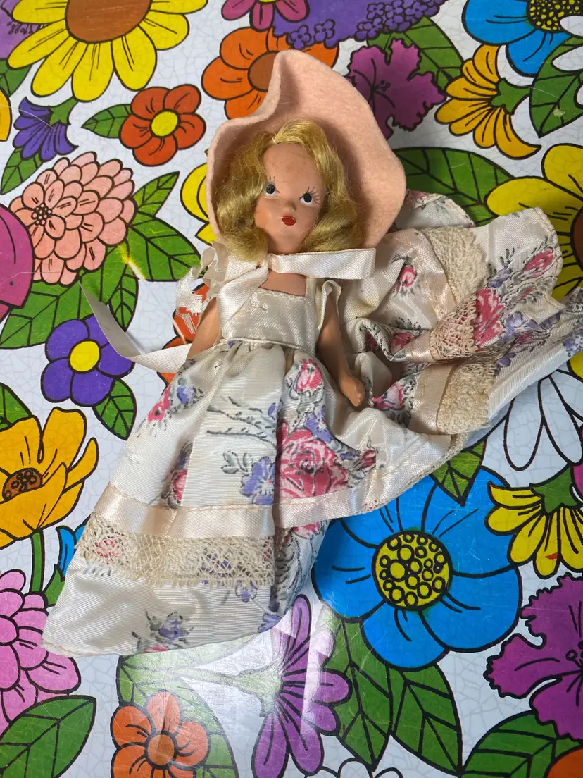 For sale! Nancy Ann Doll in Bonnet. As is. Some wear to clothes and felt. 5 inches tall