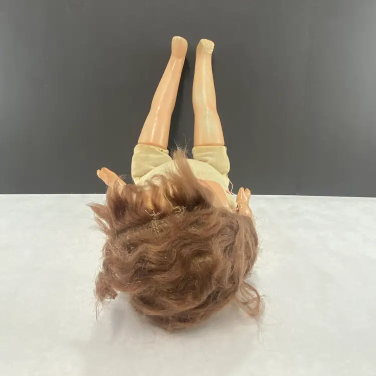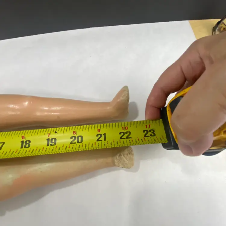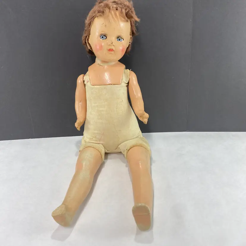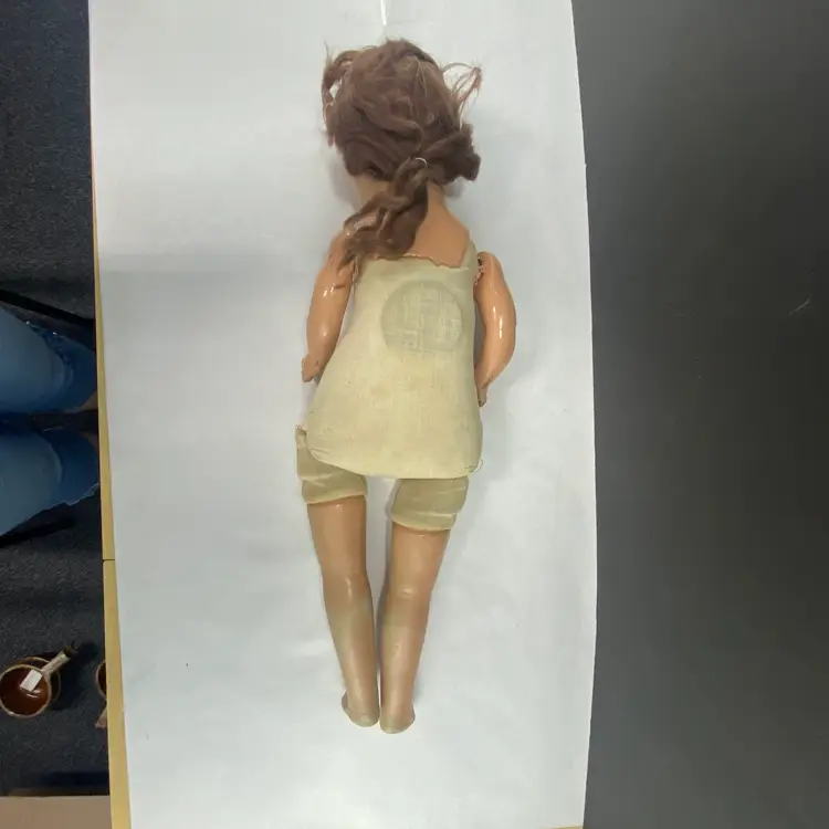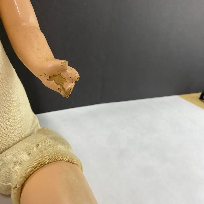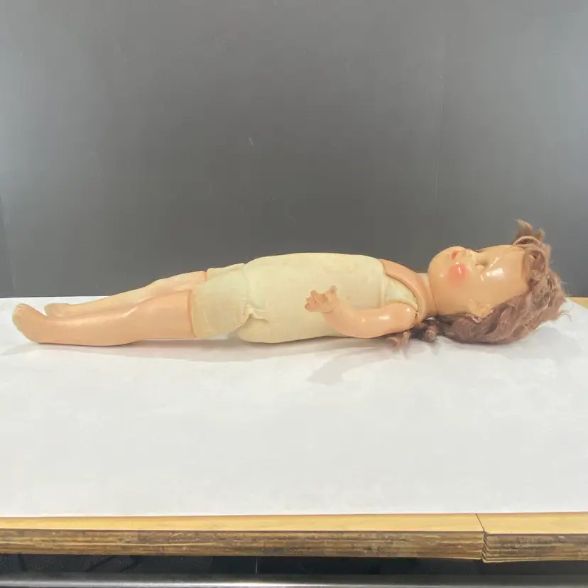 • 22-inch length from head to one toe - since she is missing part of her other foot • Sleepy eyes mechanism • Composite material construction, with fabric body and has a sound box that doesn't work - or maybe it will in the middle of the night • Worn fabric body adds to the scariness of this doll • Ideal for crafting for Halloween!