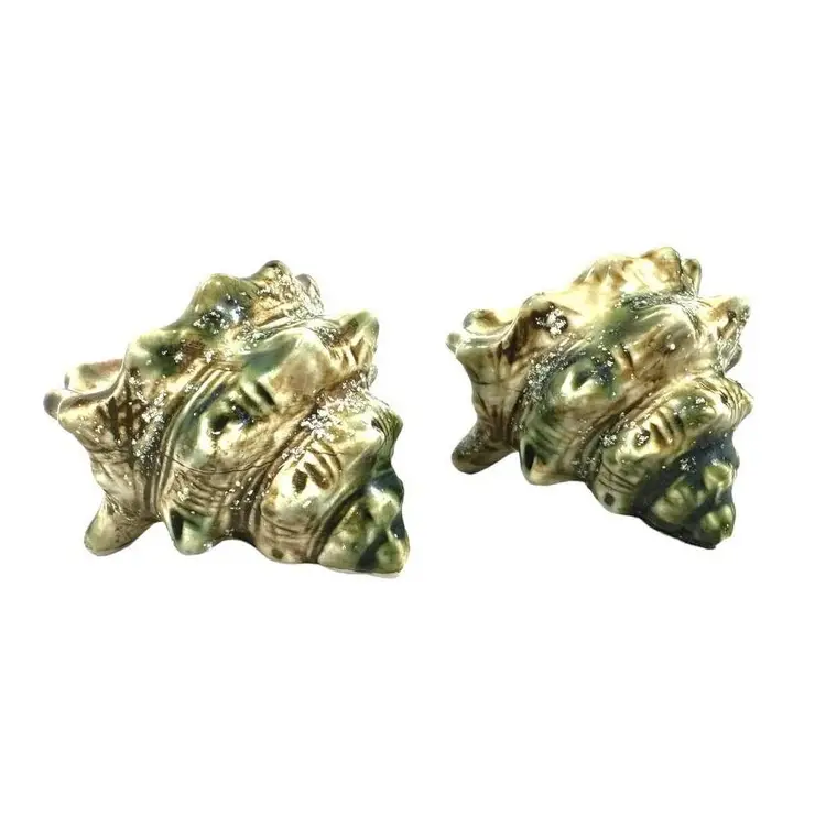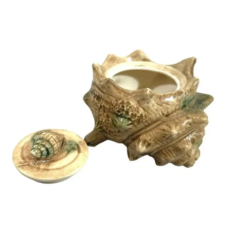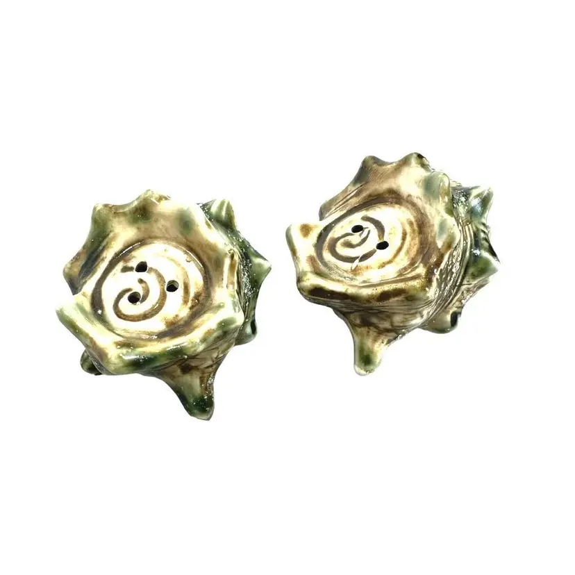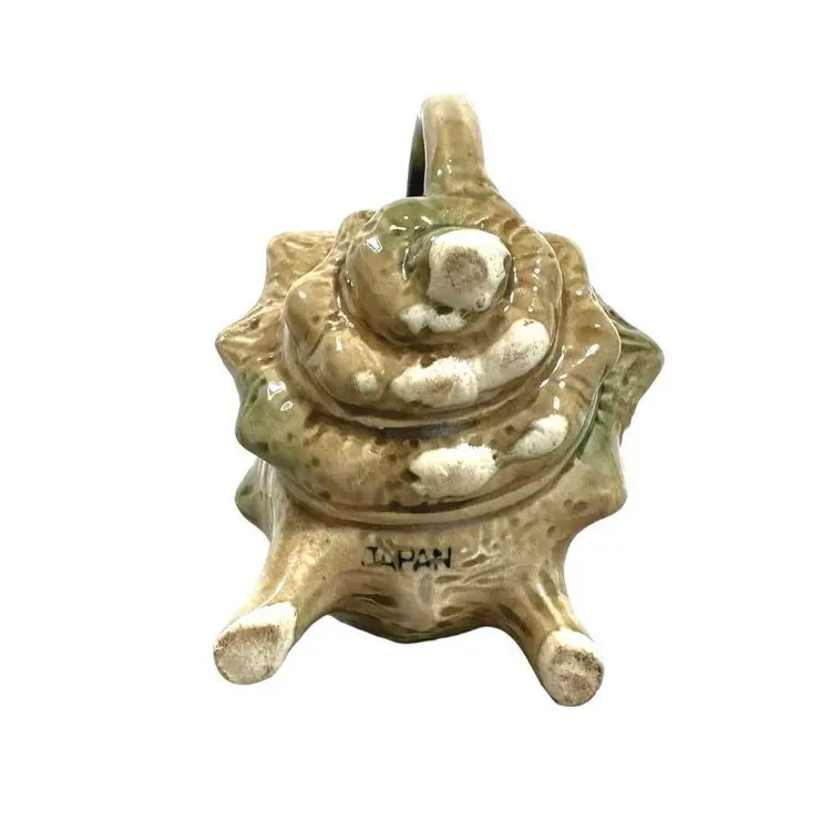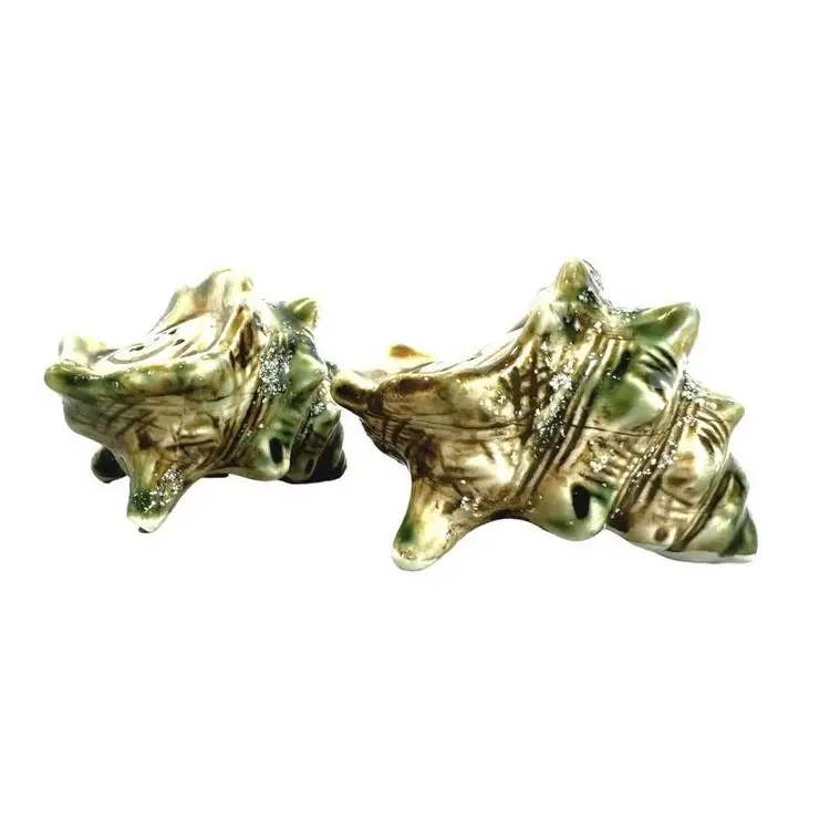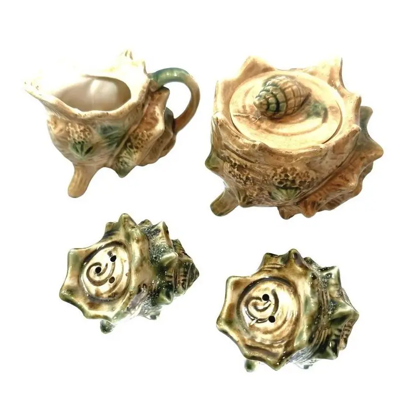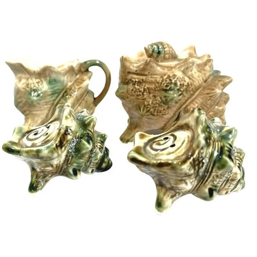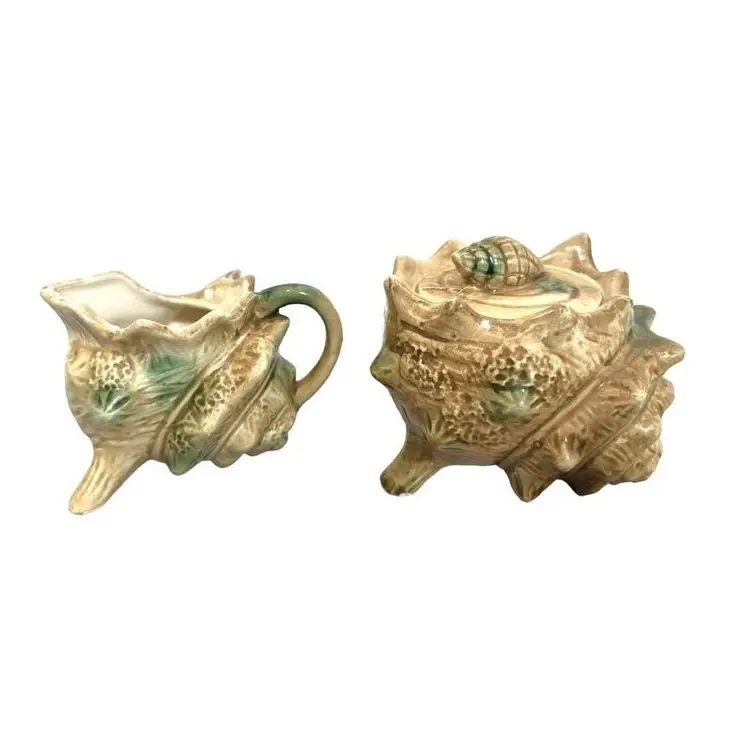 Vintage Crustacean Decor Conch shell creamer pitcher and sugar dish with lid. To complete your tablescape is a matching vintage conch shell salt and pepper shaker set. In good vintage condition, no chips or cracks.
