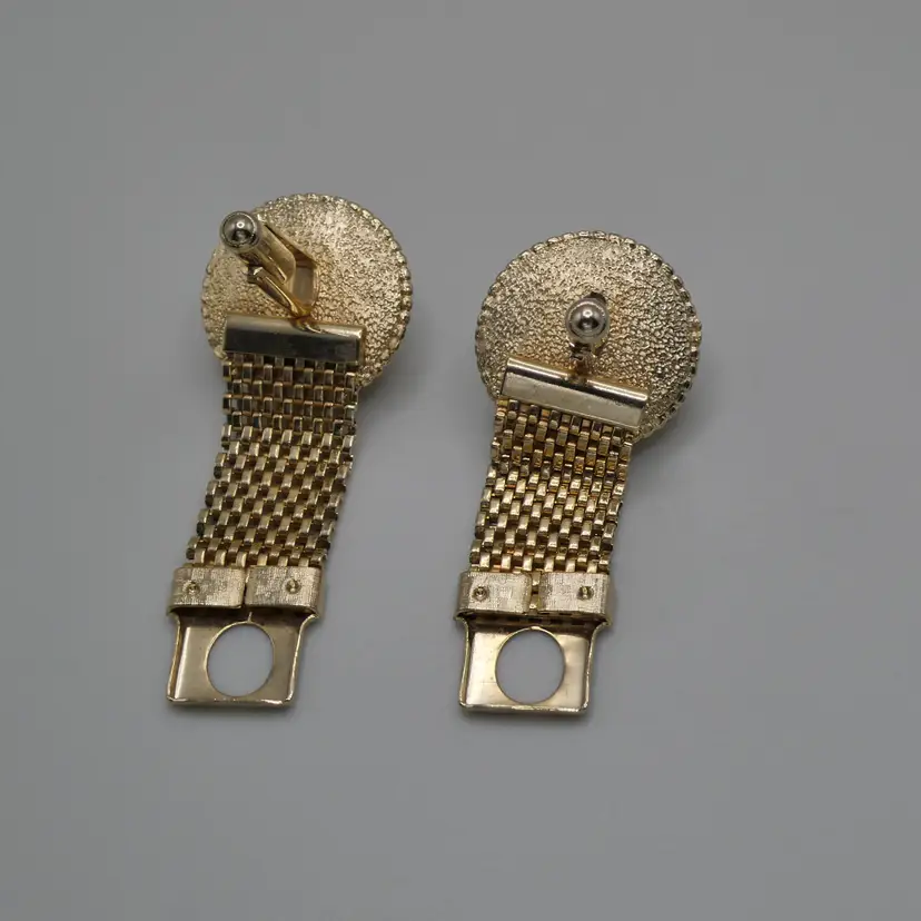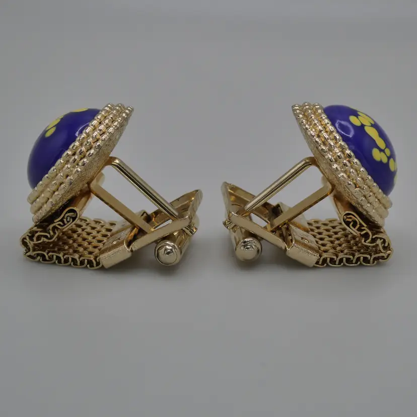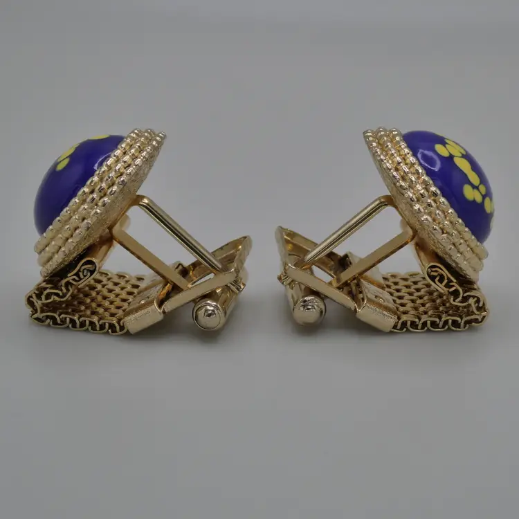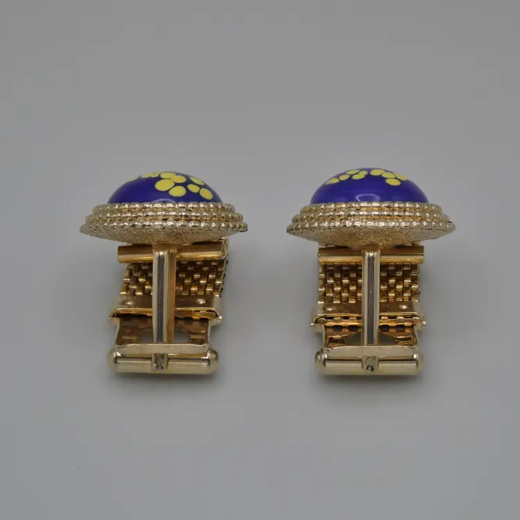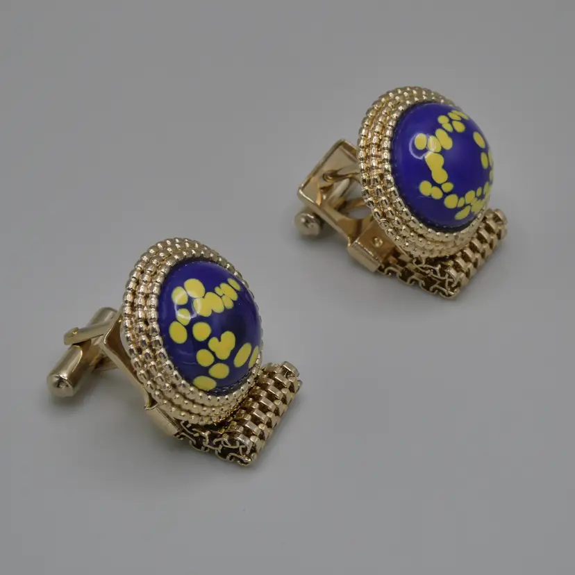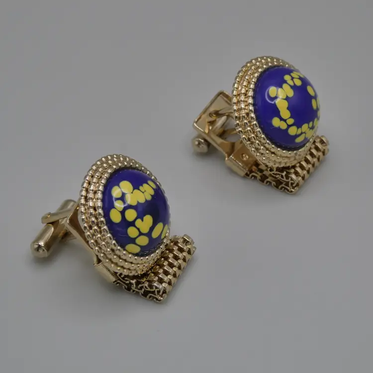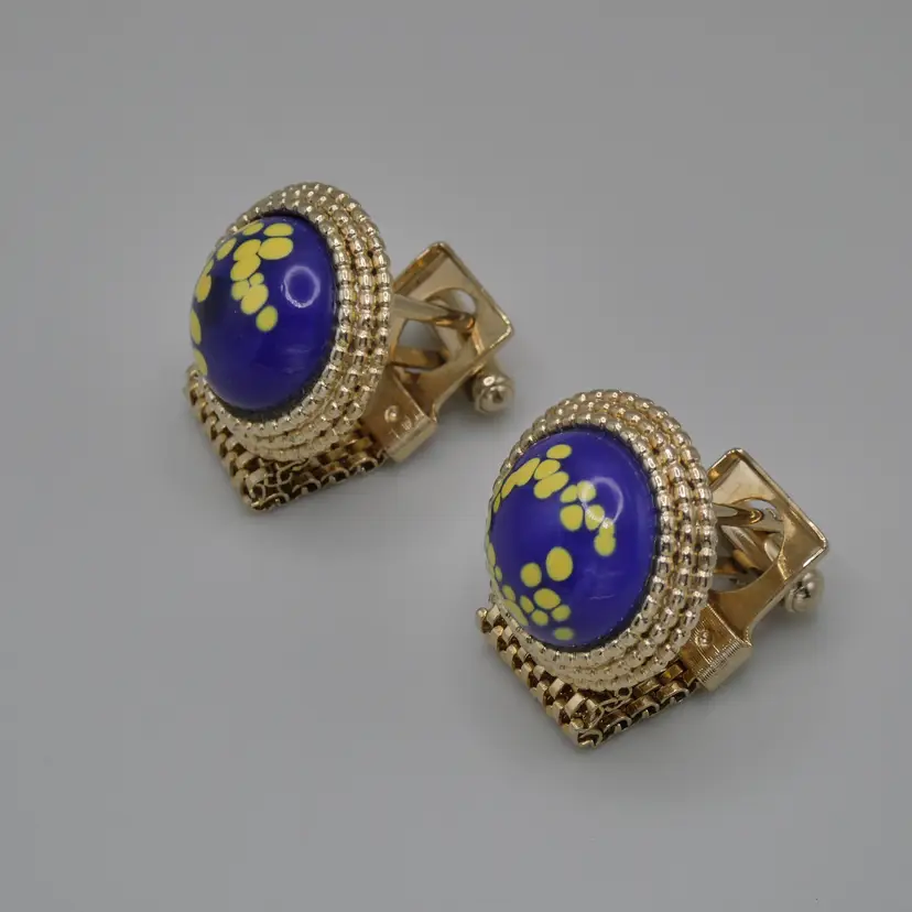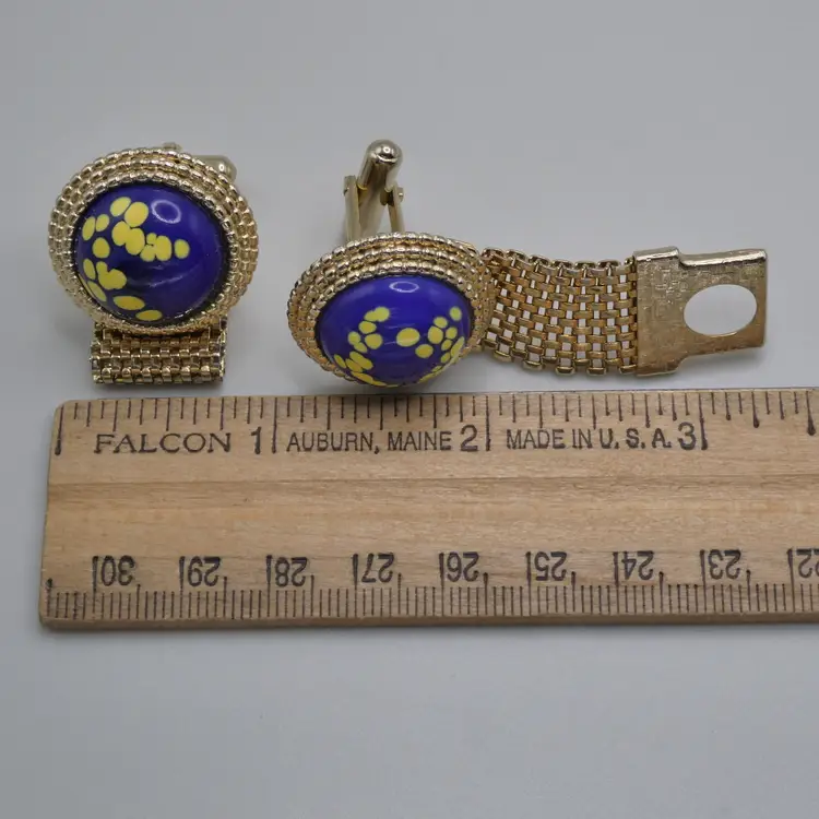 Featuring a retro pair of mesh wraparound cufflinks with domed confetti art glass cabochons Cabochons are cobalt blue with scattered yellow confetti Gold tone metal with triple beaded rim bezels Bullet back mechanisms are in good working condition Unmarked designer pieces Round cabochons are about 18mm across Round focal measures overall about 1" across x 3/8" deep Cufflinks measure about 2-3/8" long from end to end Pair weigh about 1.4 ounces
