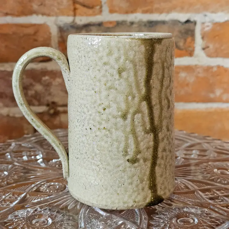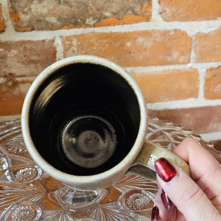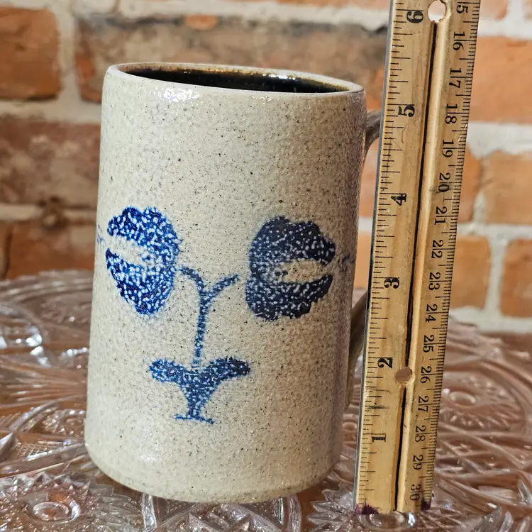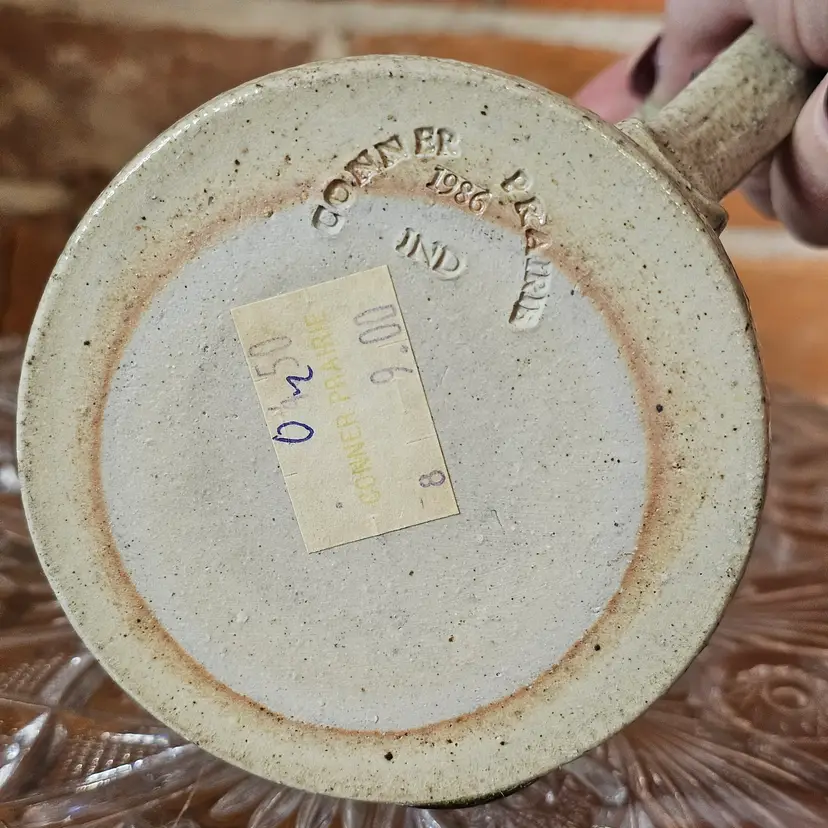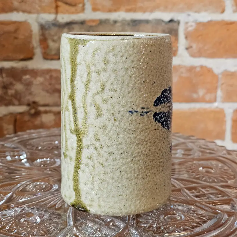 Condition: Very good vintage condition. No chips or cracks noted. Glaze variations, speckling, and drip marks are part of the handmade character. Interior shows light use consistent with age.