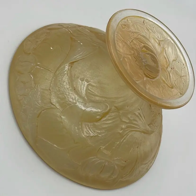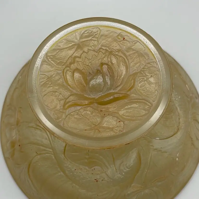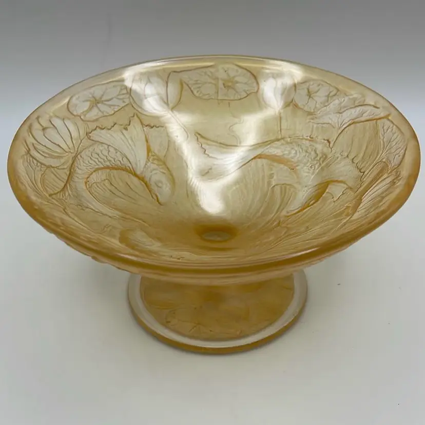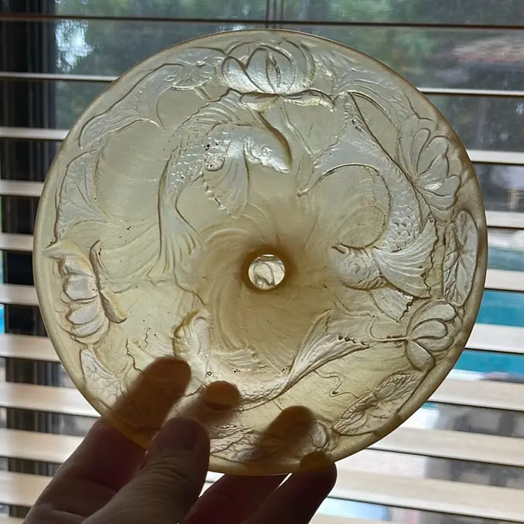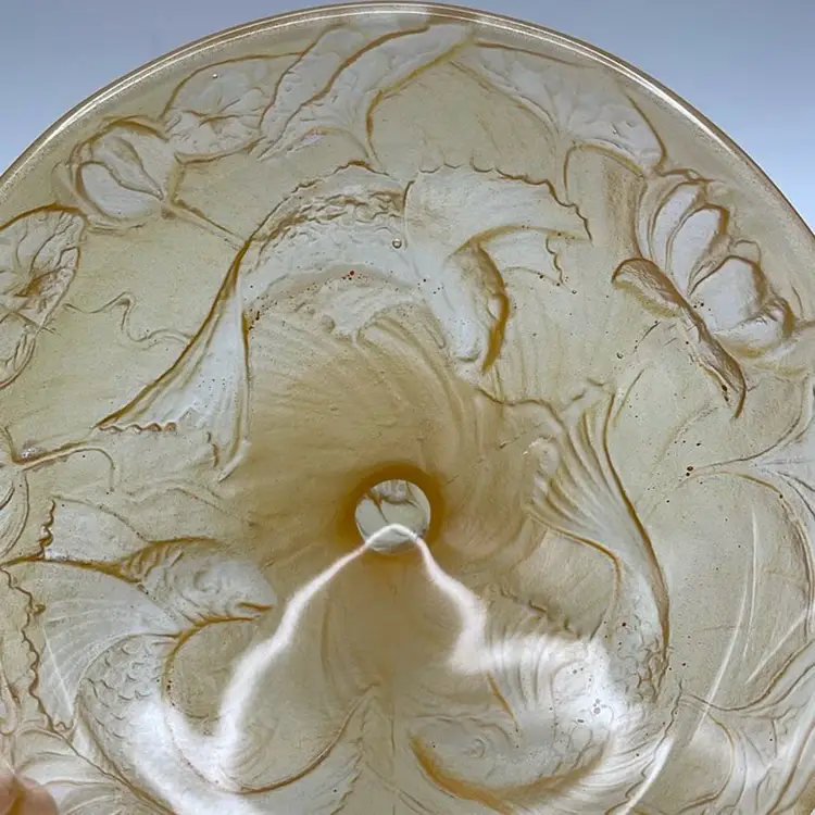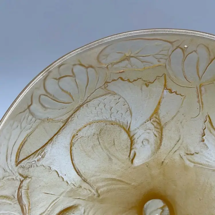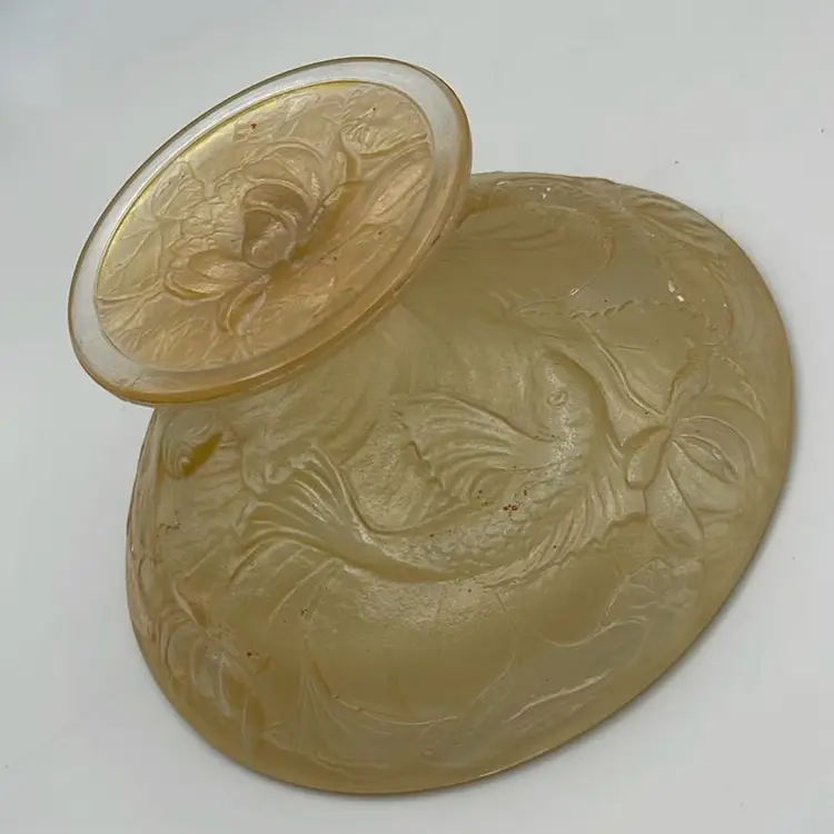 3-D relief molded design on the exterior and bottom of foot consists of koi fish and water lilies or lotus blossoms.