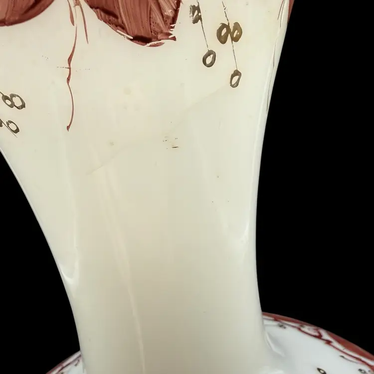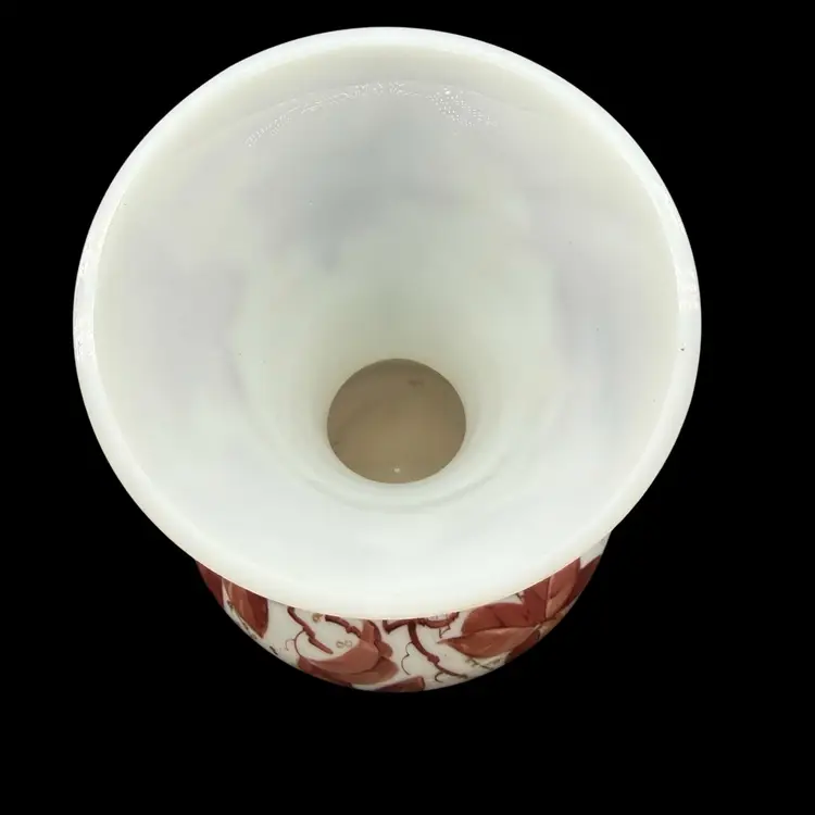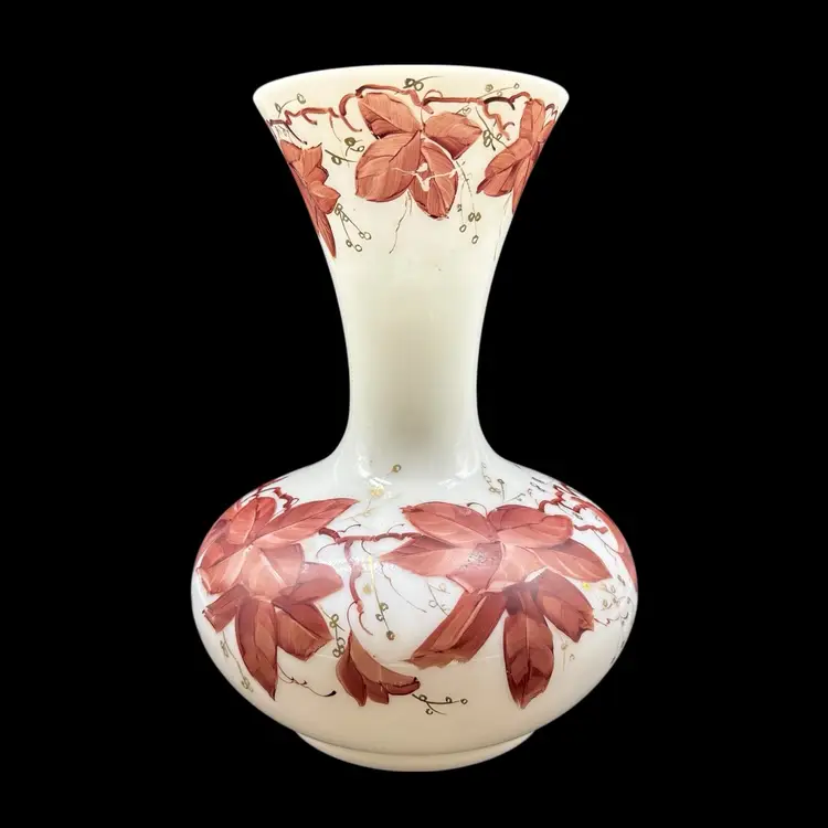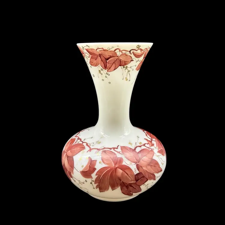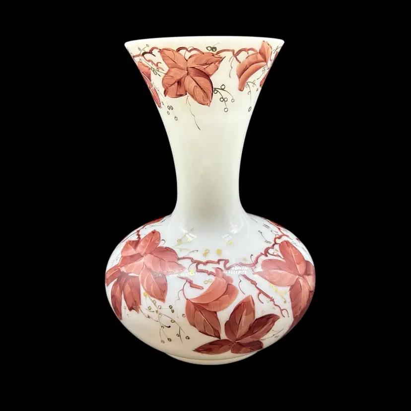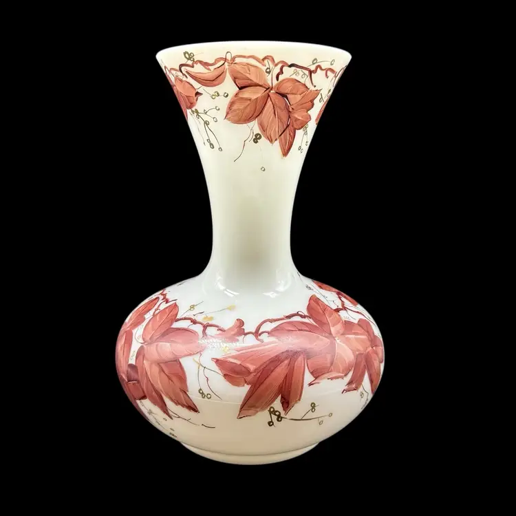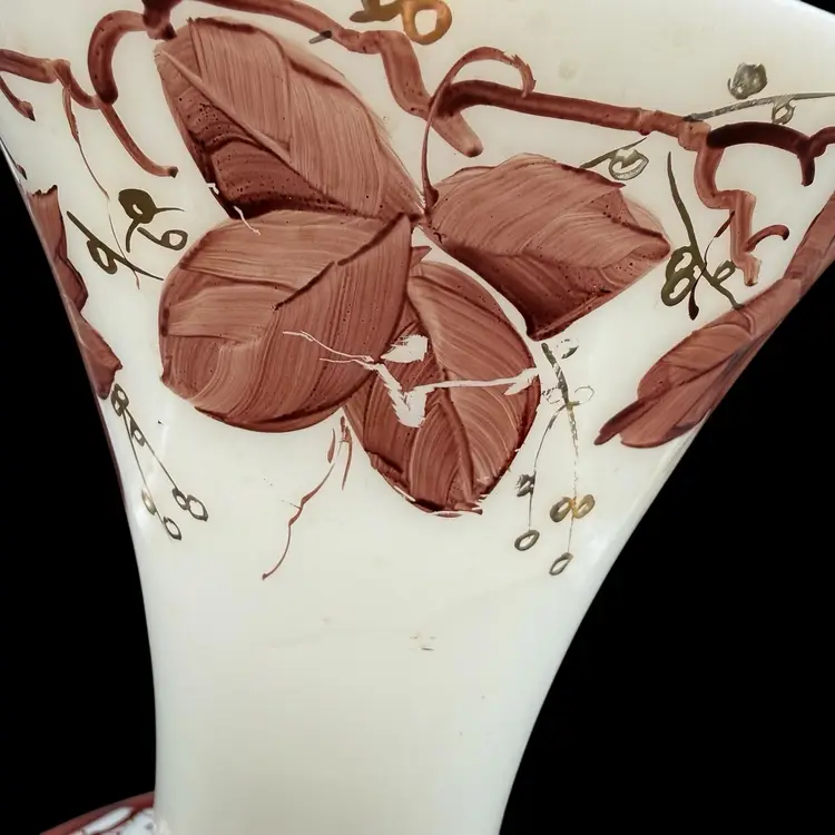 The Vintage Consolidated Milk Glass Charleton 12" Vase features a beautiful design with brown leaves & vines and gold accents, perfect for collectors of feminine and nature-themed pieces. Made in the United States during the 1940s, this hand-painted vase is a stunning example of Art Nouveau style and milk glass production technique. The vase's all-over pattern and intricate details make it a unique and collectible item, ideal for adding a touch of vintage charm to any decor.