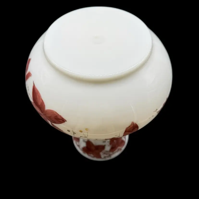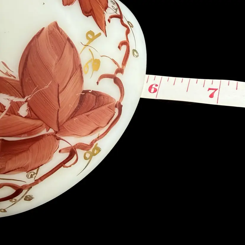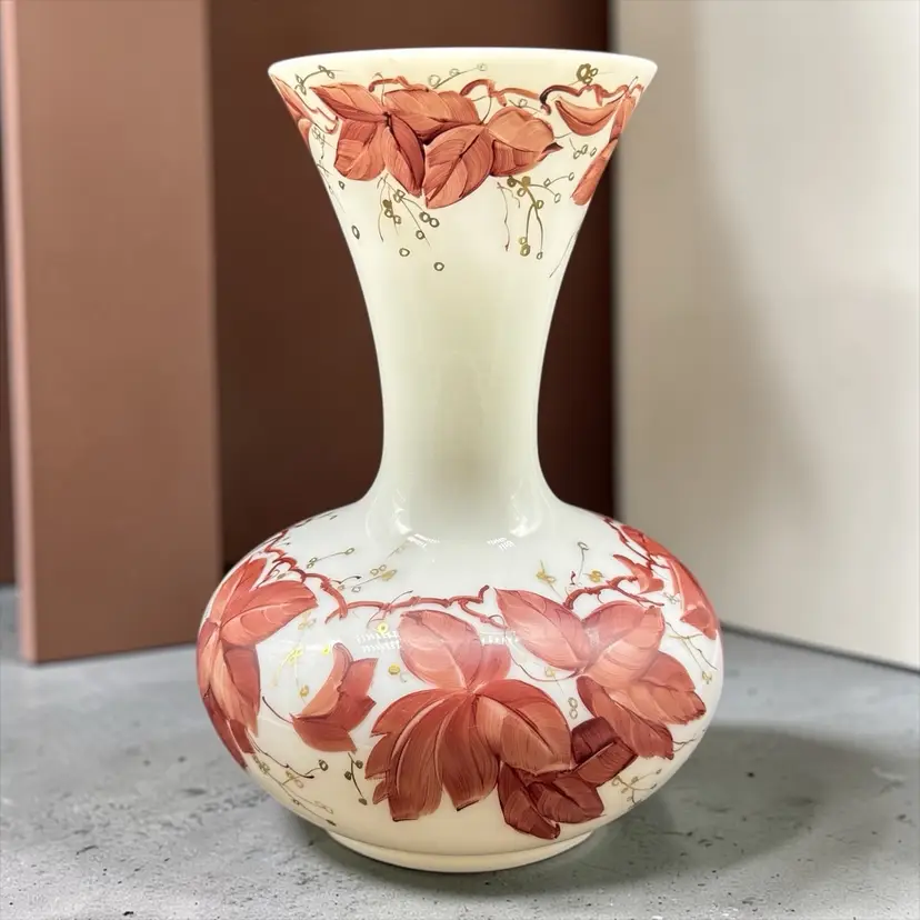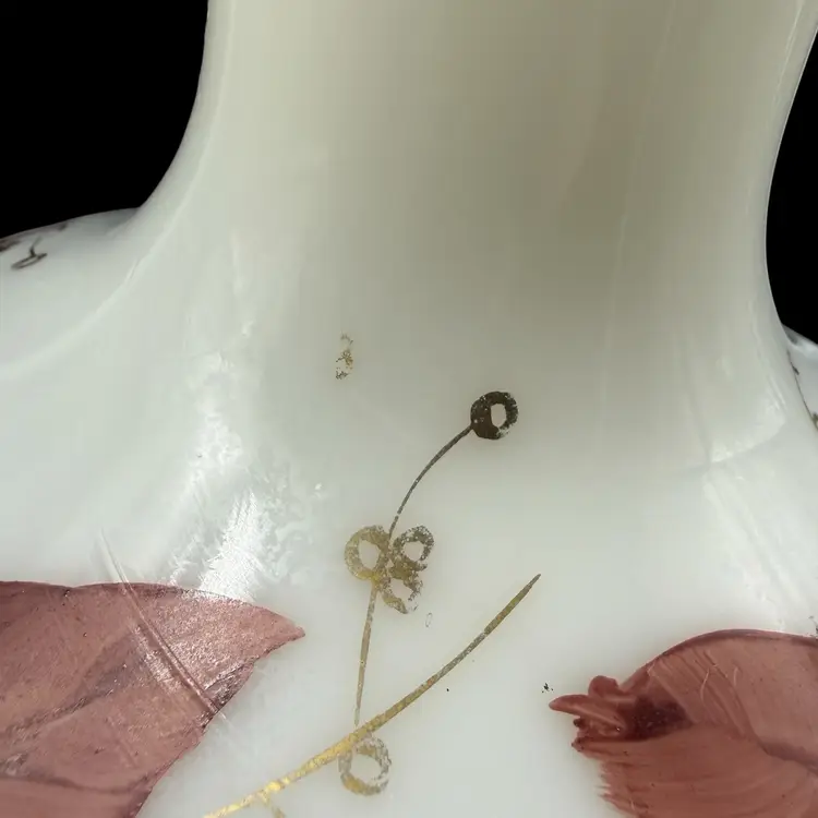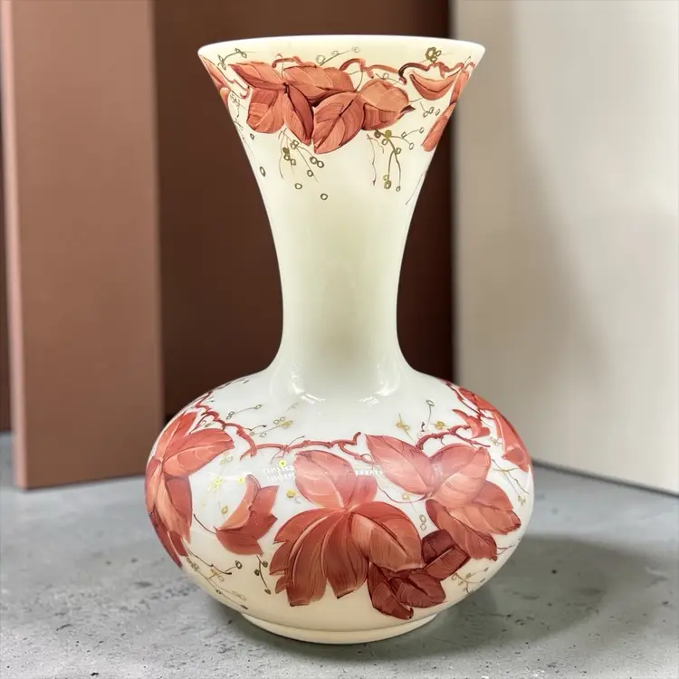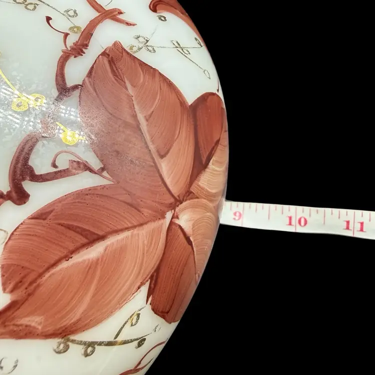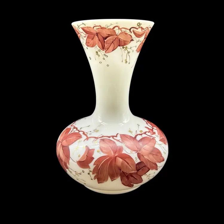 The Vintage Consolidated Milk Glass Charleton 12" Vase features a beautiful design with brown leaves & vines and gold accents, perfect for collectors of feminine and nature-themed pieces. Made in the United States during the 1940s, this hand-painted vase is a stunning example of Art Nouveau style and milk glass production technique. The vase's all-over pattern and intricate details make it a unique and collectible item, ideal for adding a touch of vintage charm to any decor.