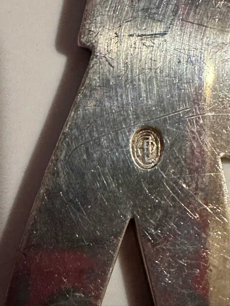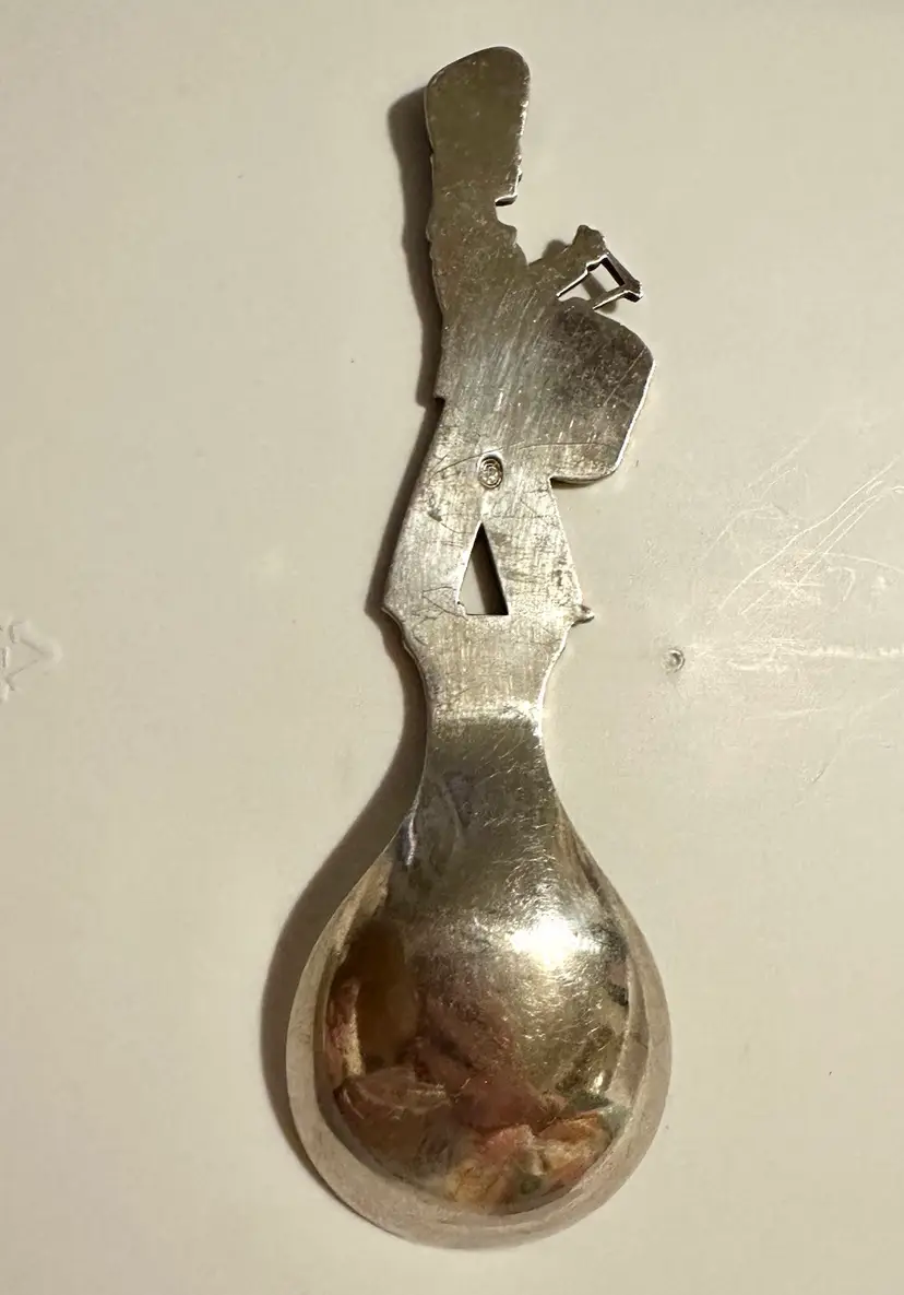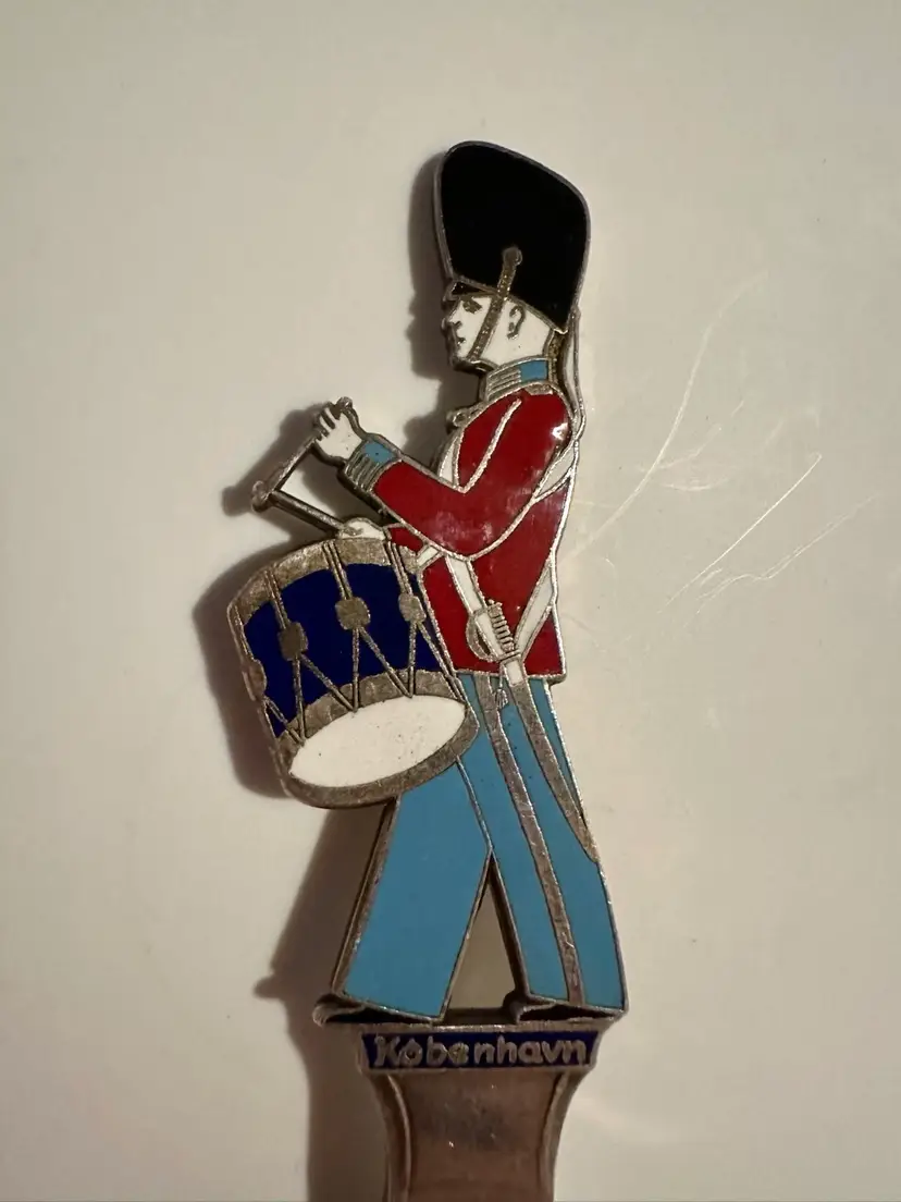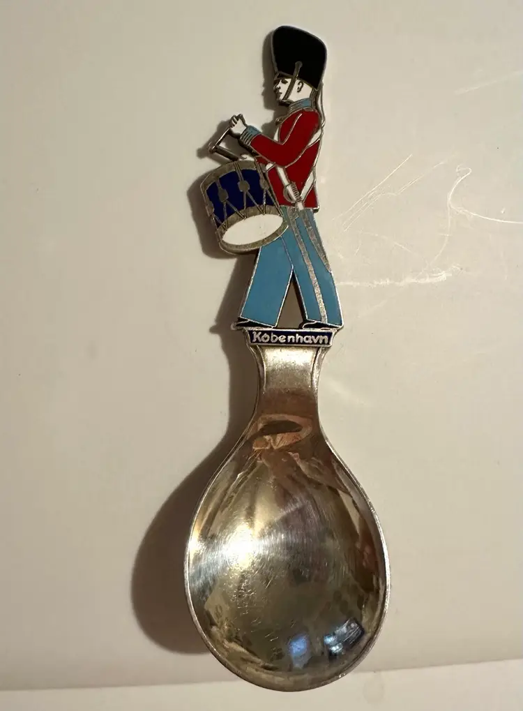 Vintage souvenir spoon from Copenhagen Denmark. It is silver plated with a Figural handle of drummer soldier. The soldier is enameled in red white blue and black. It measures 5.25”. It is in very good condition.