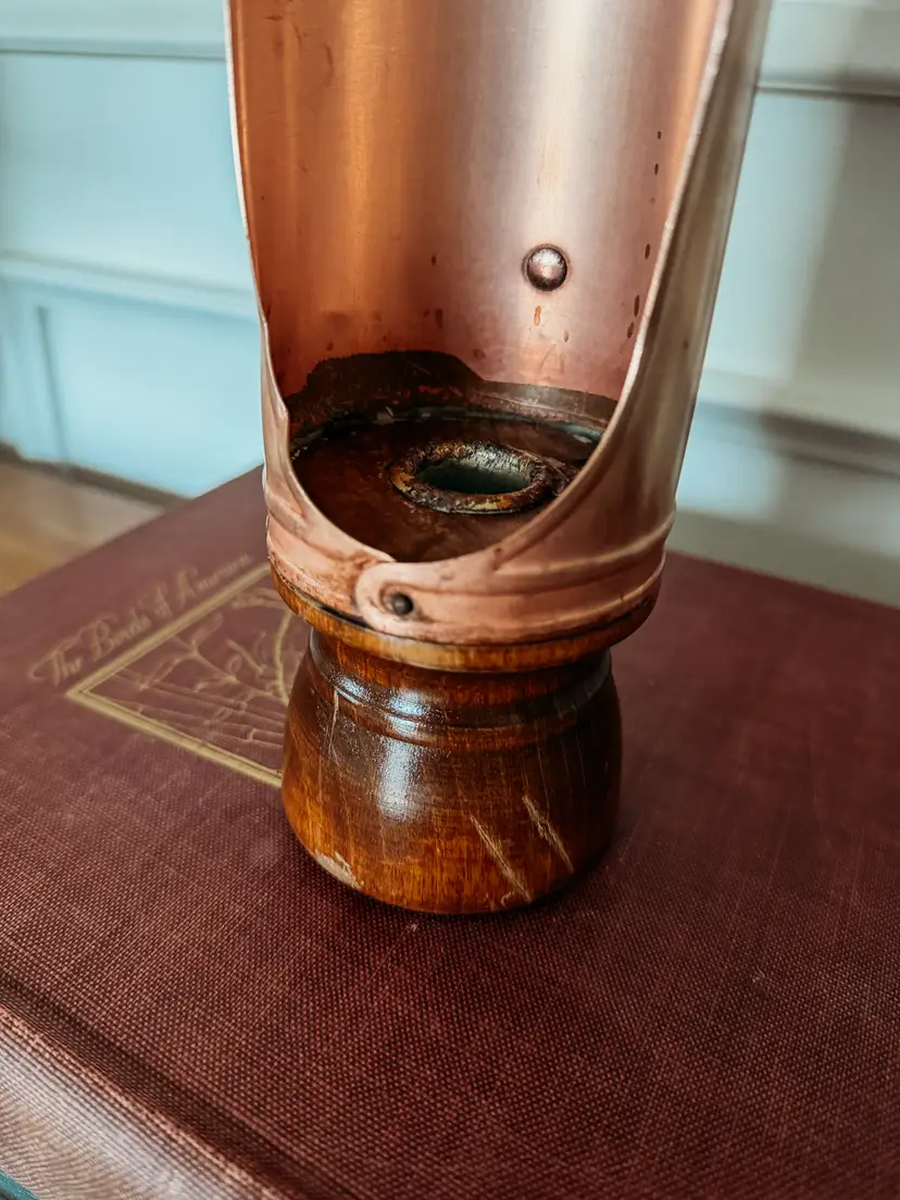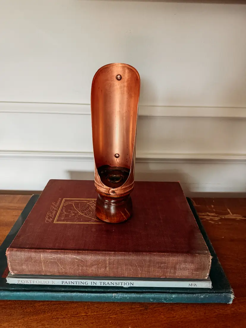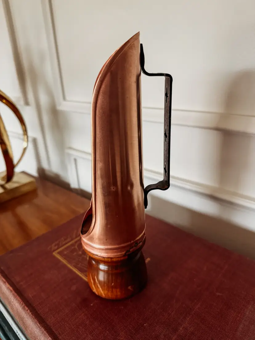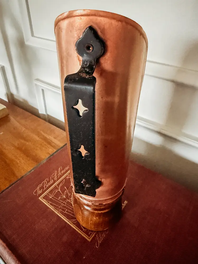 FRESHLY CLEANED AND POLISHED FOR YOU! Vintage 1970s "farmhouse primitive" copper lantern reflector with a wooden base, designed to house a taper candle -The copper reflector is designed to amplify the light from a candle, while the wooden base provides stability, and the black iron handle allows for easy mobility -Candleholder measures 10.5" high by 4" wide wit handle by 3" in diameter