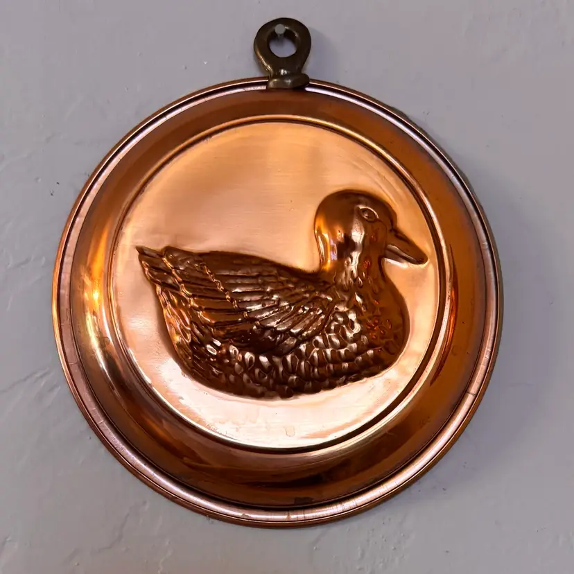 Cute copper mold w/brass hanger 6”diameter Vintage wear & patina as shown