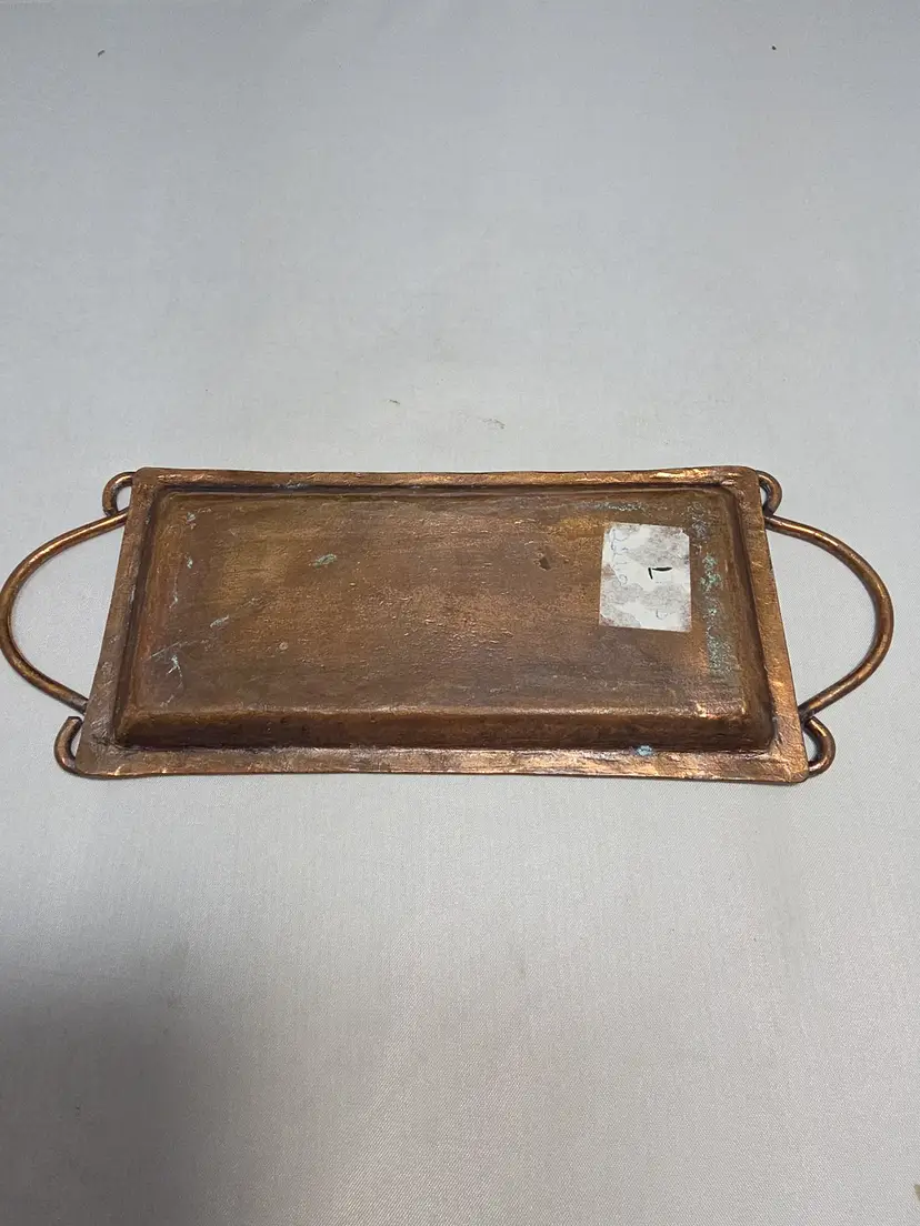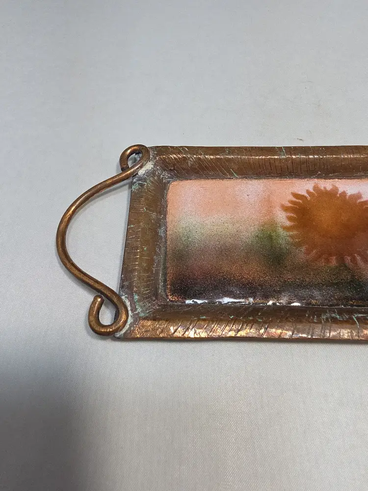 Details Type: Tray / dish Material: Copper with enamel center Design: Sunflower motif Shape: Rectangular with side handles Color: Copper, orange, green Unmarked