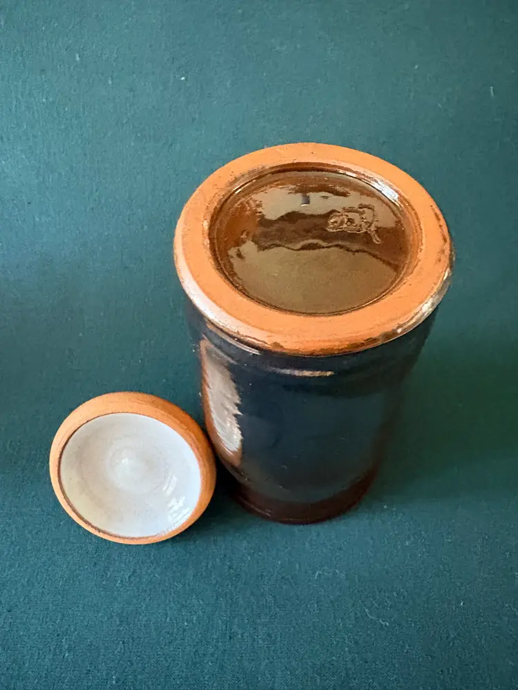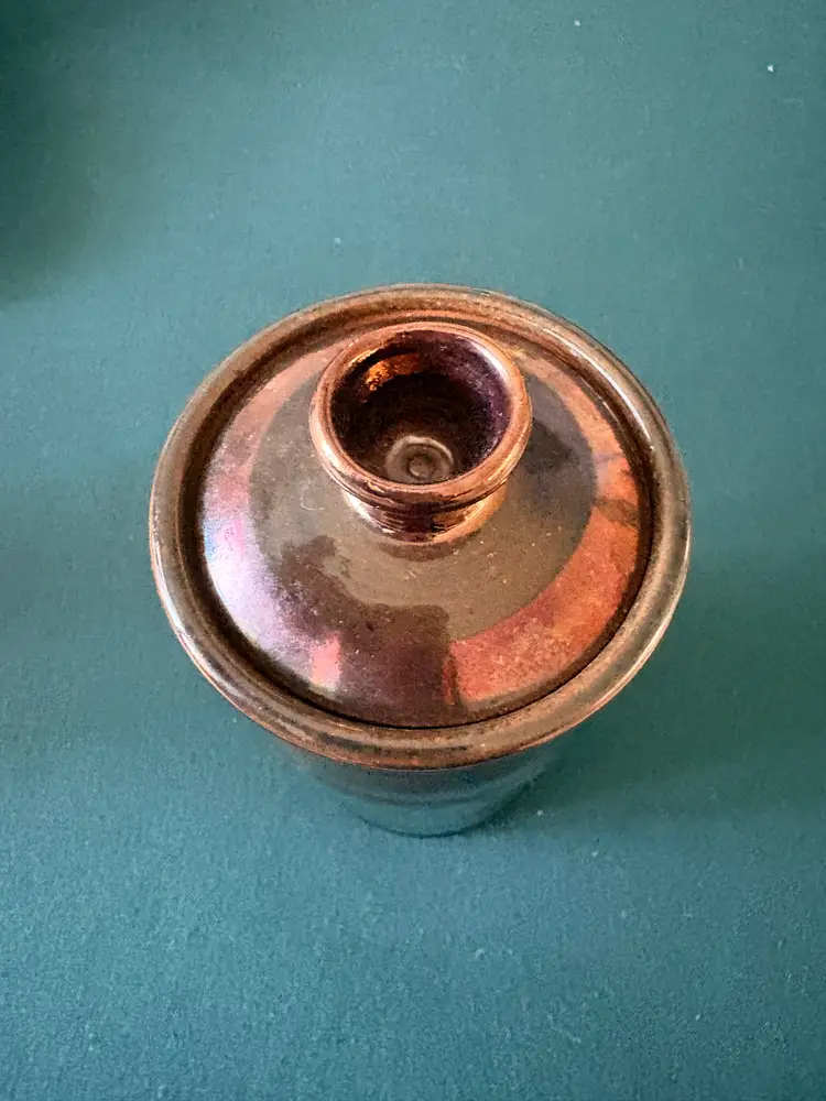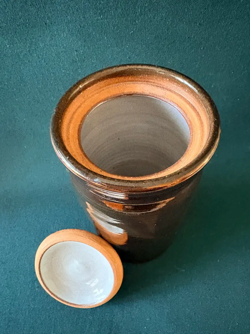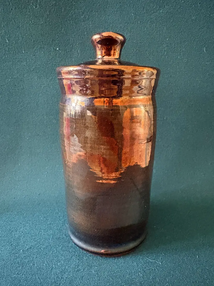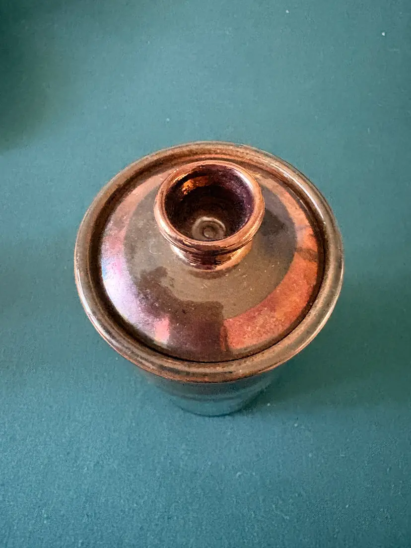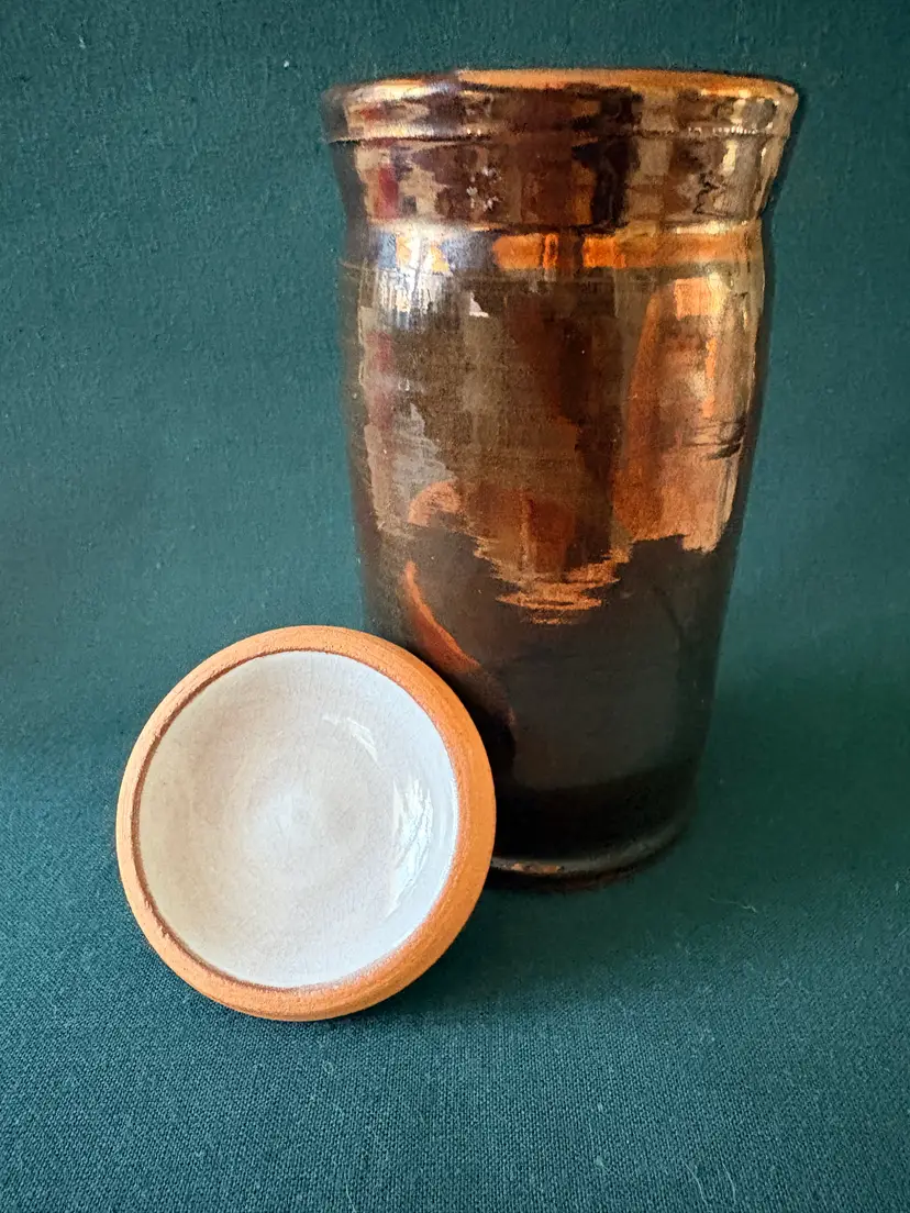 Store your kitchen essentials in style with this vintage copper glazed ceramic canister. Its warm tones and classic design make it a perfect addition to any countertop.