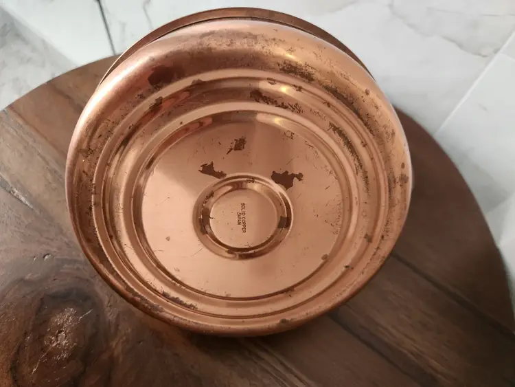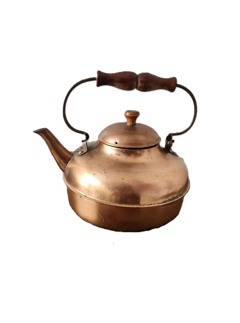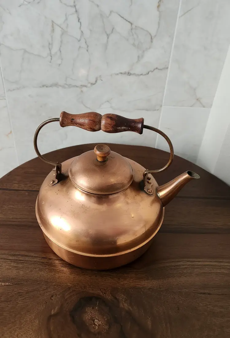This copper kettle has dings, bumps, and bruises. These imperfections just make it look even better. This will make a wonderful decor piece for someone.