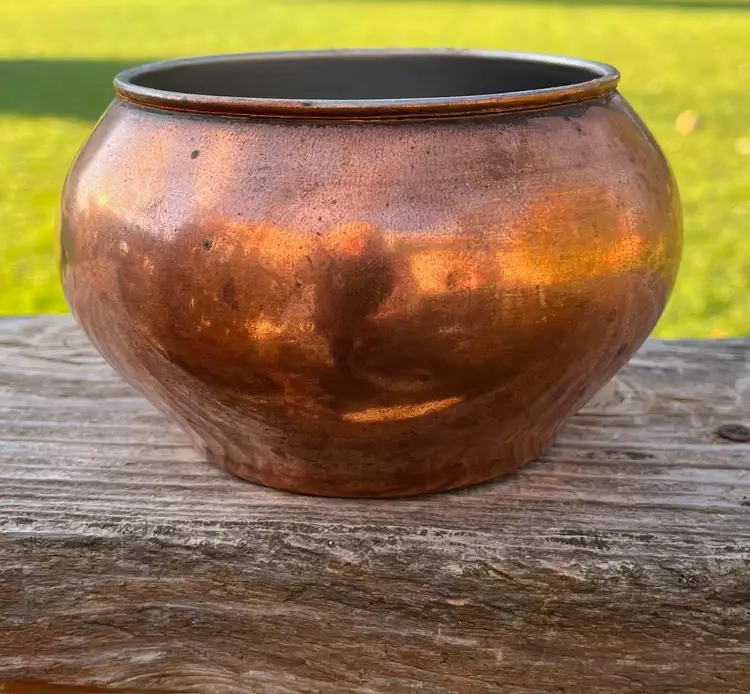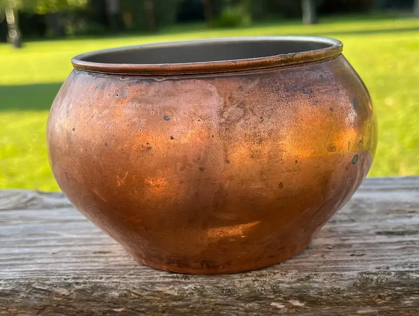 A Vintage Copper Pot. Approximately 3 1/2" Tall and 5 1/4" Wide. The inside of the pot has a different metal liner. It has dings as seen in the photos. Great patina!