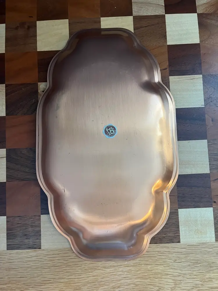 This particular tray, with its scalloped edge and polished copper finish, exemplifies the style of decorative metalware that was fashionable during the mid-century. Such pieces were commonly used as serving trays, vanity dishes, or decorative accents in homes. While not typically considered fine art, these items hold collectible value due to their craftsmanship and nostalgic appeal.