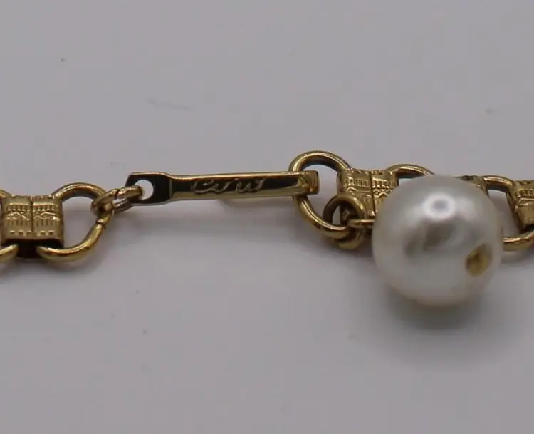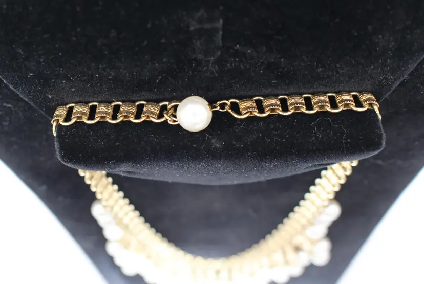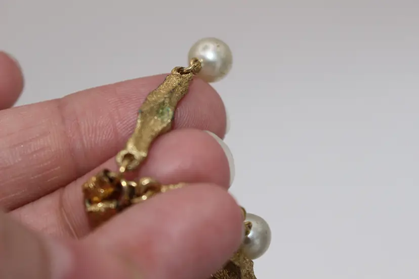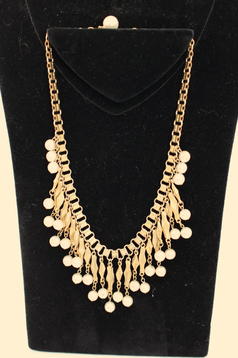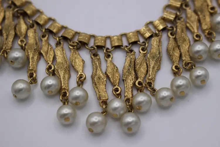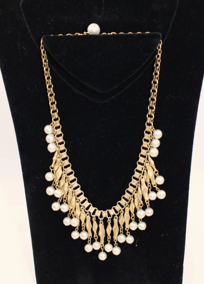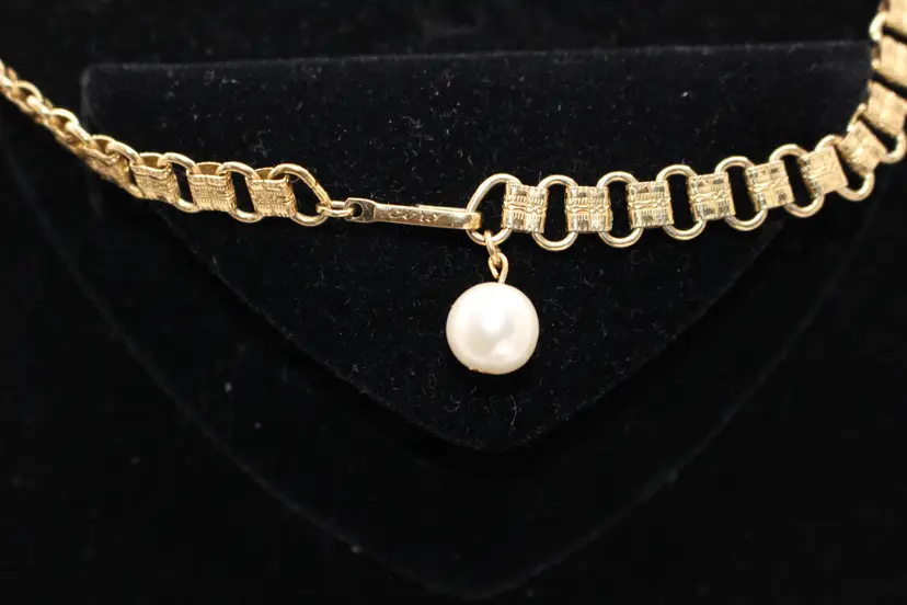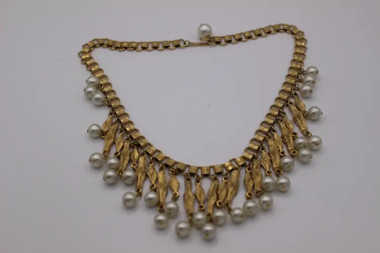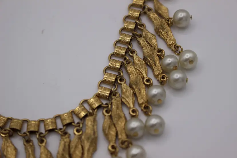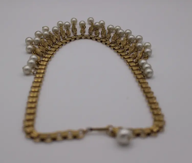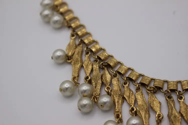 Charming vintage gold tone Victorian style necklace featuring elegant faux pearl dangles. Perfect for adding a touch of vintage glamour to any outfit. Intricate design and detail on every link of the bookchain necklace. Some Verdigris on 3-5 dangles. I have not attempted to remove.