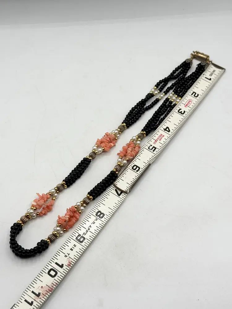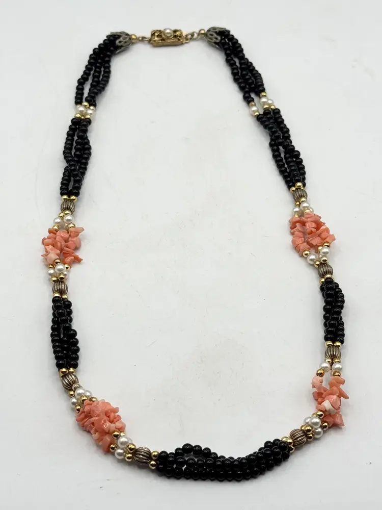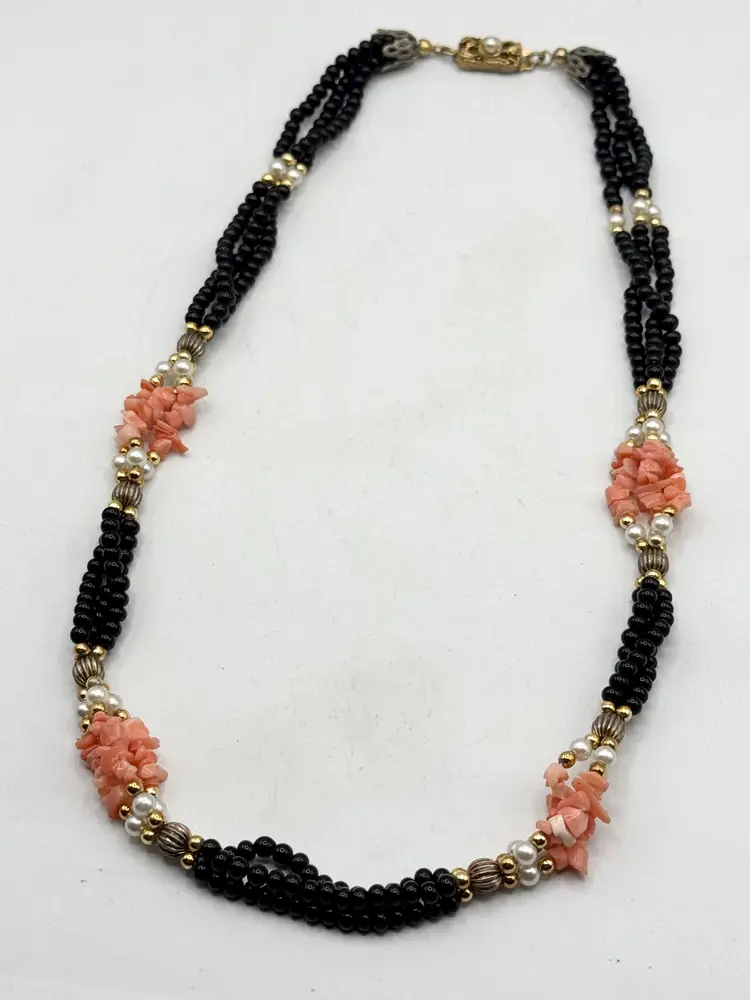 Vintage coral pearl onyx beaded multi strand necklace. Multi strands of onyx faux pearl and coral beads. Coral chips. Box closure. Vintage necklace. MN56H.