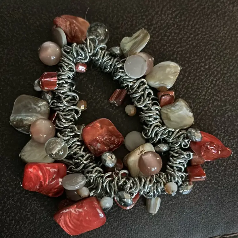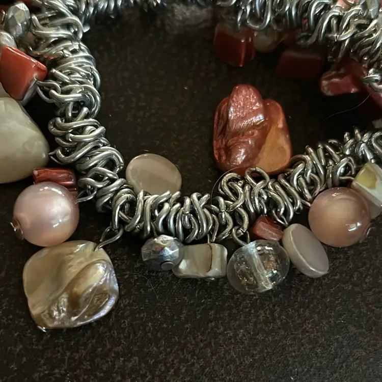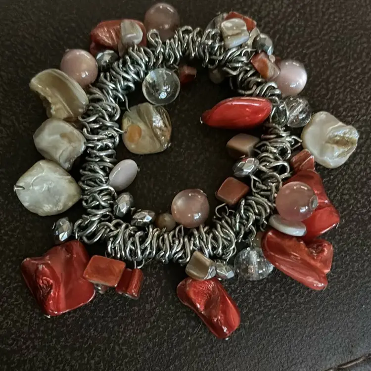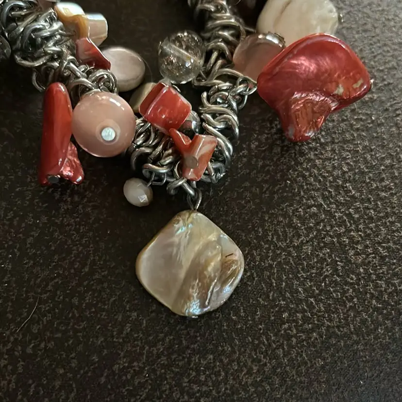 Vintage Coral Stretch Bracelet with shell, glass beads, metallic beads all hanging on chain/stretch bracelet. Measures 4” diameter and weighs 3.8 oz. Fun substantial piece.