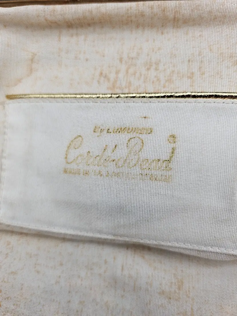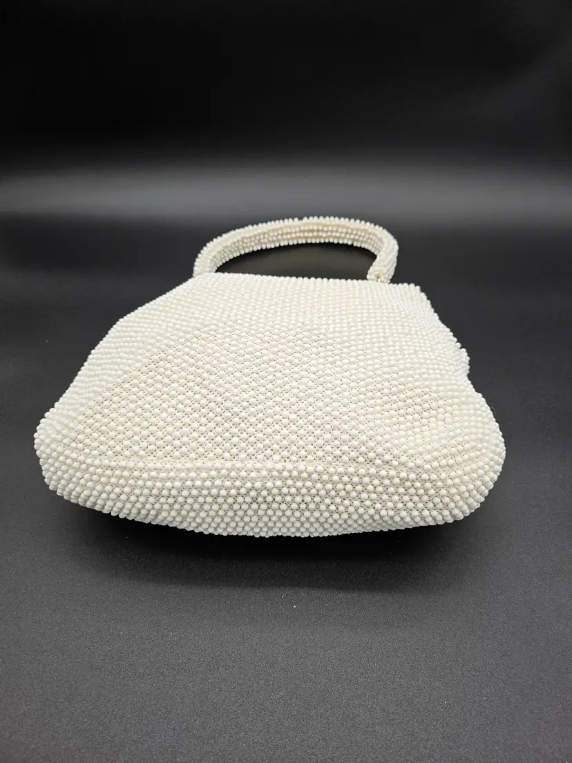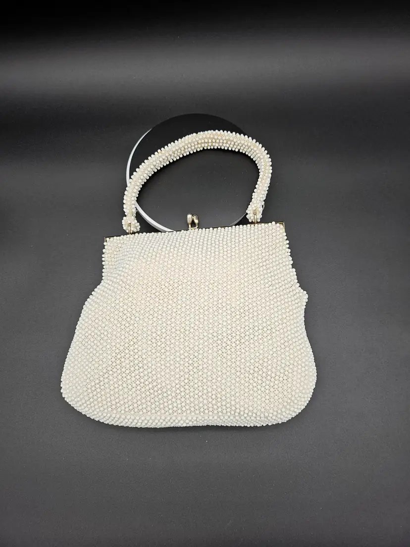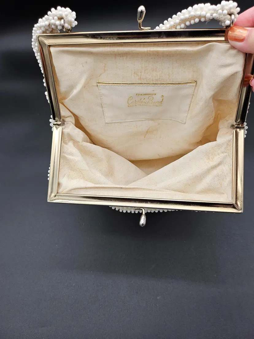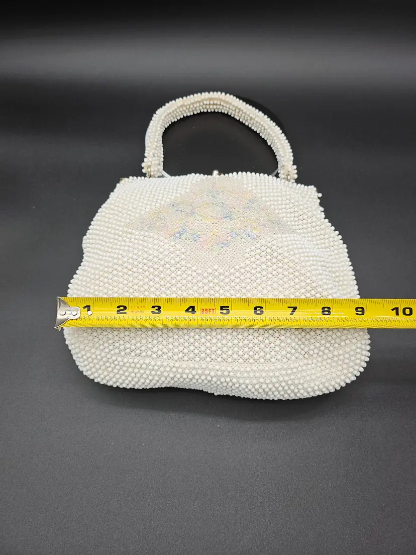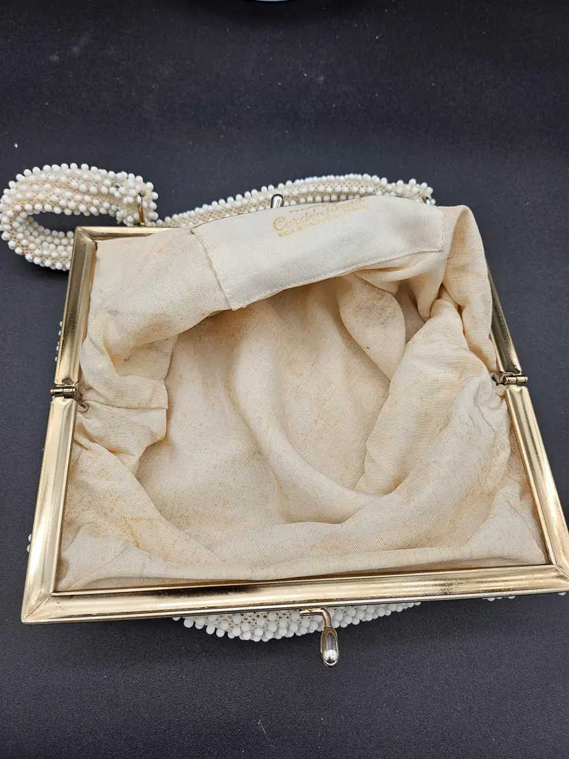 The interior is lined with beige material and has a pocket for added convenience. The bag is perfect for those who appreciate vintage style and made in the USA accessories. It is a must-have for women who want to add a unique touch to their collection.