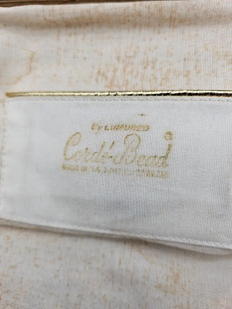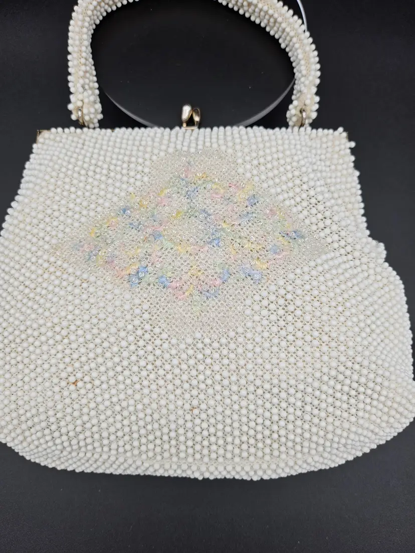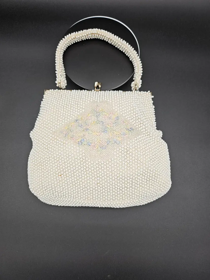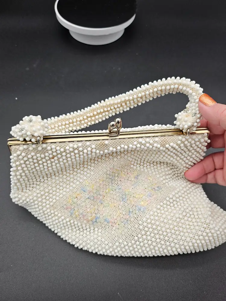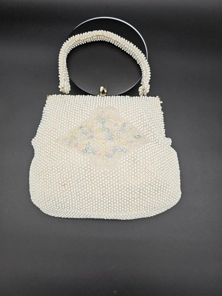 This vintage Corde beaded bag from the 1950s features a beautiful cream floral pattern with kiss lock and snap closures. The top handle is made of beaded material in a creamy color, complemented by gold hardware. The bag is medium-sized and has a beaded strap.