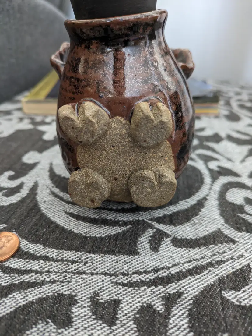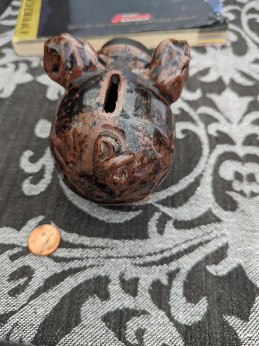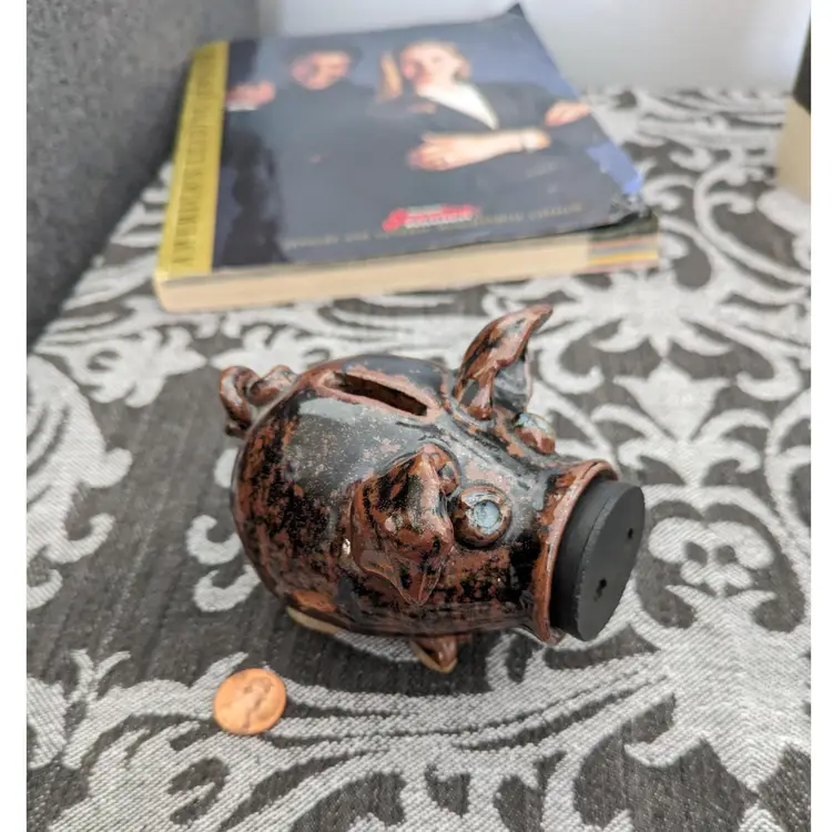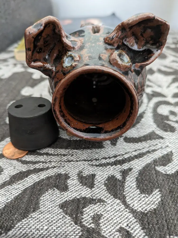This functional piggy bank with rubber stopper snout boasts is a unique glazed pottery art collectible.