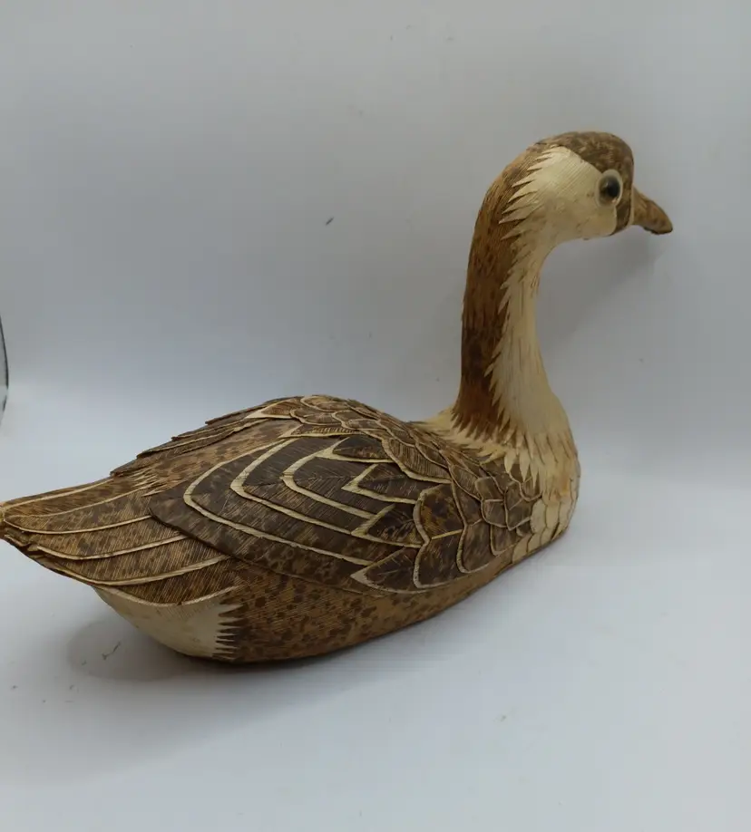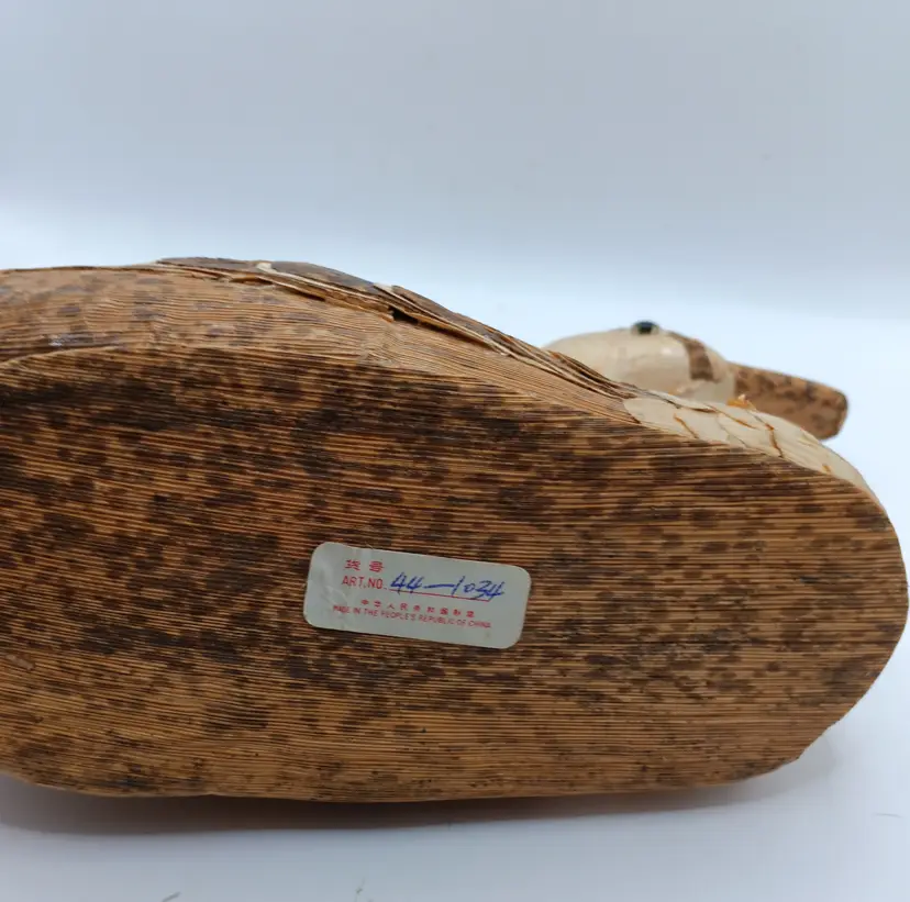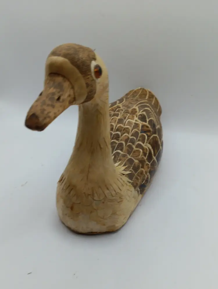 Vintage folk art corn husk and wood duck decoy, likely from the mid-20th century. Crafted in the People's Republic of China. Originally used for hunting to attract ducks, they can be used for decoration or item as a collector's piece. Measures 9" long and 6" high. Check out the intricate details!