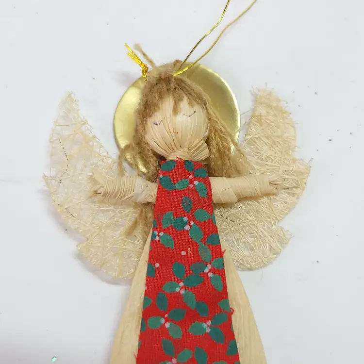 Very good pre-owned condition corn husk angel Christmas ornament Vintage Hand crafted Made with dried corn husk and straw material Fabric and poster board accents Hanging loop included Measures approximately 6.5" tall