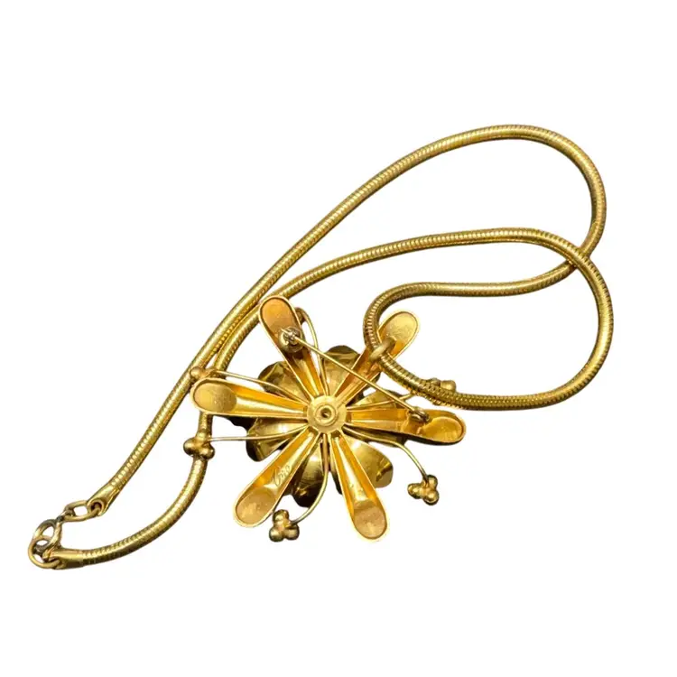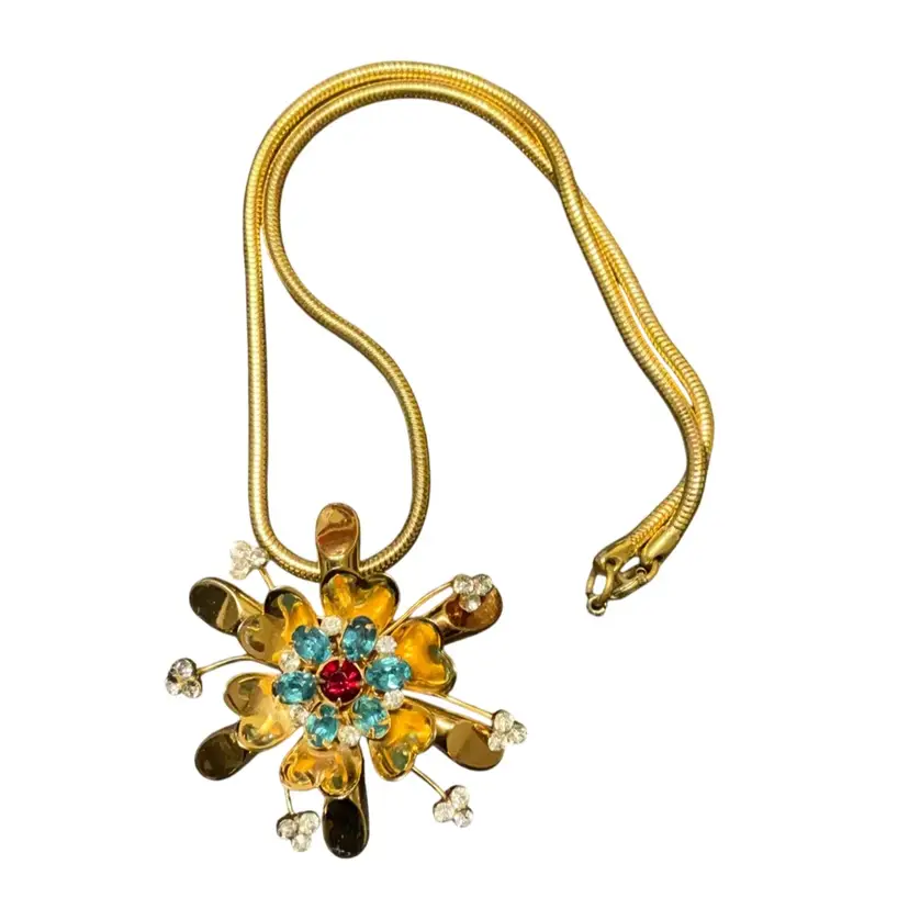 Chain measures 8.5”. Brooch is gold tone and in shape of flower with red rhinestone in center with 6 blue rhinestones and 6 AB rhinestones as well. Each starburst has 3 A B rhinestones. You are able to wear this brooch also as a pendant.