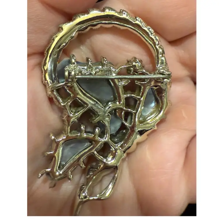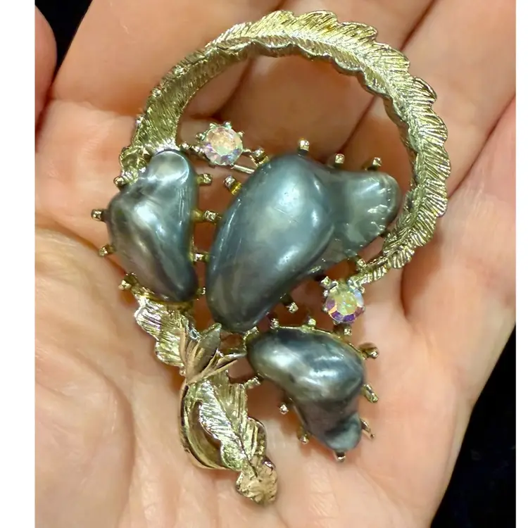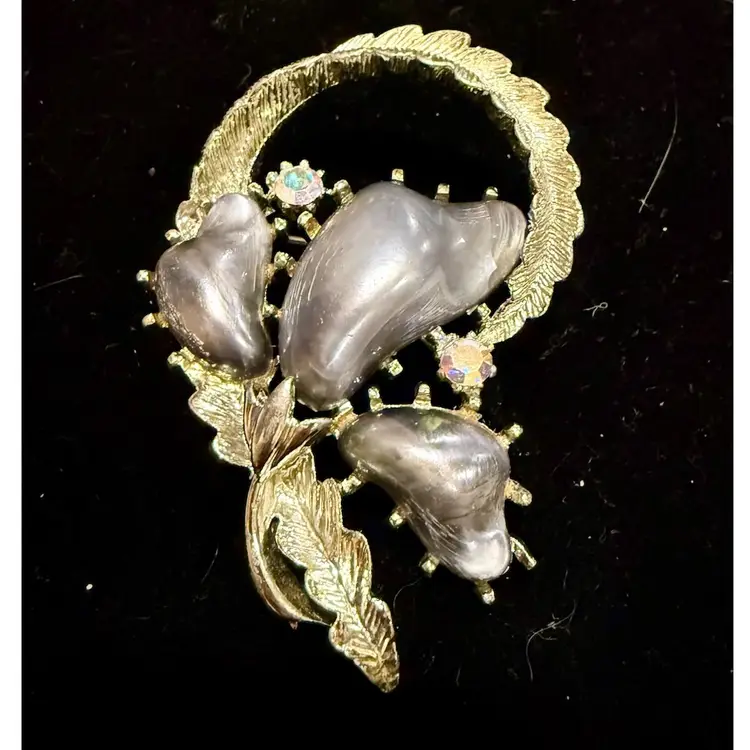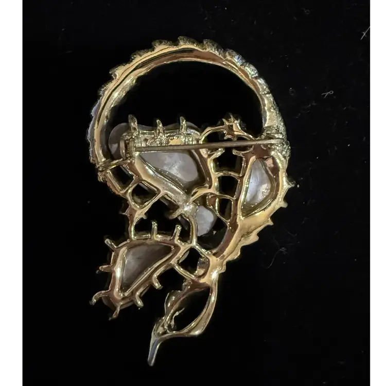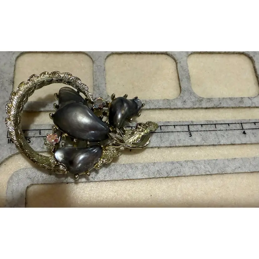 Elevate your jewelry collection with the vintage charm of this Coro abstract brooch pin. The piece features an asymmetrical design, setting it apart as a unique accessory. It's crafted with a mix of metal, acrylic, and faux pearl materials, offering a blend of durability and elegance. The brooch exhibits a gold-tone finish that complements the gray acrylic faux stones, creating a sophisticated contrast. Measuring at 2.5 inches in length, it's the perfect size to make a statement without overwhelming your outfit. 0225