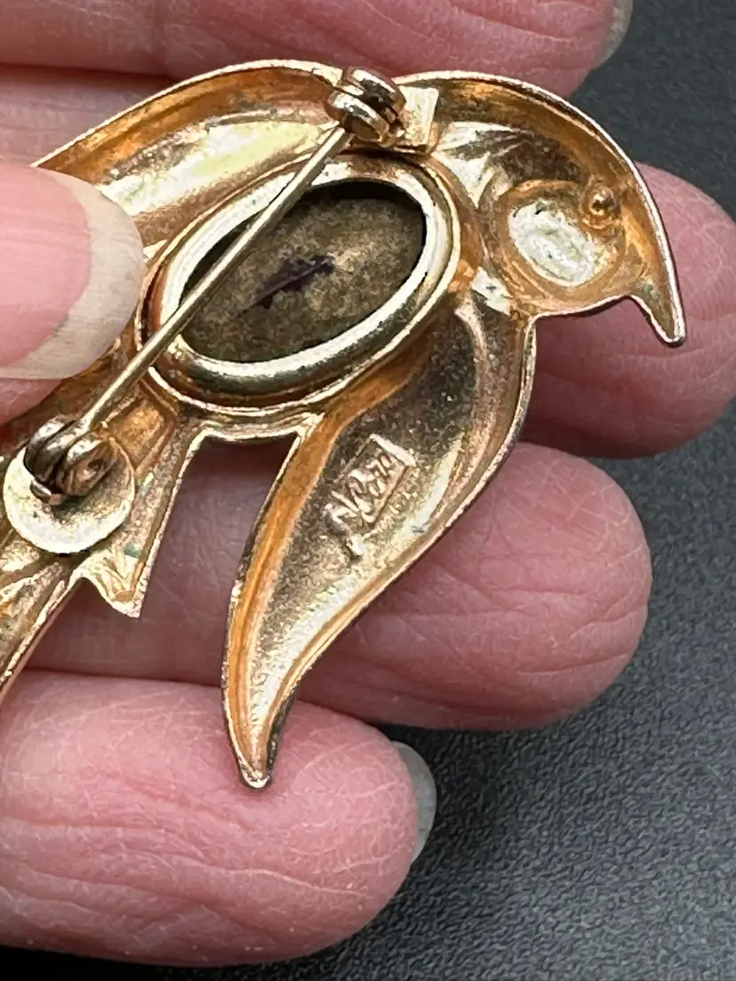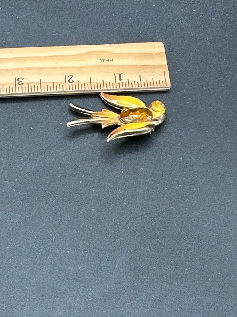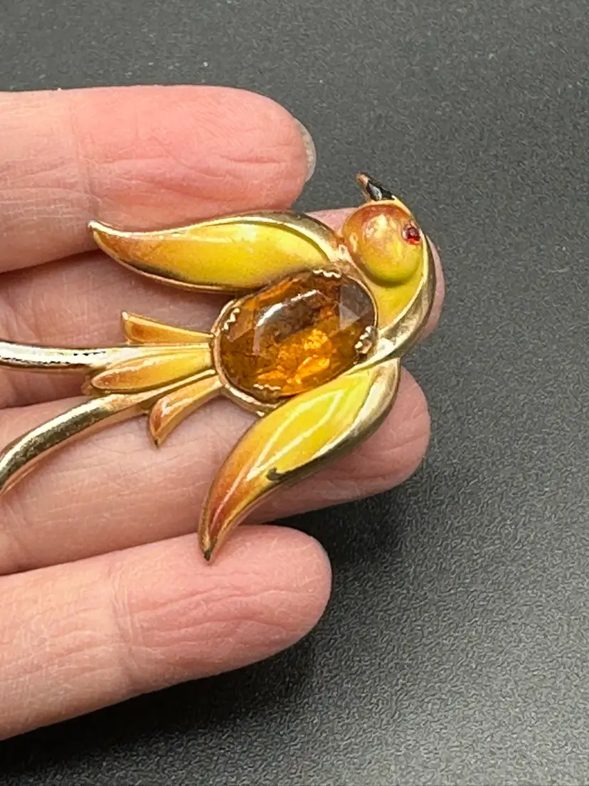 Vintage CORO Amber Rhinestone Belly Flying Bird Gold Tone Pin Brooch