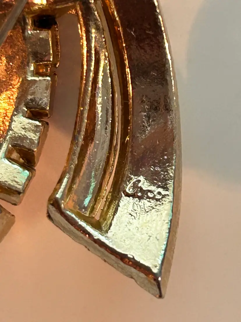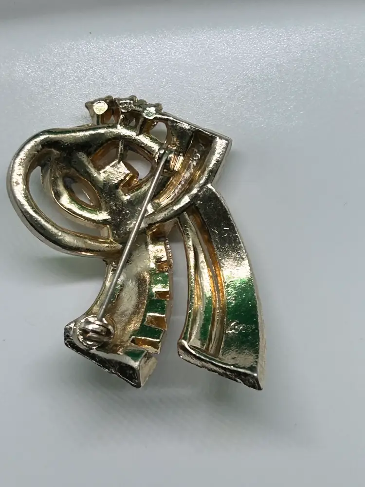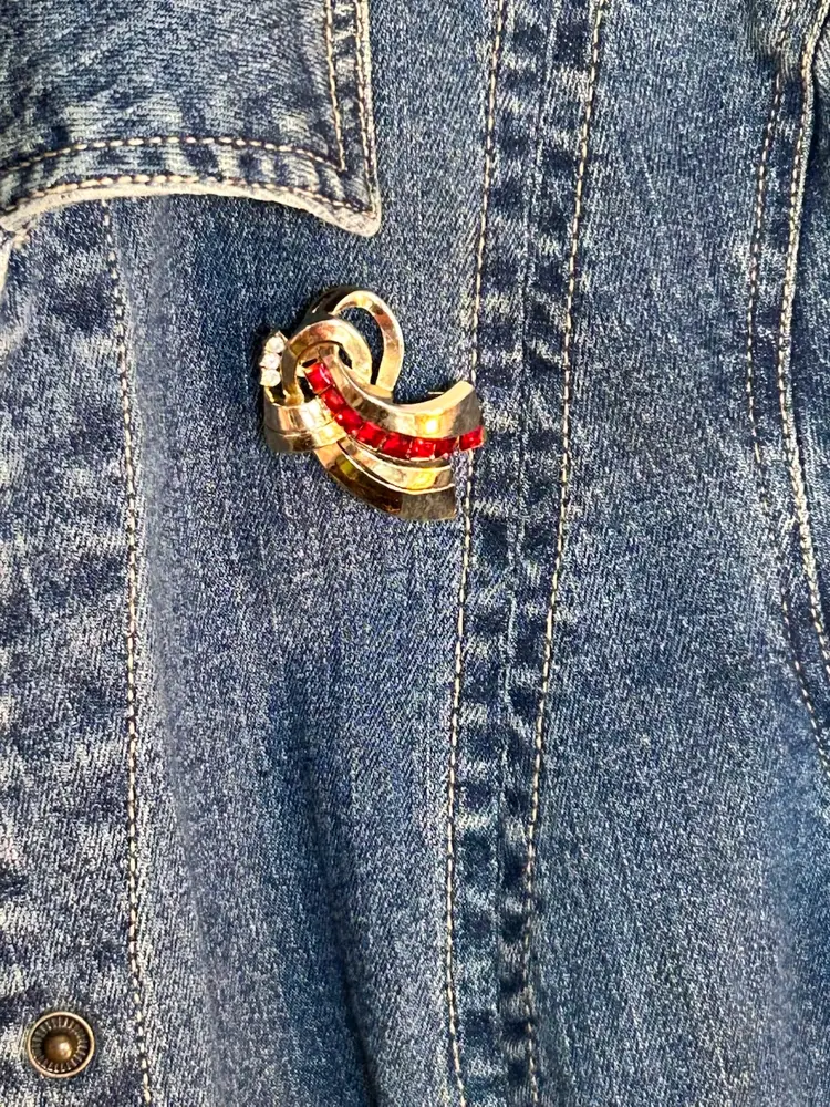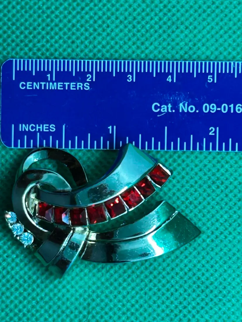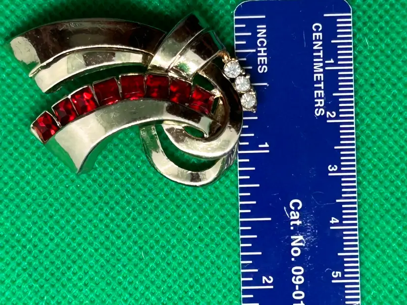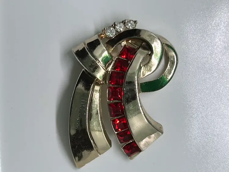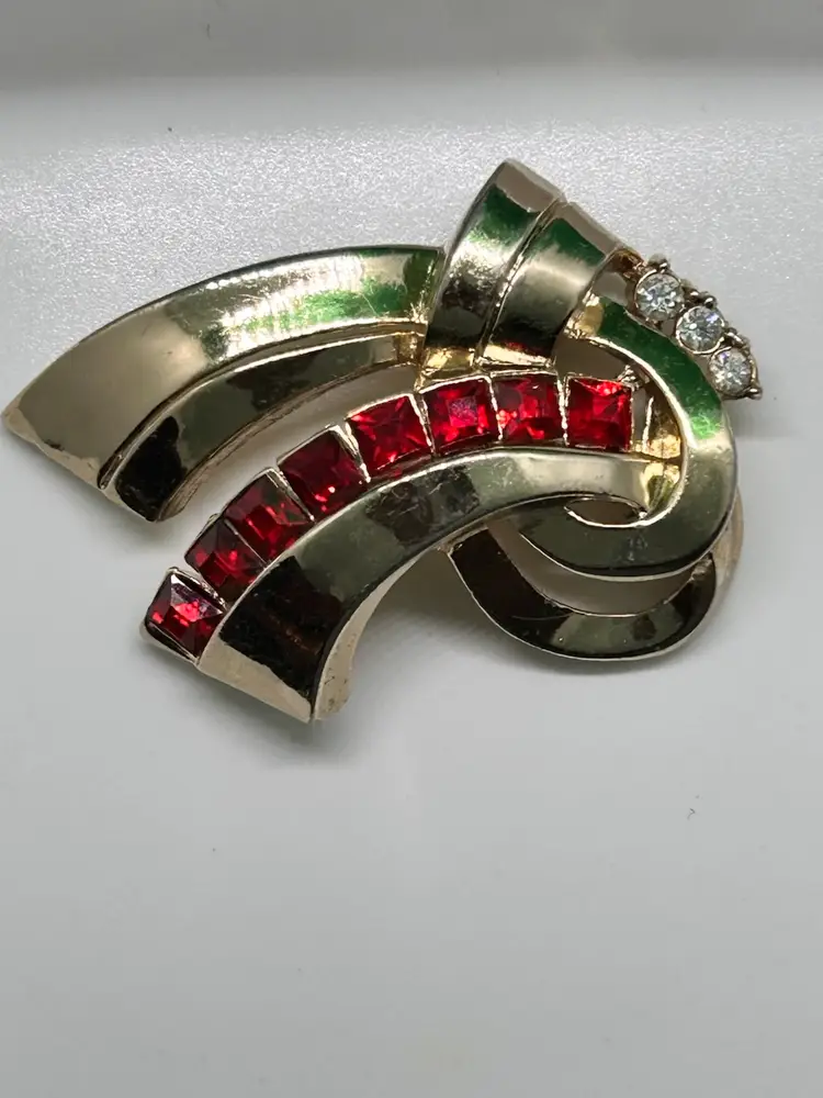 Coro gold tone with red and clear rhinestones and ribbon motif give off that art deco vibe. In excellent vintage condition. Please see photos as they are part of the description.Thank you for looking!