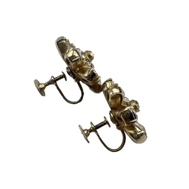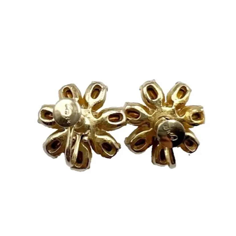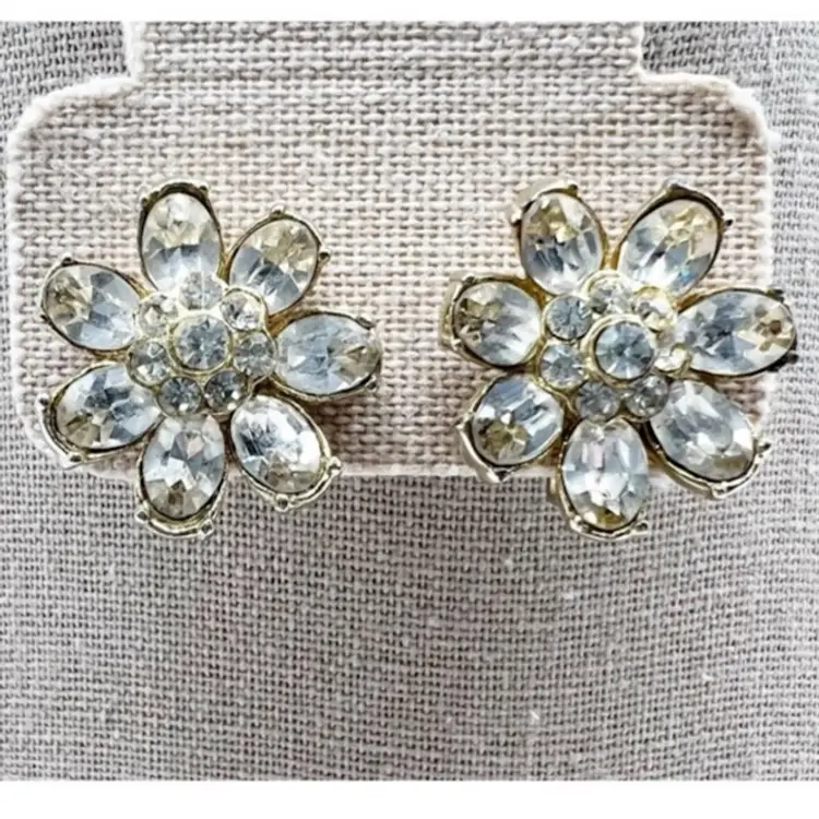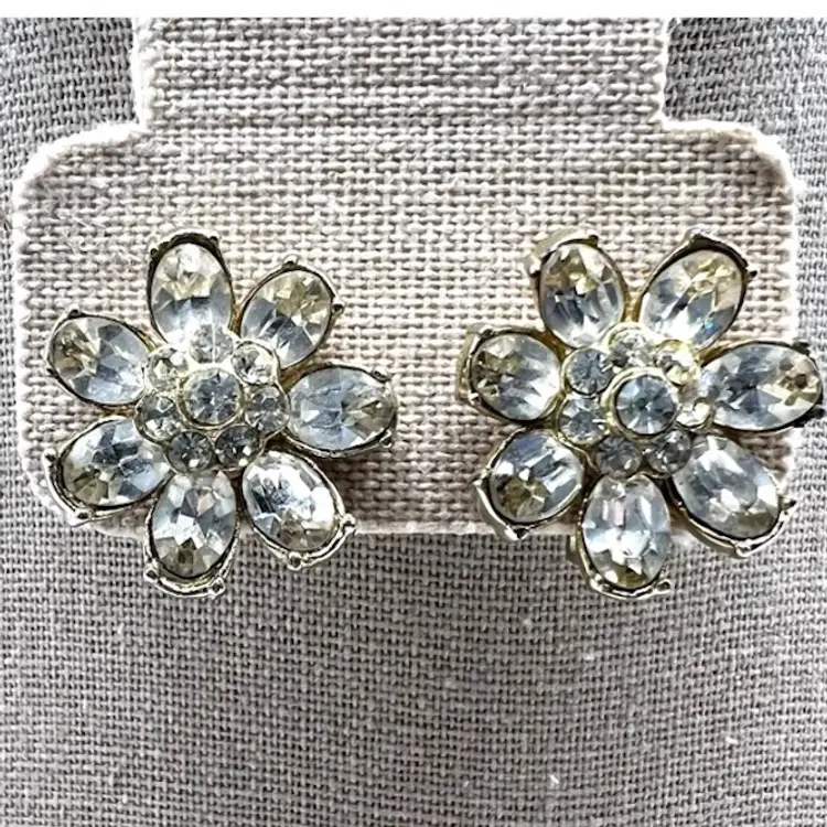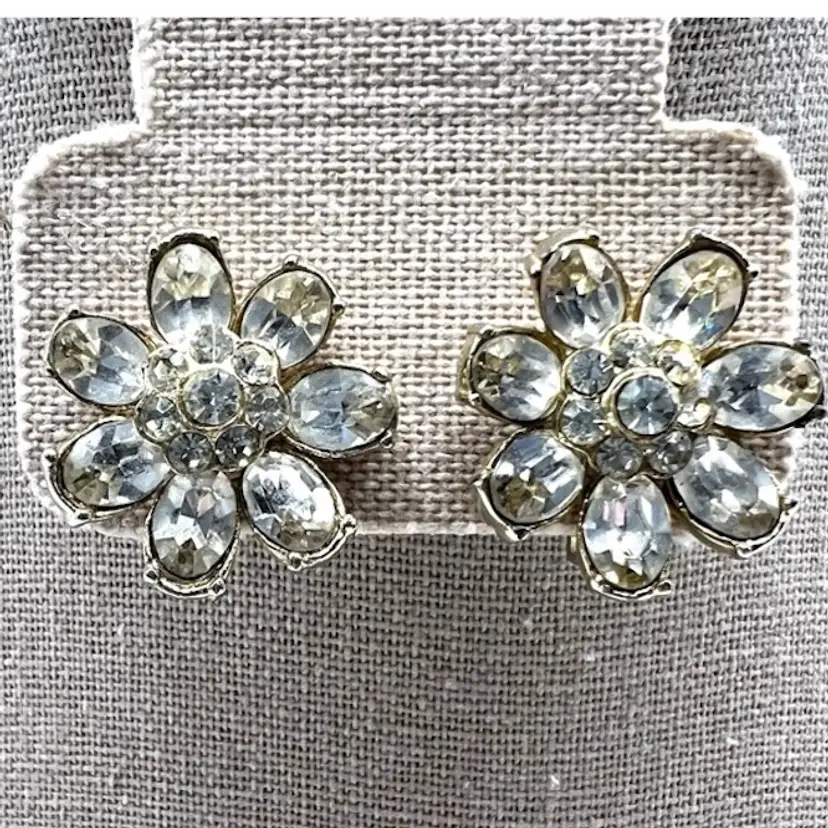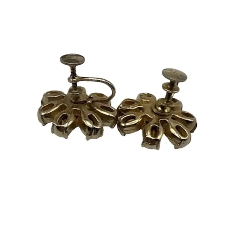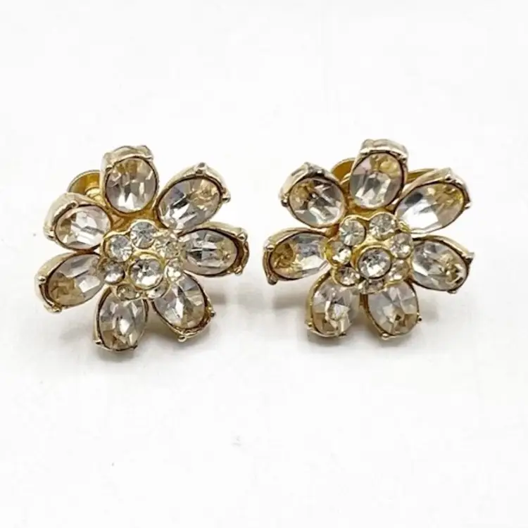 Vintage CORO Clear Rhinestone Flower Screwback Earrings Gold Tone Floral Signed