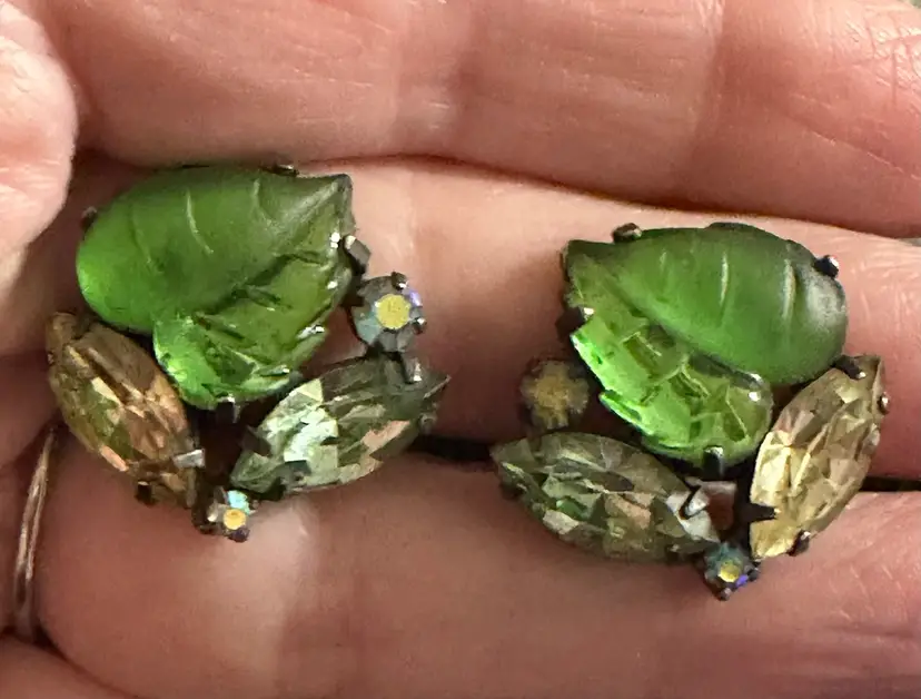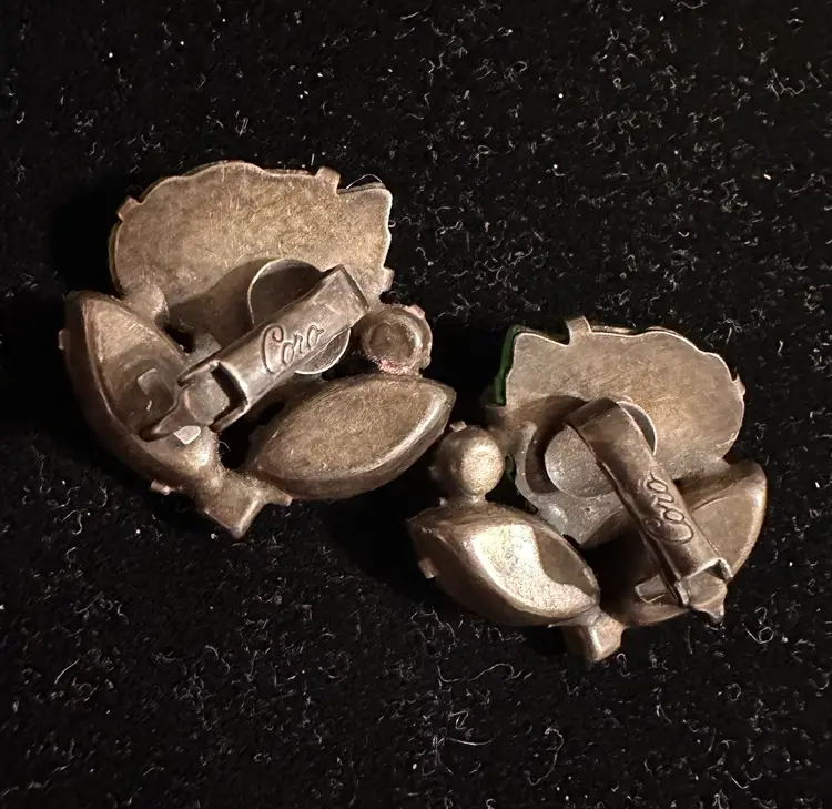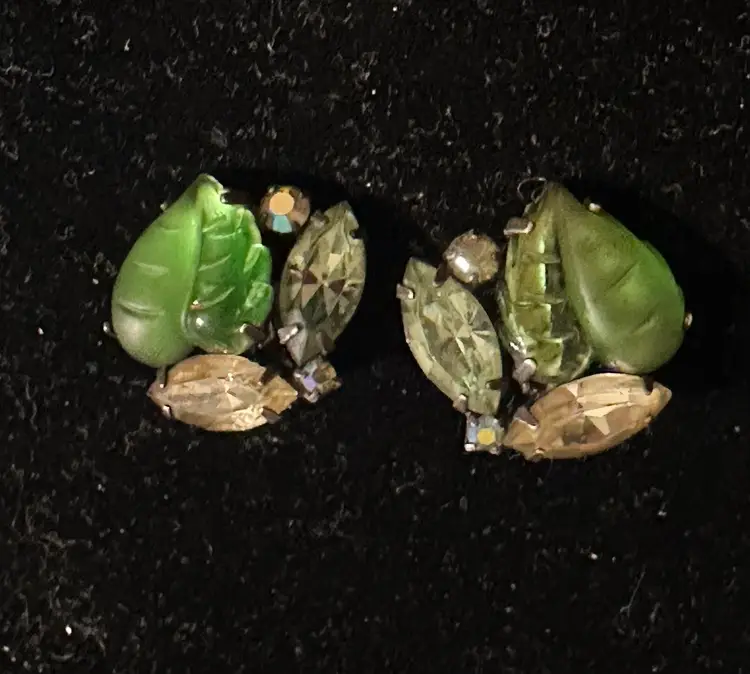 Pretty pair of vintage Coro clip on earrings. They are set with rhinestones and molded glass. The measure 1”. They are in good condition.
