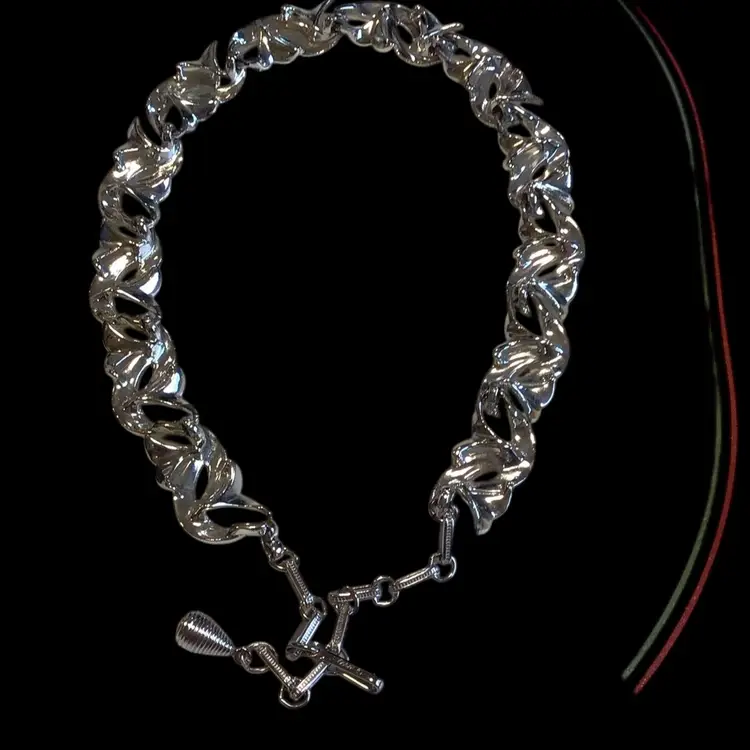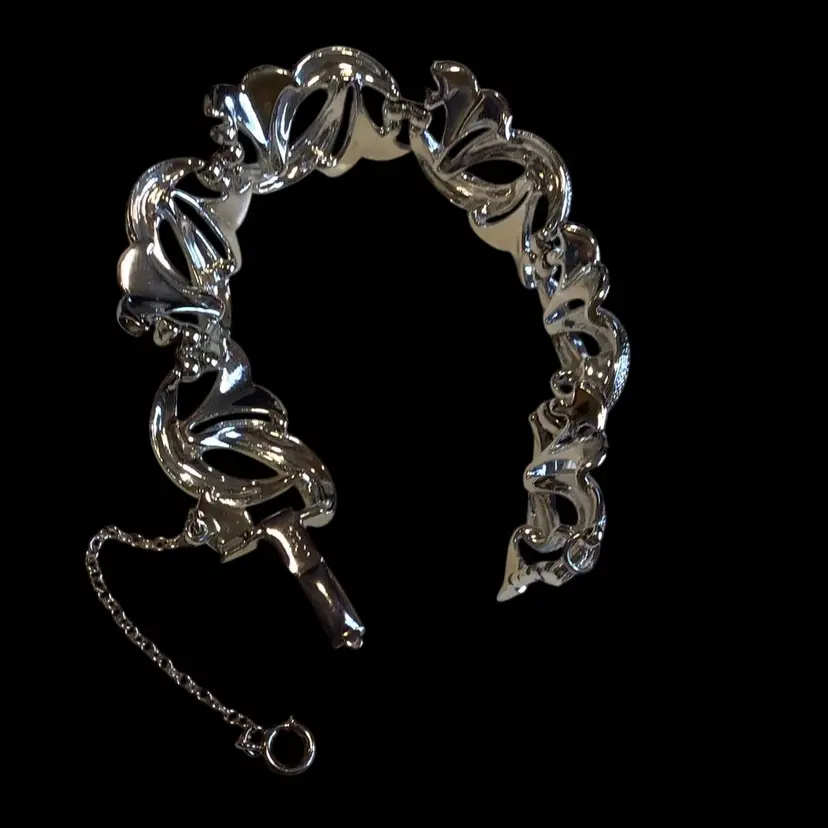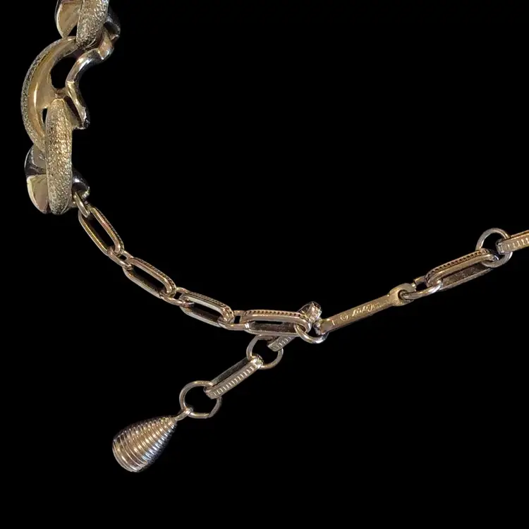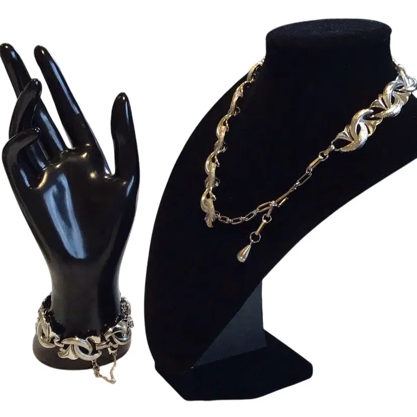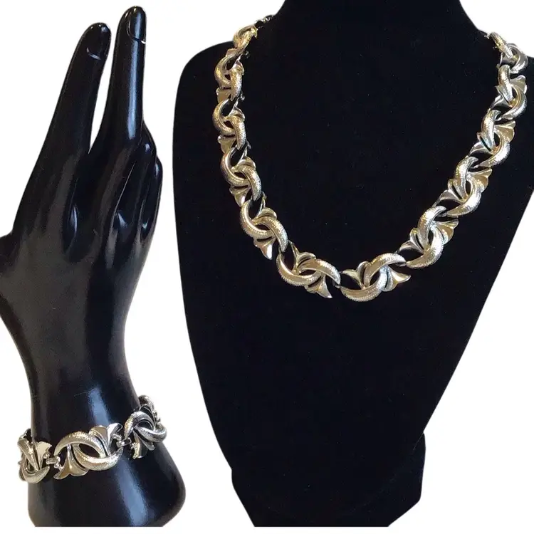 Silver tone bracelet (7”)& necklace (16-1/2”) swirl crescent textured & polished add dimension, bracelet has detachable safety chain, unworn condition. #459
