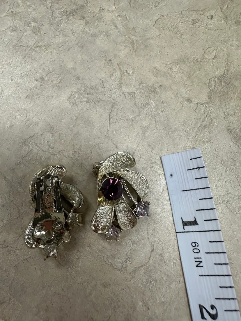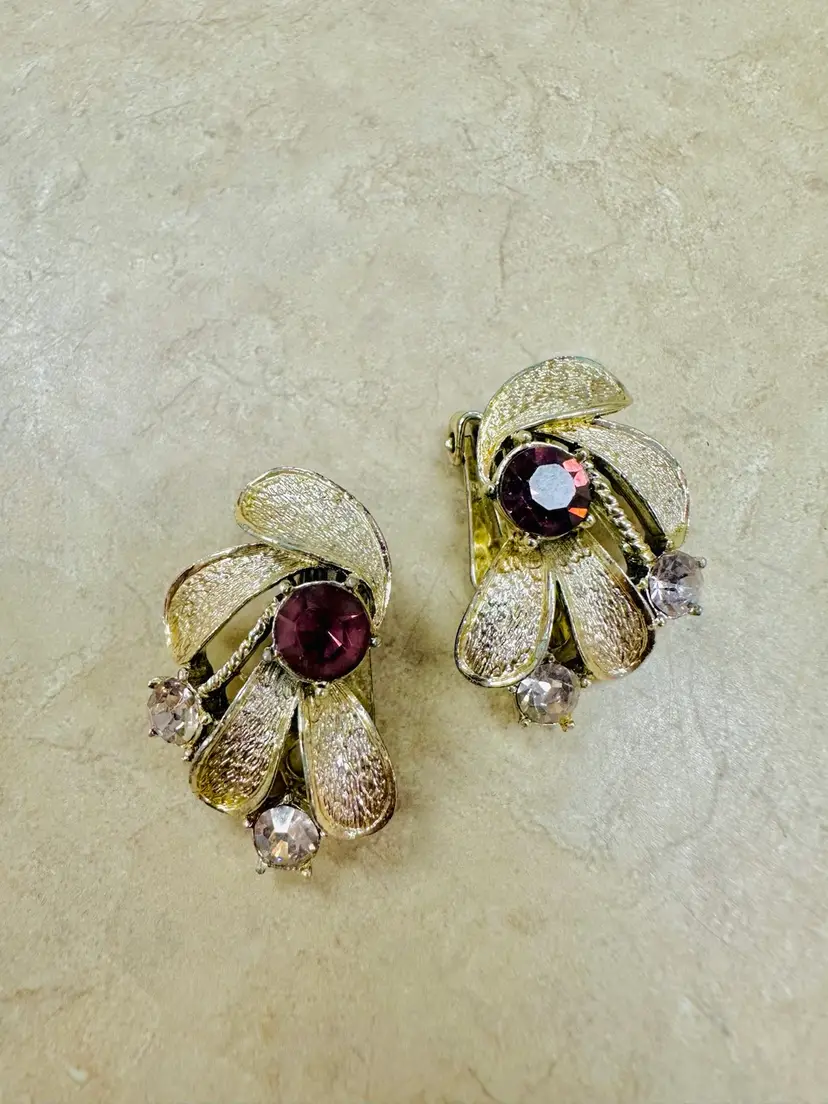 Textured gold tone clip on abstract floral design earrings with lavender and clear rhinestones. In excellent condition.