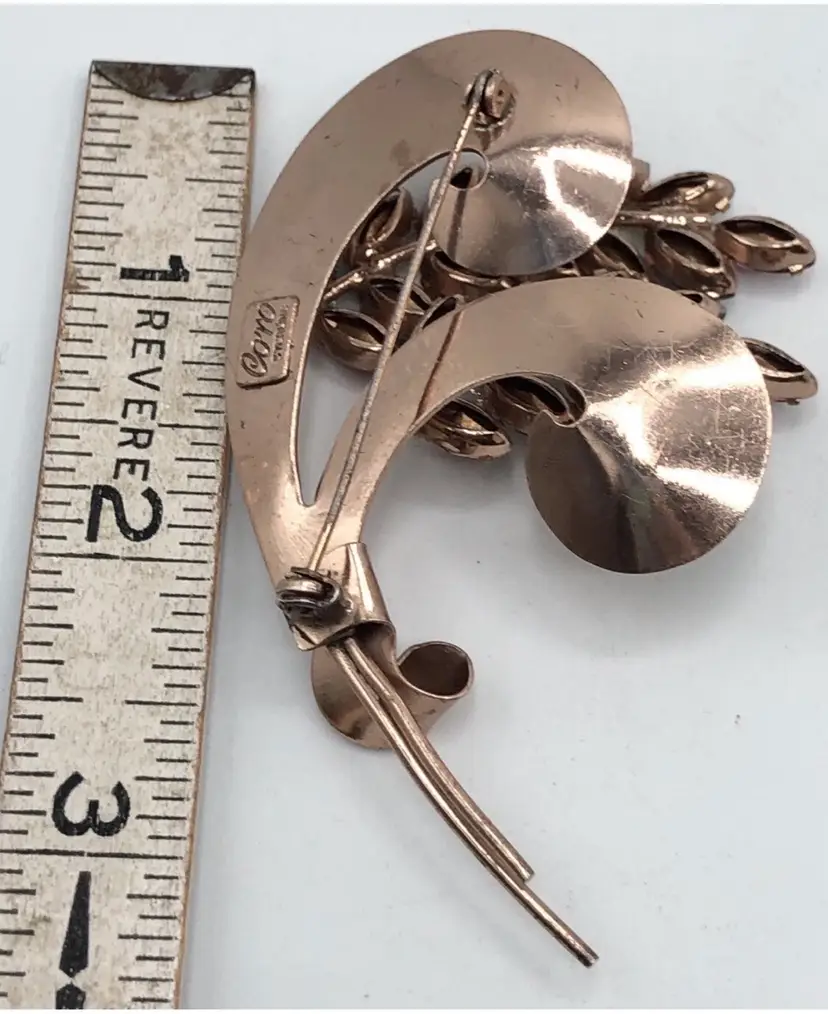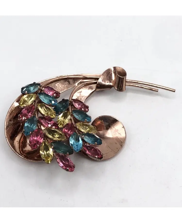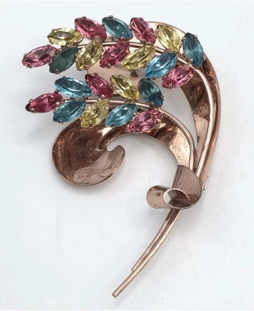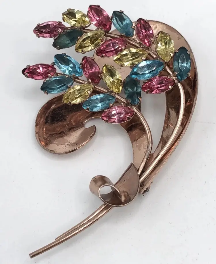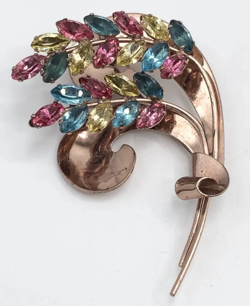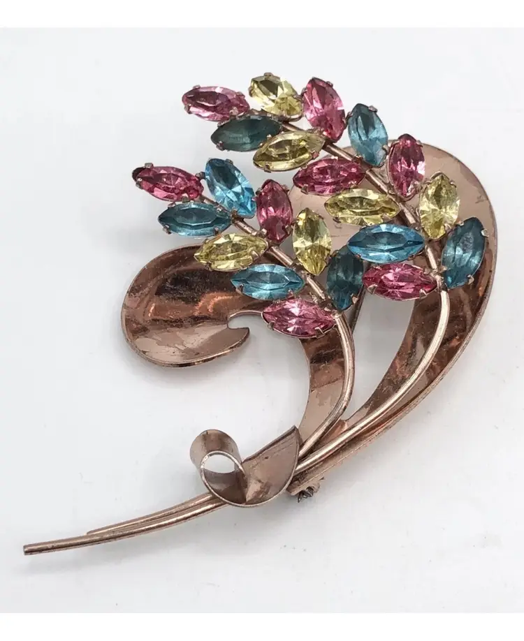 Vintage Coro Sterling Rose Gold Multi Color Rhinestone Floral Spray Brooch Pin. Signed on back coro sterling. Rose gold vermeil with multi colored glass stones pastel colored rhinestones. AD29.
