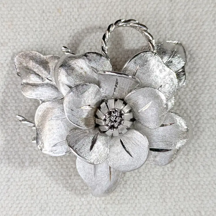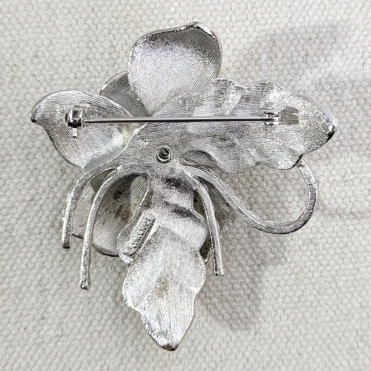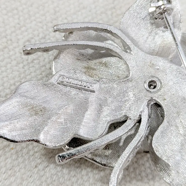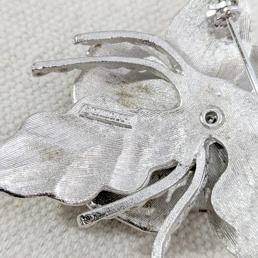 Eye-catching dimensional blooming flower brooch. Textured silver tone petals with botanically realistic pistil in center of flower. Signed Corocraft. A few spots of tarnish on a couple of the petals.