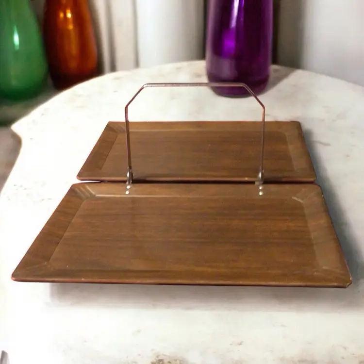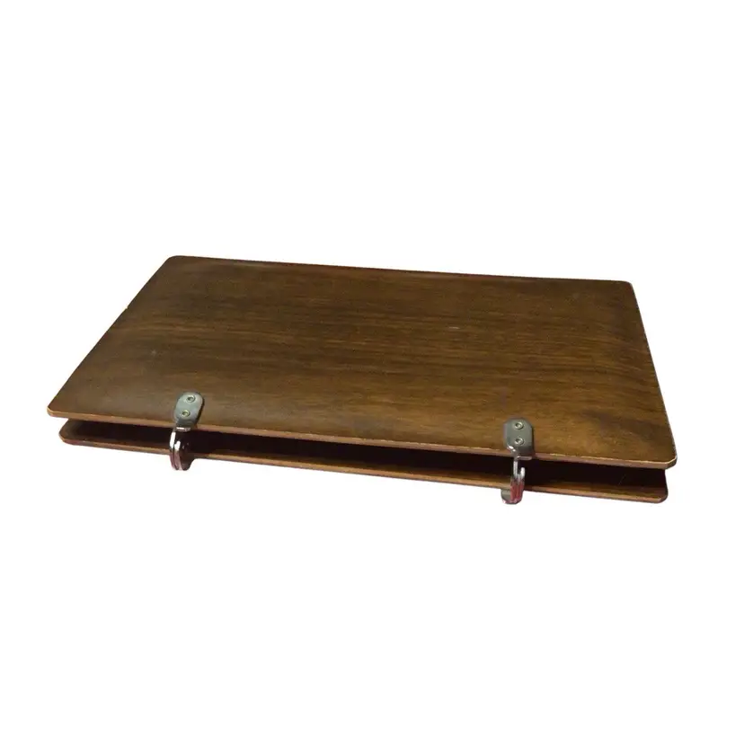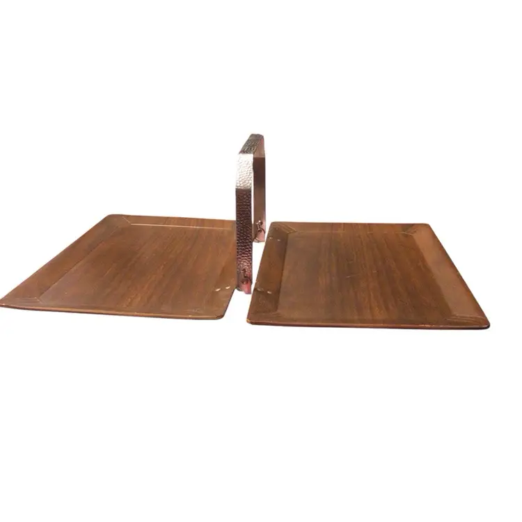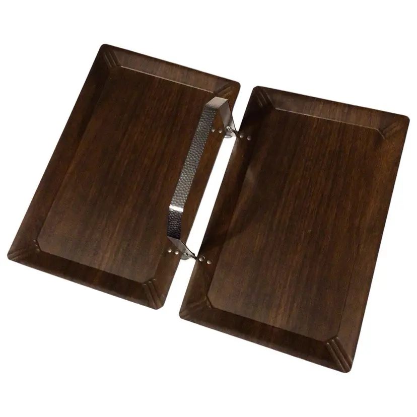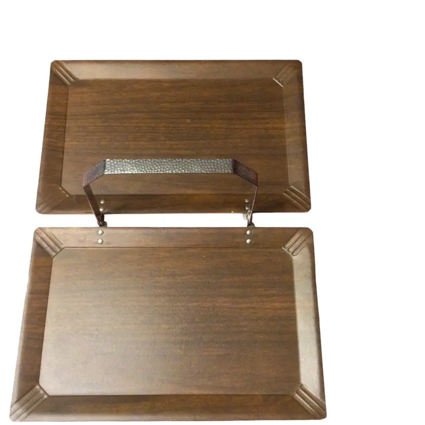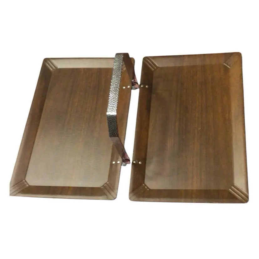 Folding Coronet brand wood or wood laminate hospitality tea tray with hammered aluminum handle.